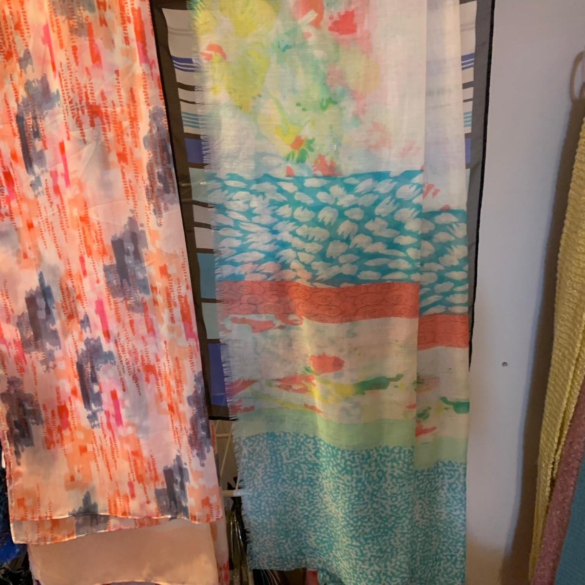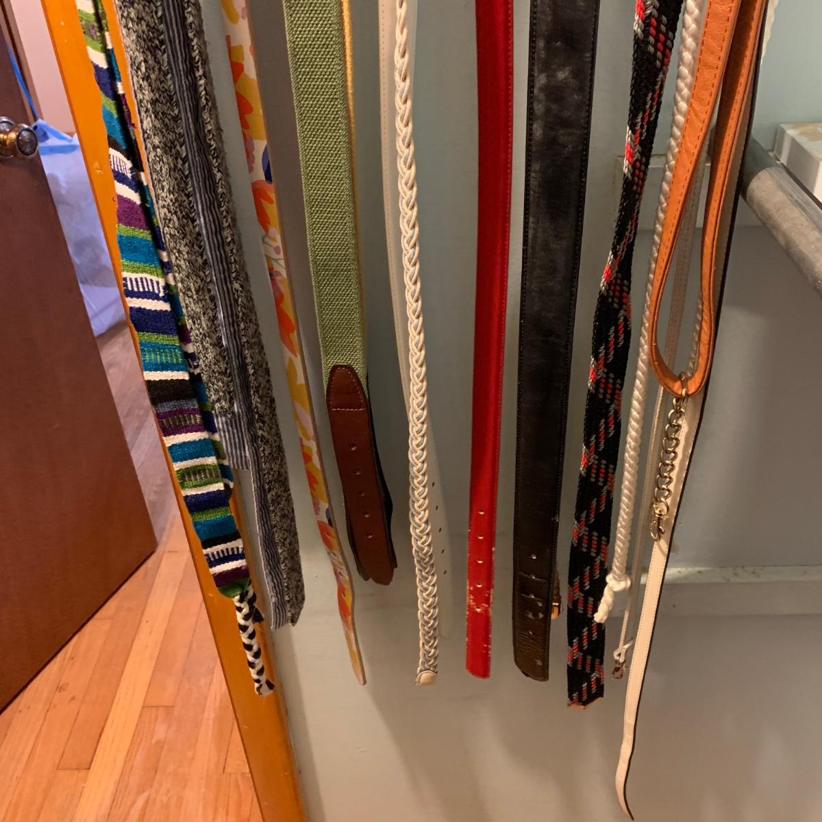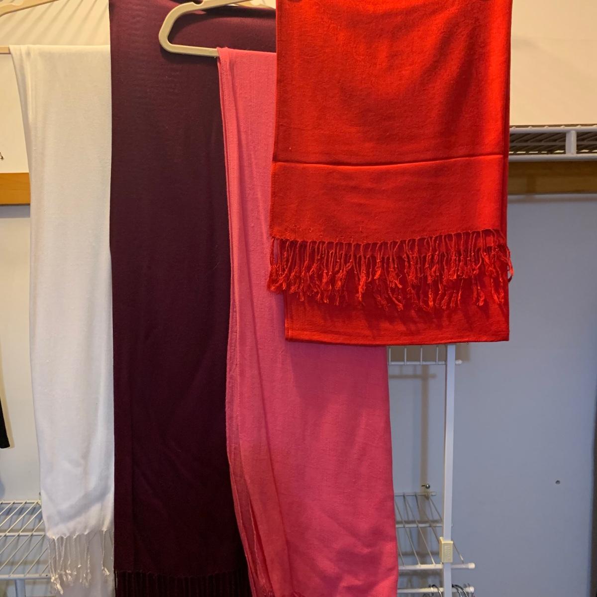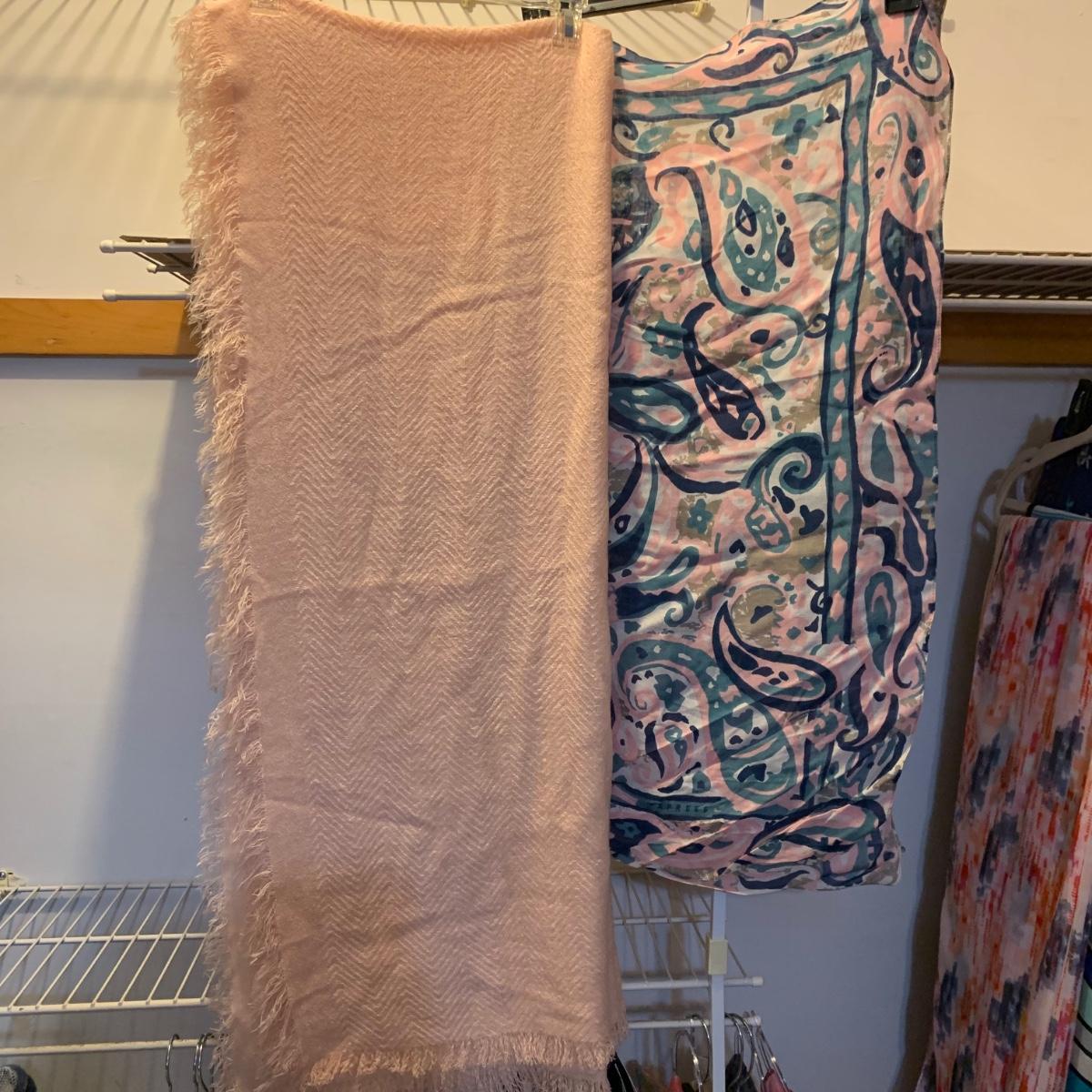 50+ scarves and 15+ belts. The scarves come in just about every color and design you could imagine! There are quite a few large, soft, and warm plaid scarves, as well as silk, rayon and more. Some are velvet, some have sequins. Many are brand new with their original tags still attached. Of the belts, one is Fossil, three are St. John’s Bay, there are two gold belts, and a few fabric belts. Not all belts have sizes listed, but the ones that do are marked M or L. Some of the belts show some wear.