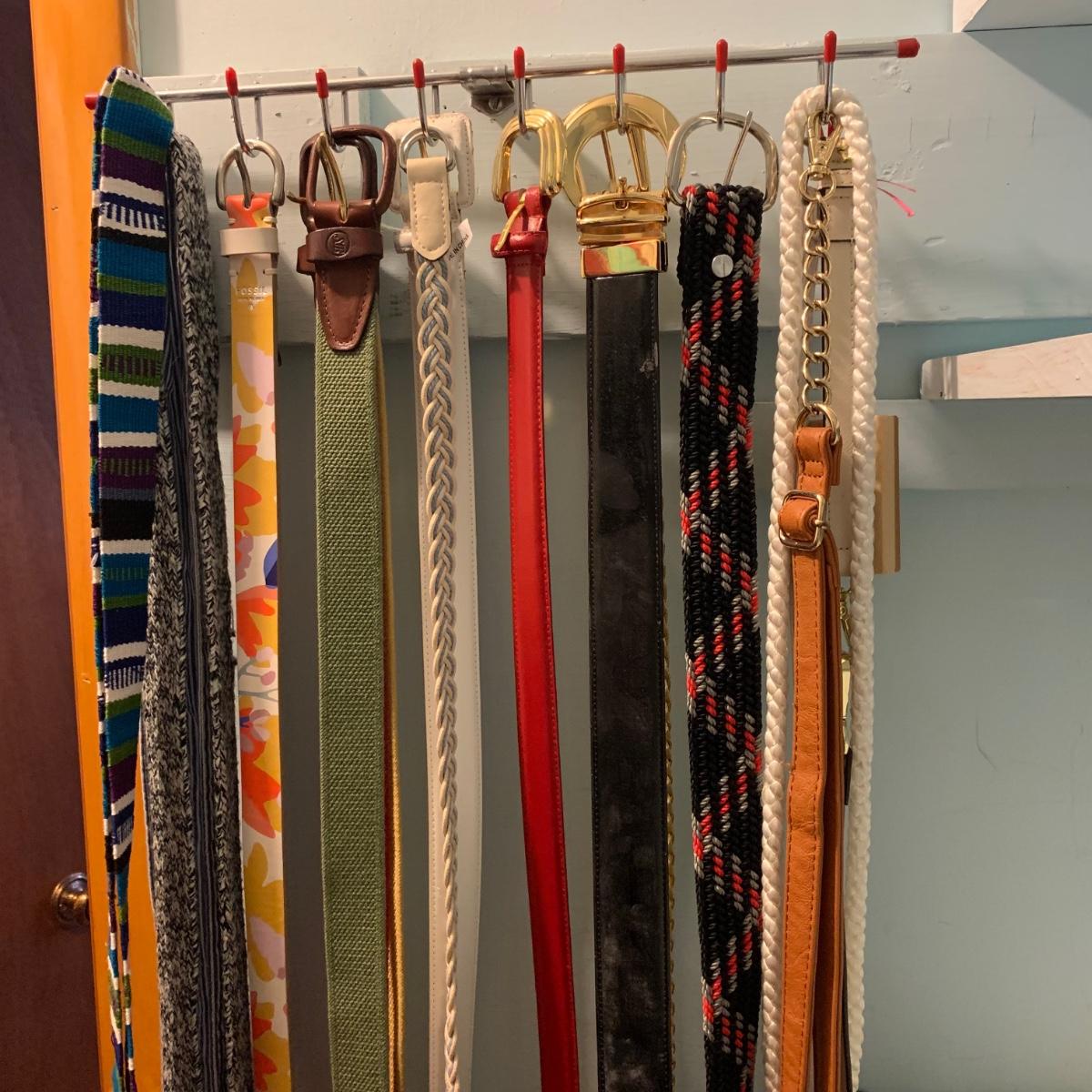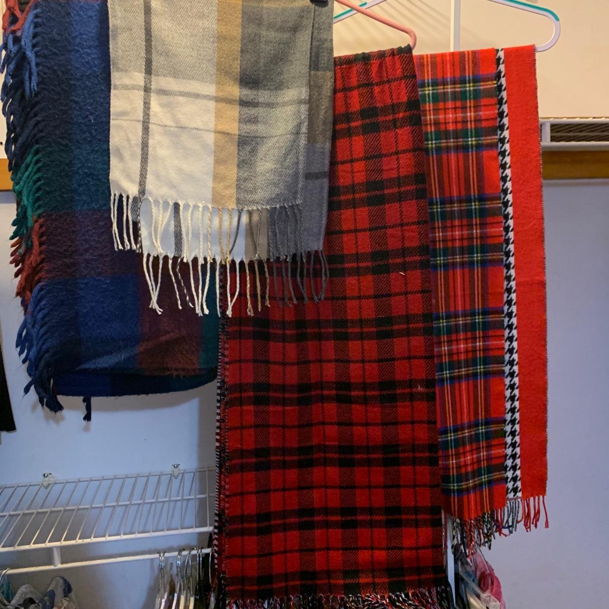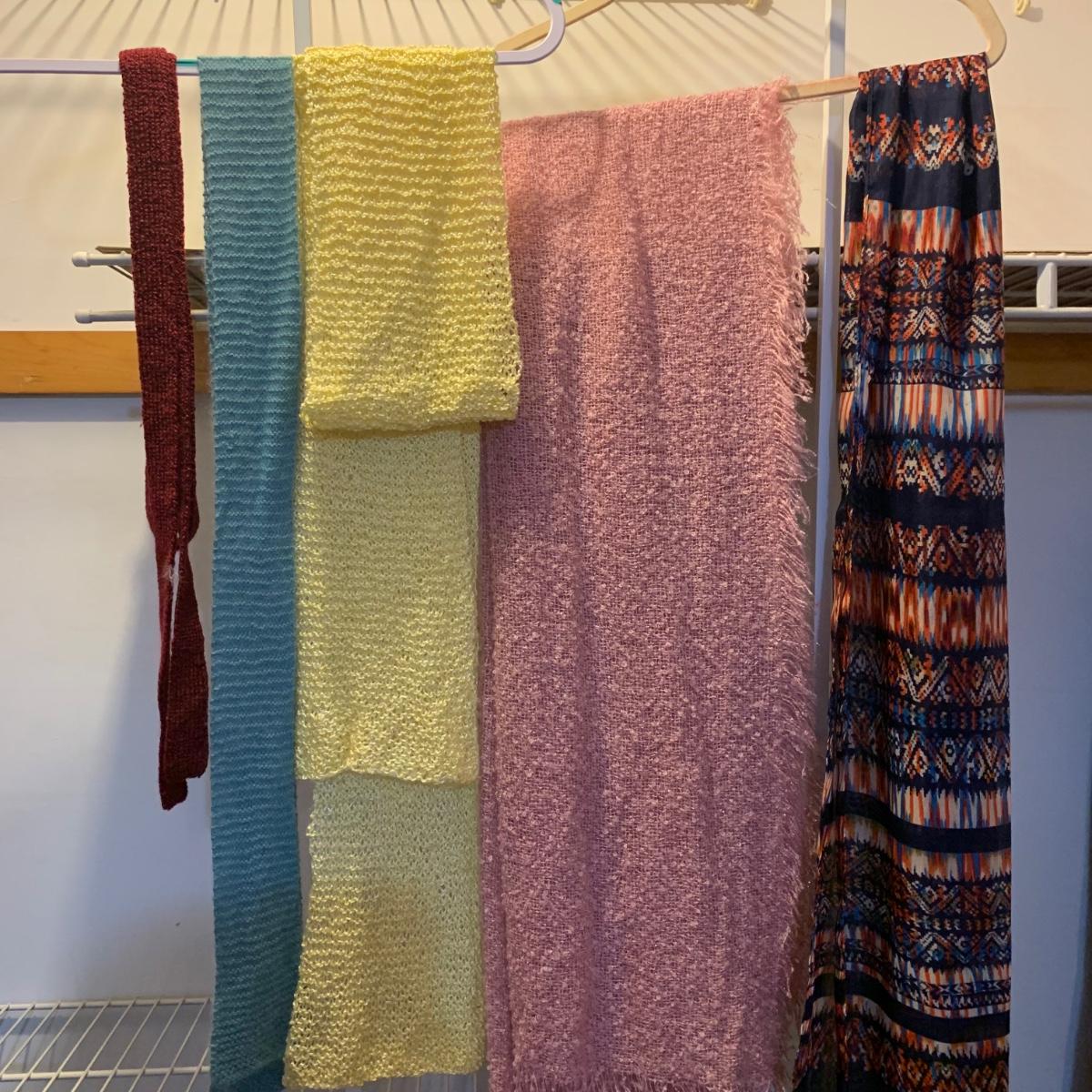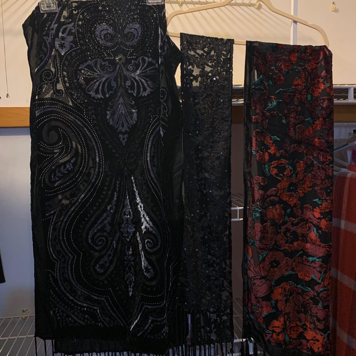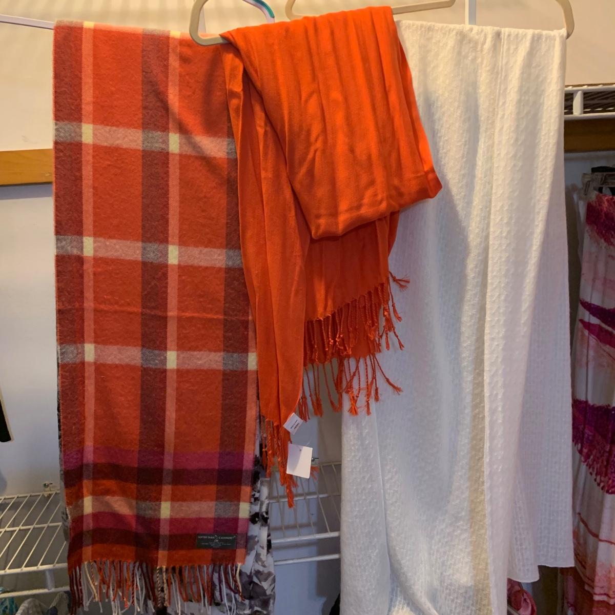 50+ scarves and 15+ belts. The scarves come in just about every color and design you could imagine! There are quite a few large, soft, and warm plaid scarves, as well as silk, rayon and more. Some are velvet, some have sequins. Many are brand new with their original tags still attached. Of the belts, one is Fossil, three are St. John’s Bay, there are two gold belts, and a few fabric belts. Not all belts have sizes listed, but the ones that do are marked M or L. Some of the belts show some wear.