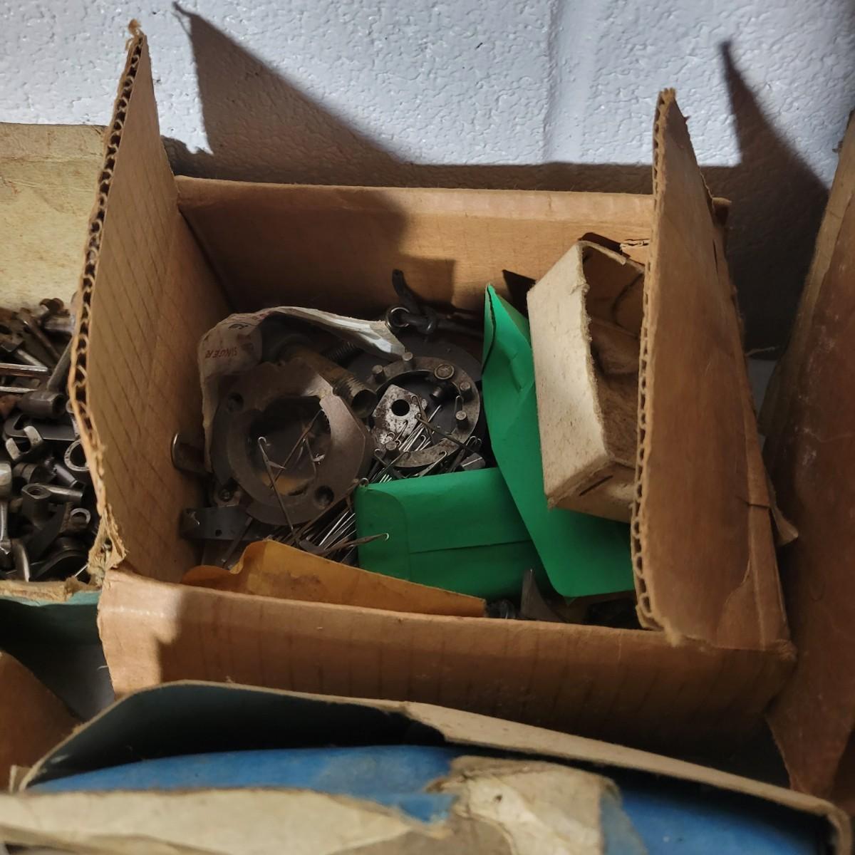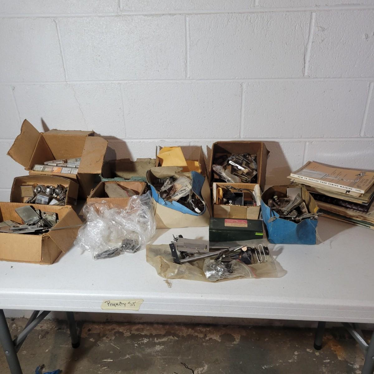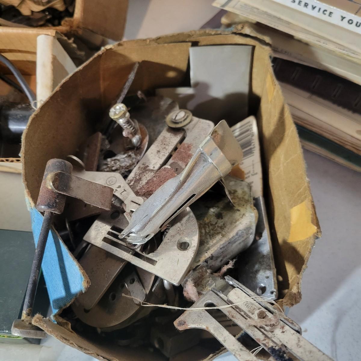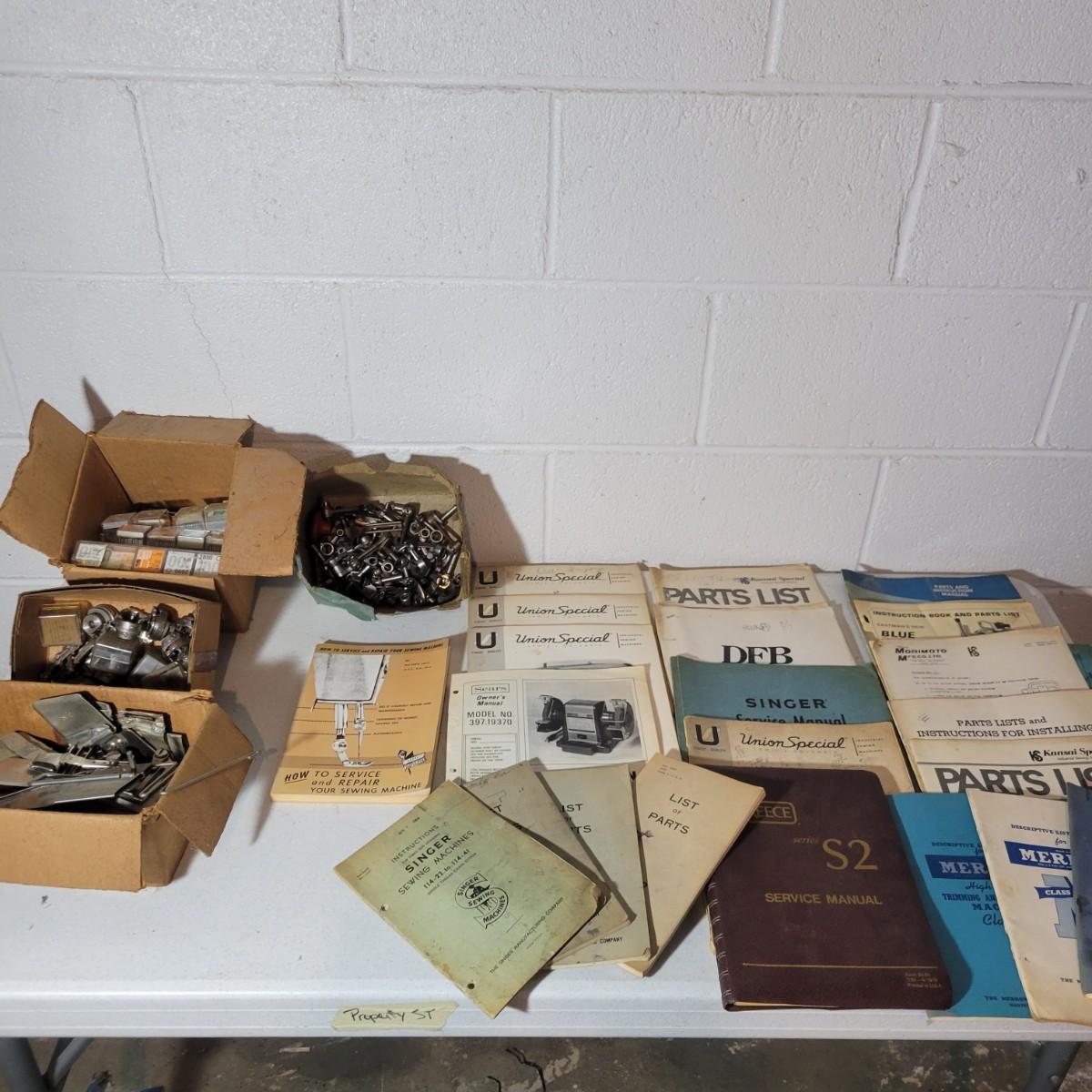 A huge variety of miscellaneous sewing machine parts for different types of sewing machines. Some parts are segregated into individual boxes, many are also randomly piled into a large box. Lot also includes manuals and parts lists for Singer, Merrow, Reese and Union Special machines. Local pickup only