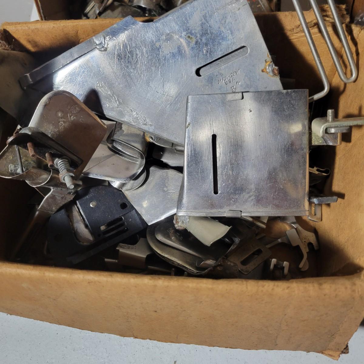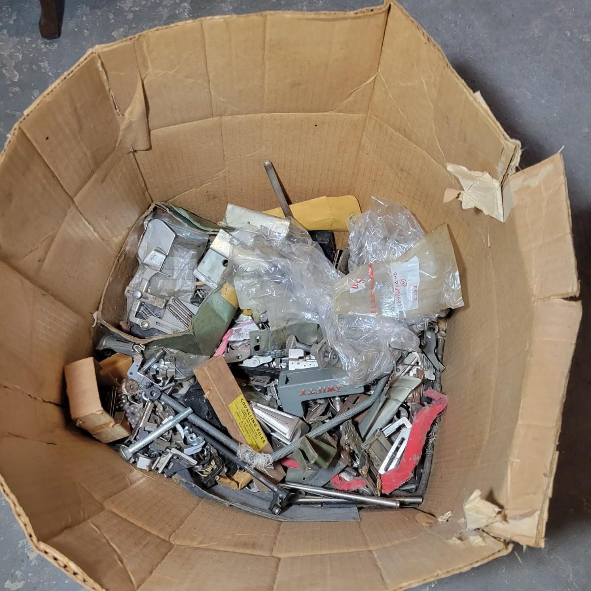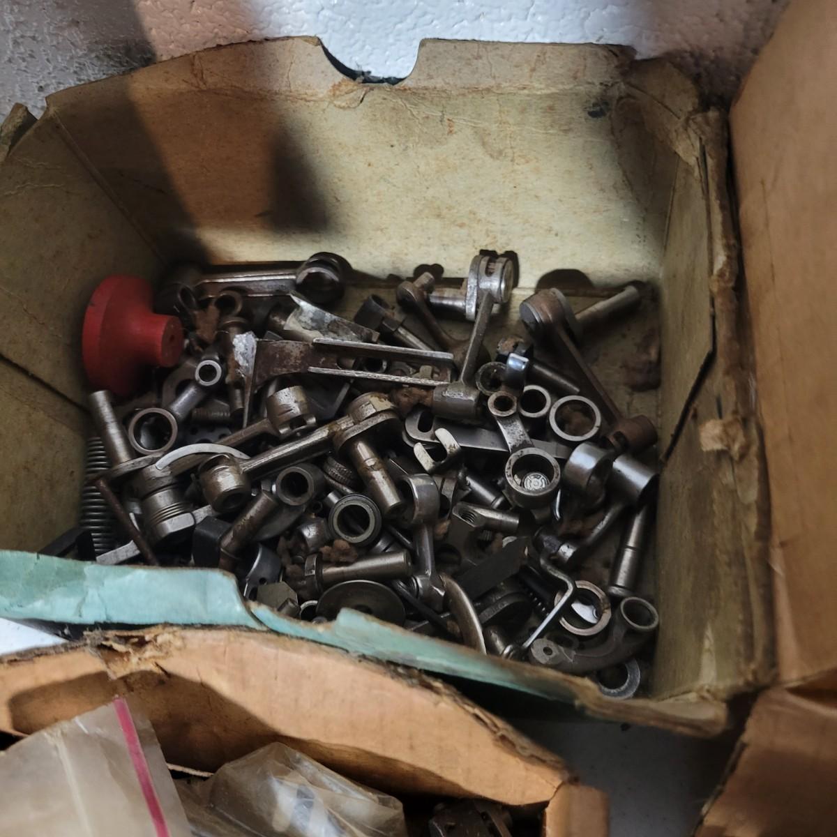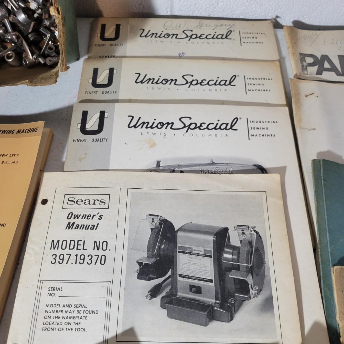 A huge variety of miscellaneous sewing machine parts for different types of sewing machines. Some parts are segregated into individual boxes, many are also randomly piled into a large box. Lot also includes manuals and parts lists for Singer, Merrow, Reese and Union Special machines. Local pickup only