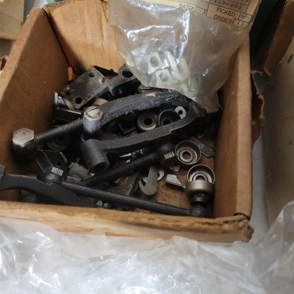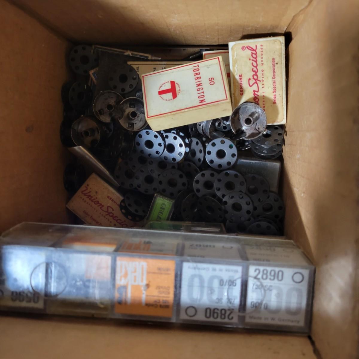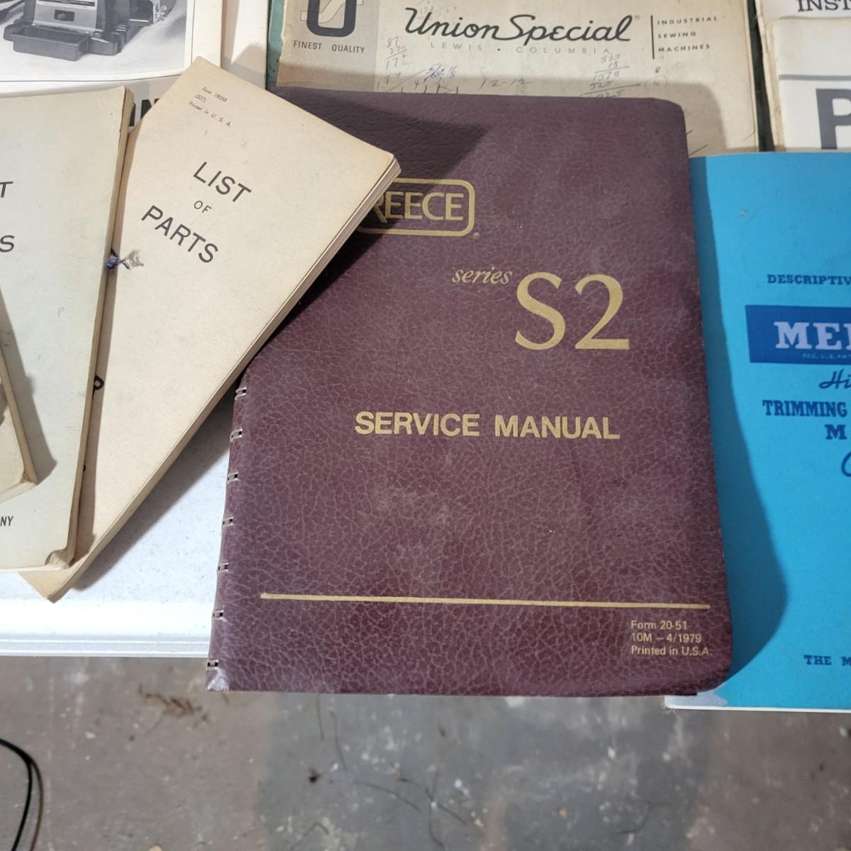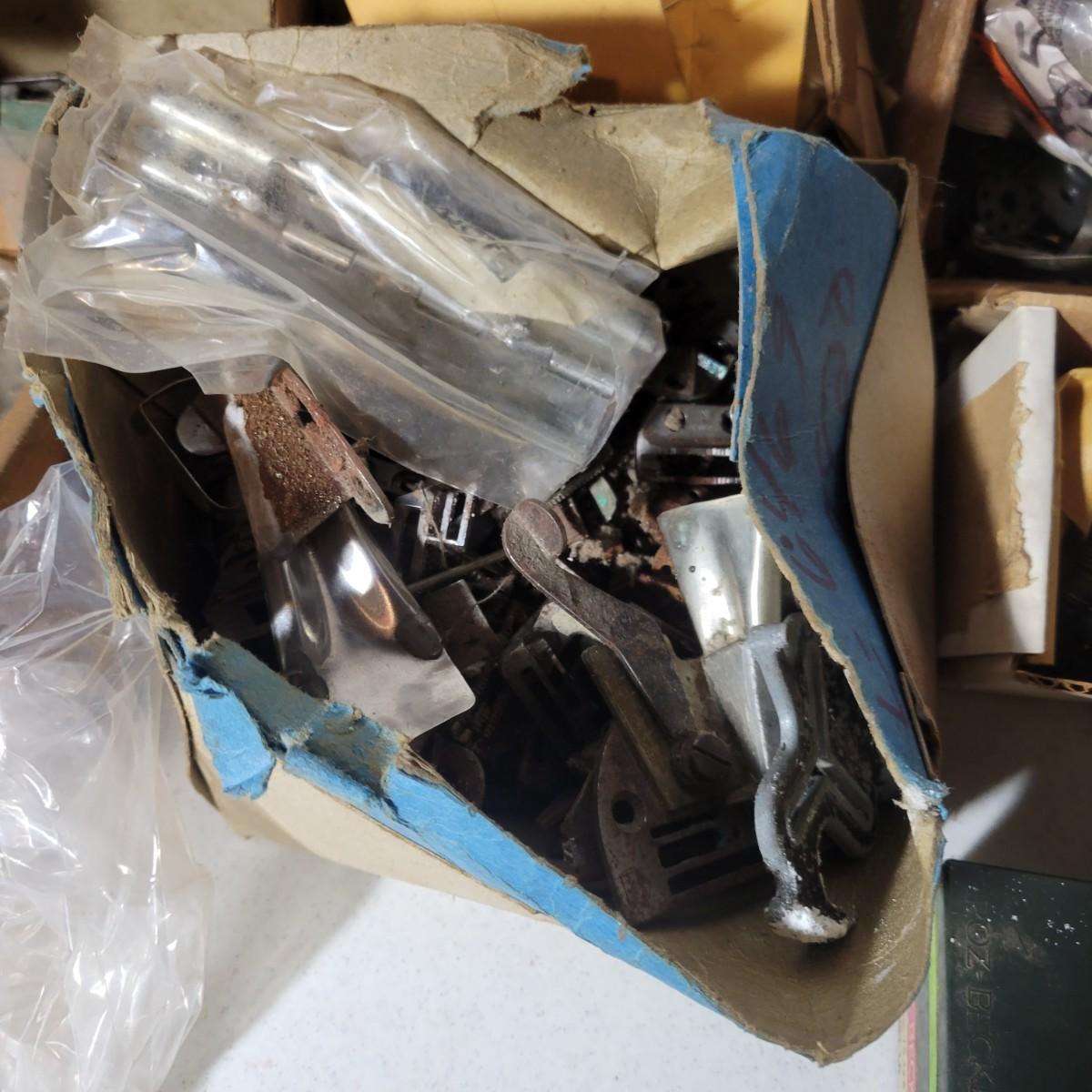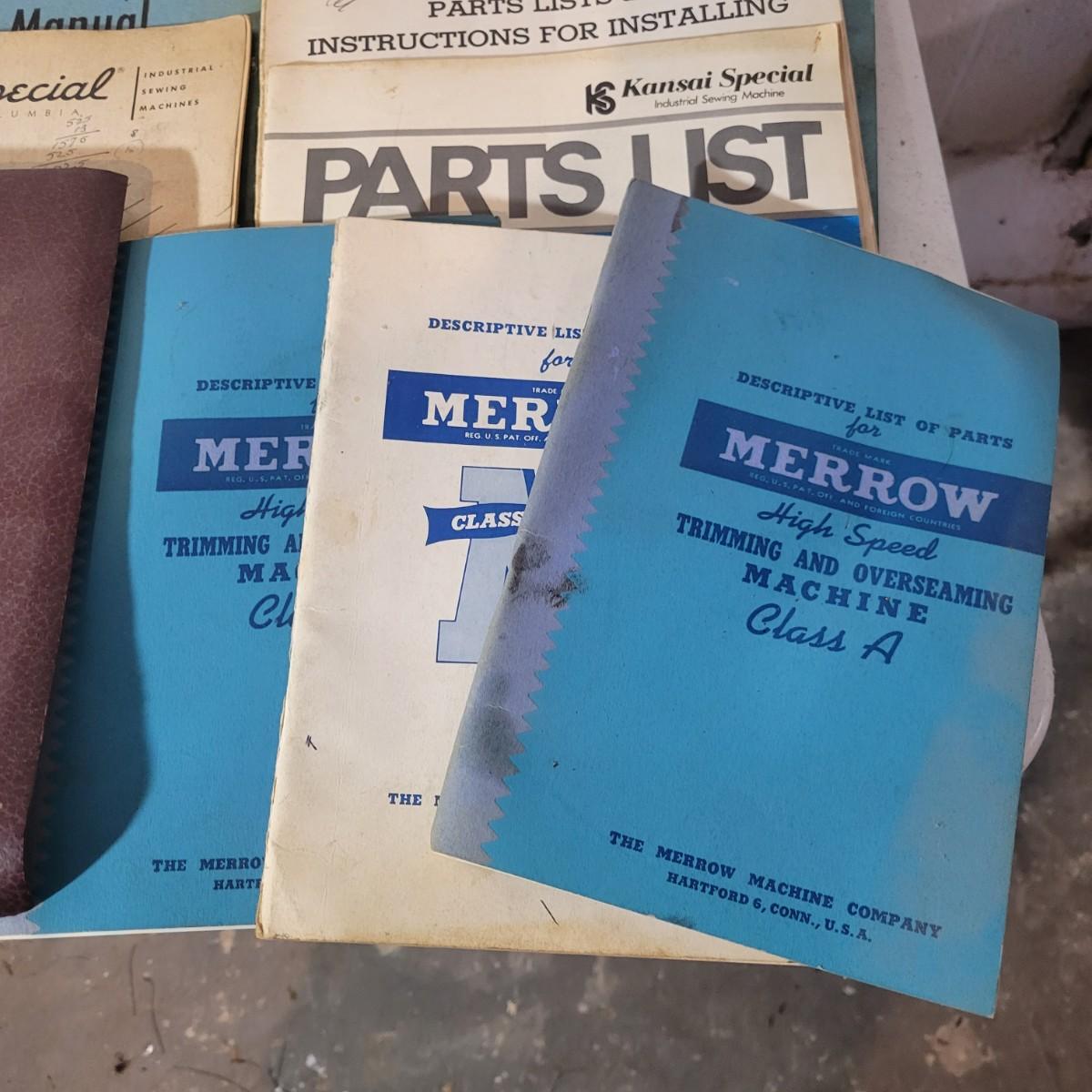A huge variety of miscellaneous sewing machine parts for different types of sewing machines. Some parts are segregated into individual boxes, many are also randomly piled into a large box. Lot also includes manuals and parts lists for Singer, Merrow, Reese and Union Special machines. Local pickup only