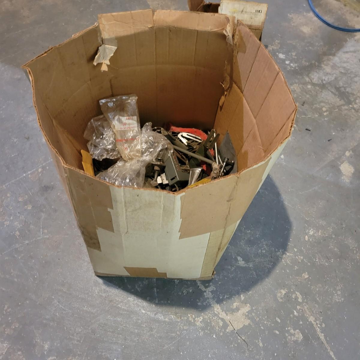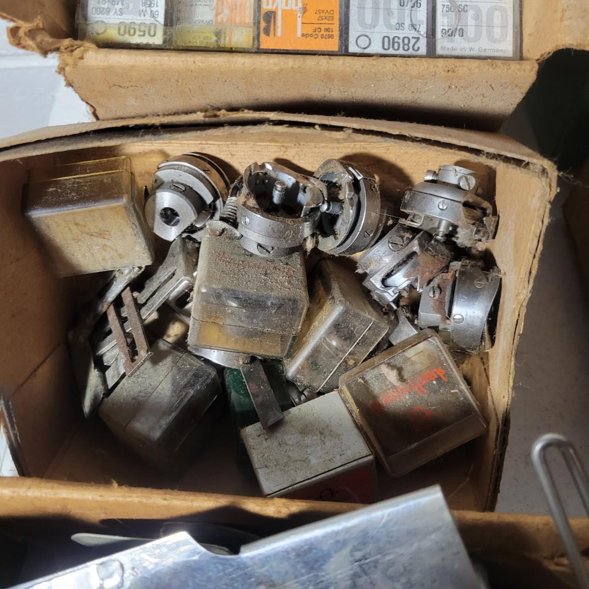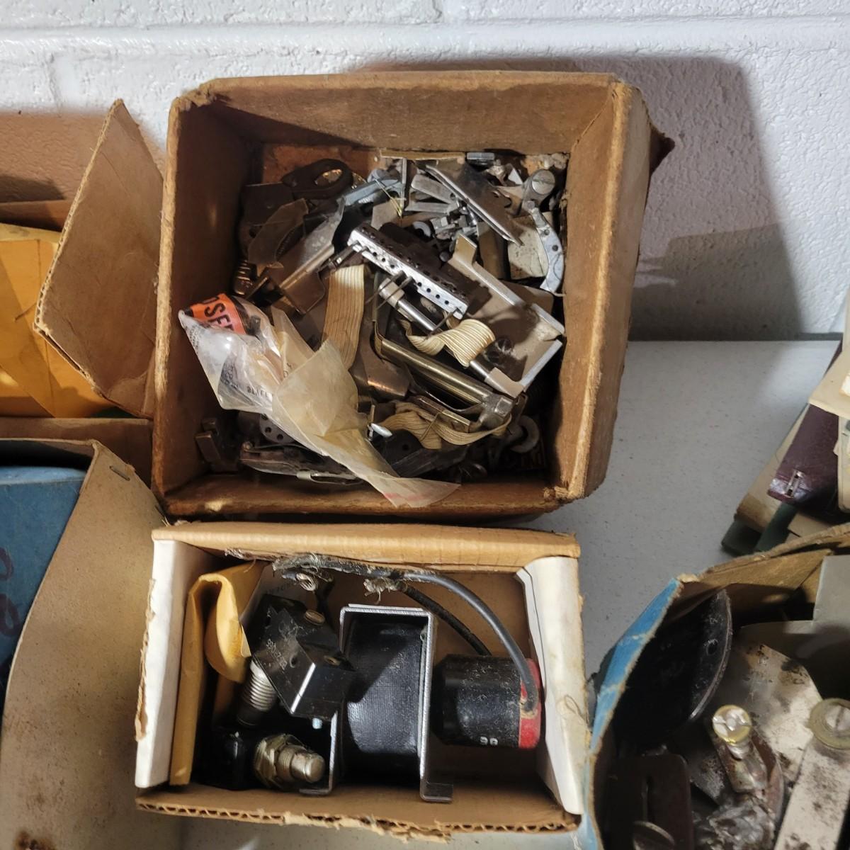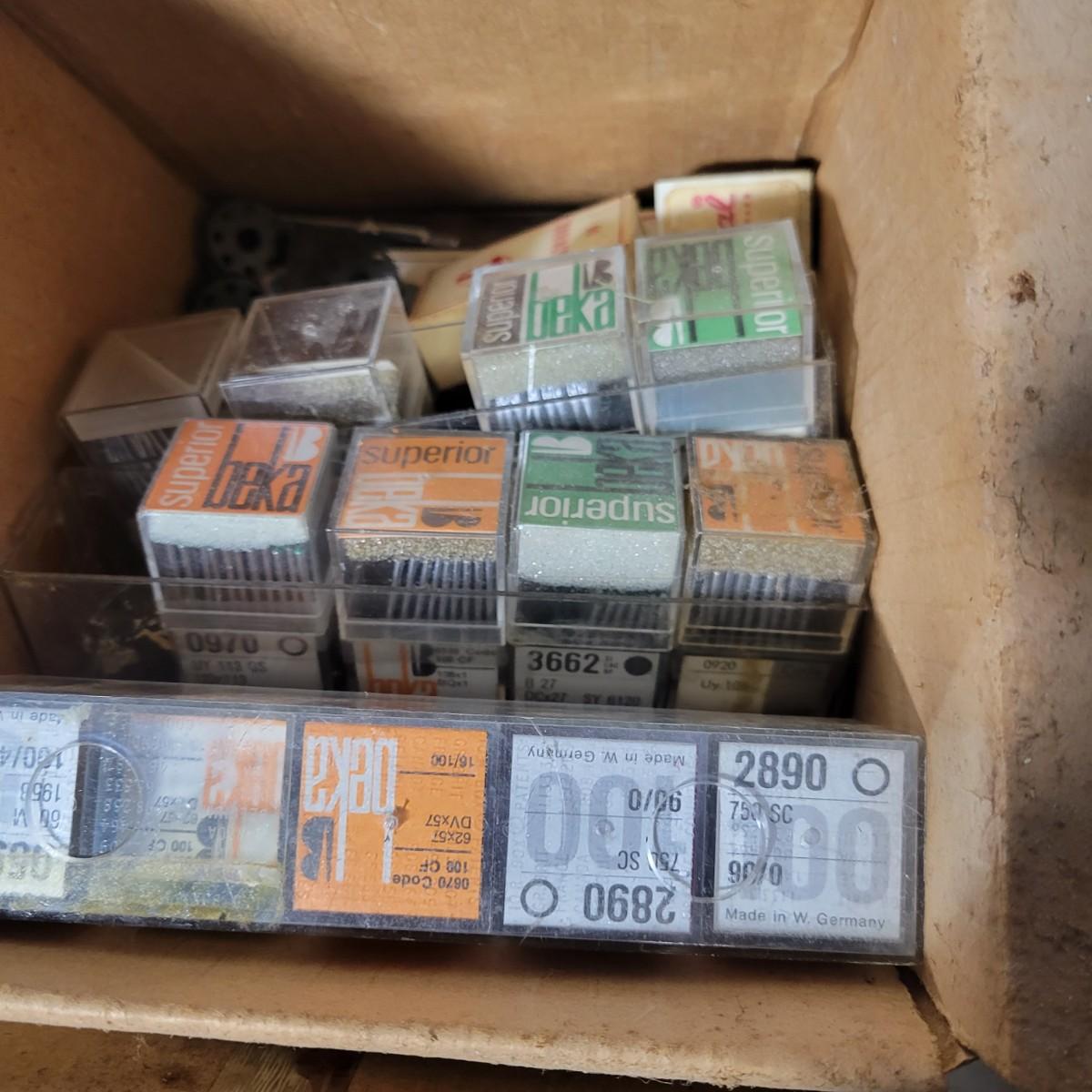 A huge variety of miscellaneous sewing machine parts for different types of sewing machines. Some parts are segregated into individual boxes, many are also randomly piled into a large box. Lot also includes manuals and parts lists for Singer, Merrow, Reese and Union Special machines. Local pickup only