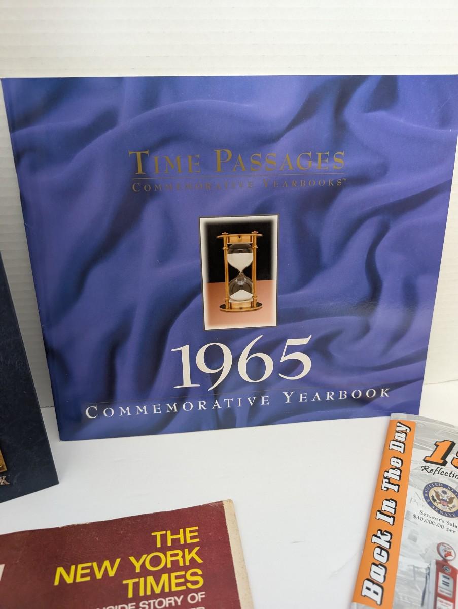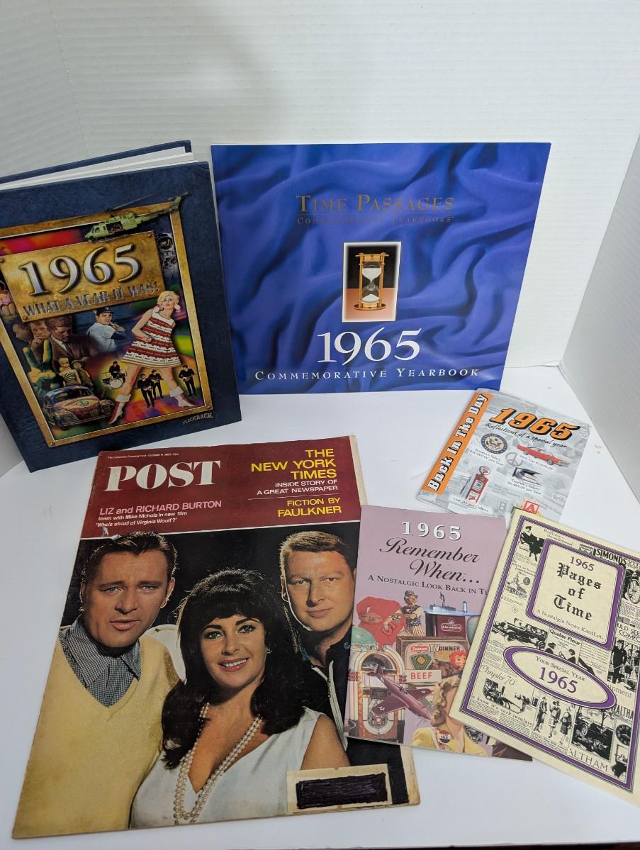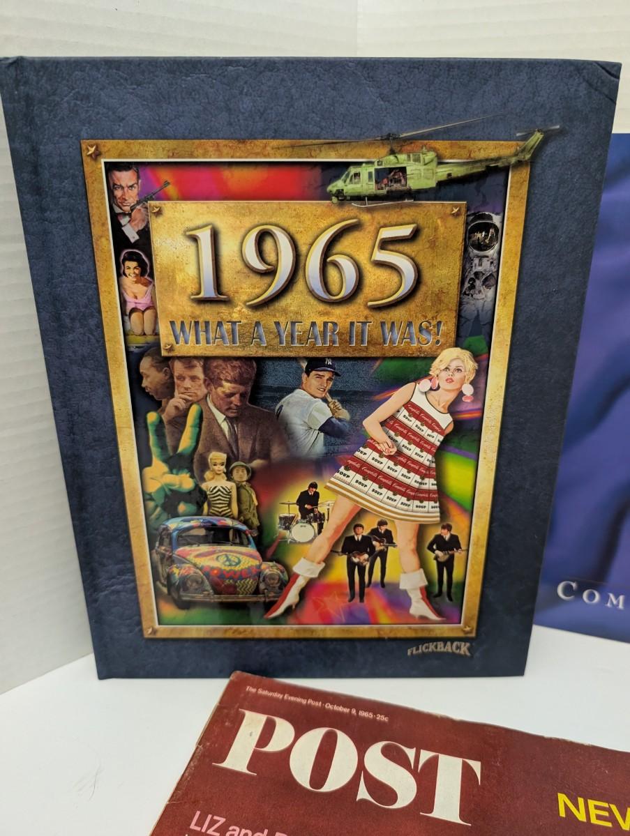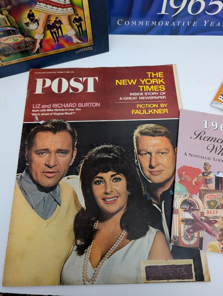 An incredible time capsule lot celebrating the year 1965! This collection is perfect for a 60th birthday gift (in 2025), an anniversary, or for any collector of pop culture and historical ephemera from the swinging sixties. This seven-piece (estimate) lot includes various books, magazines, and booklets, focusing on the historical events, fashion, music, and news of the mid-1960s. The centerpiece is a fantastic original Saturday Evening Post Magazine featuring iconic Hollywood couple Elizabeth Taylor and Richard Burton on the cover, a highly sought-after collectible. Also included is the "1965 Commemorative Yearbook" from Time Passages, a "1965 What a Year This Was!" hardcover book, a "Back in the Day" 1965 card, a "1965 Pages of Time" newspaper clipping booklet, and a "1965 Remember When..." booklet. Topics covered will include the Vietnam War, Civil Rights, the British Invasion music, and classic television. All items are in excellent vintage condition, suitable for display or gifting. A true nostalgic look back at one of the most pivotal years of the decade!