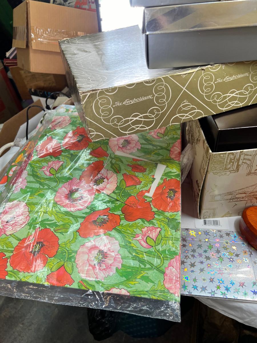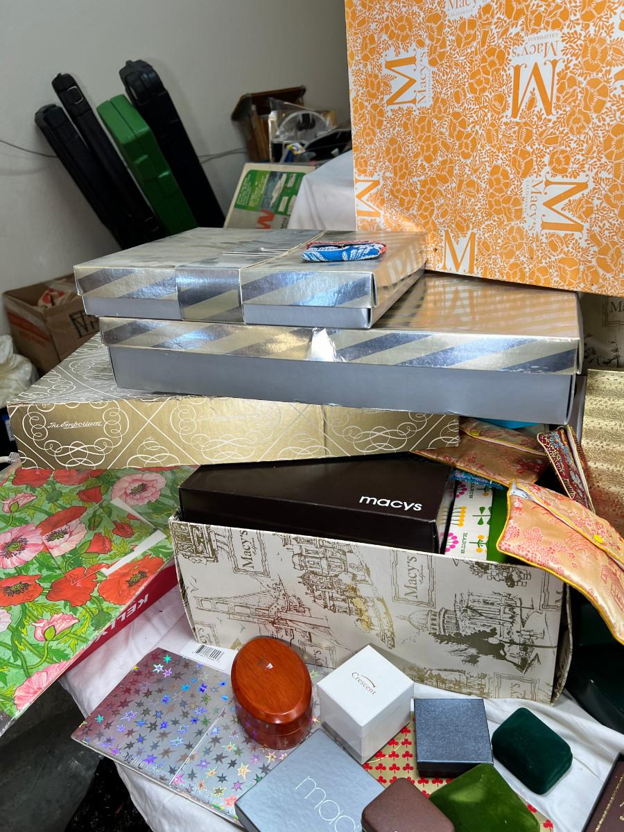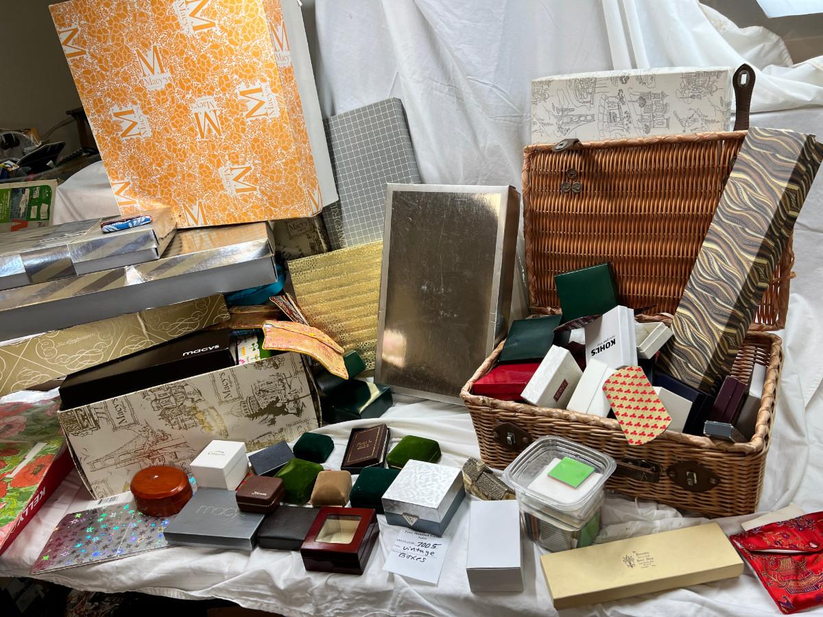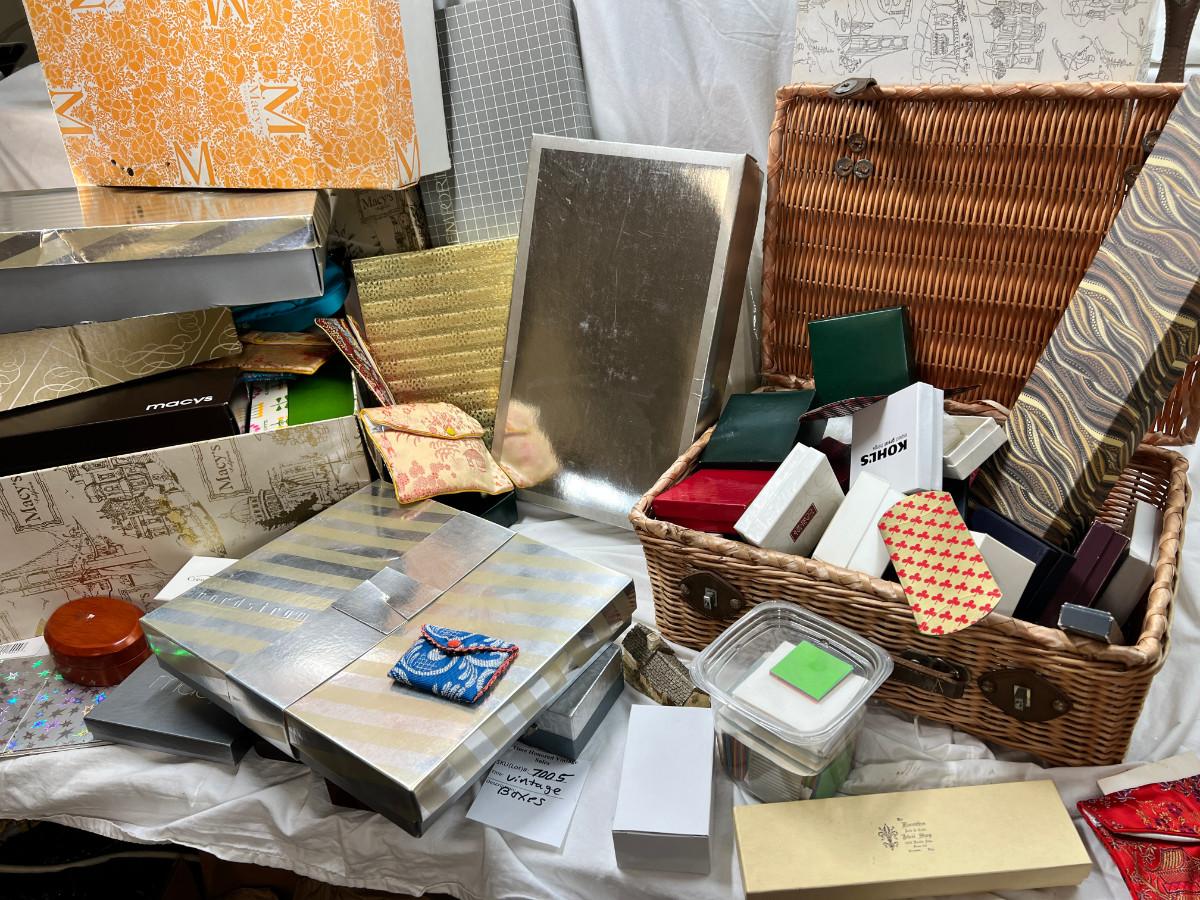 basket, many empty jewelry and other small boxes large selection of nested department store boxes, all vintage. Huge stack of vintage 1970s wrapping papers, most individually packaged like would be purchased at Hallmark. $25.00 surcharge to ship