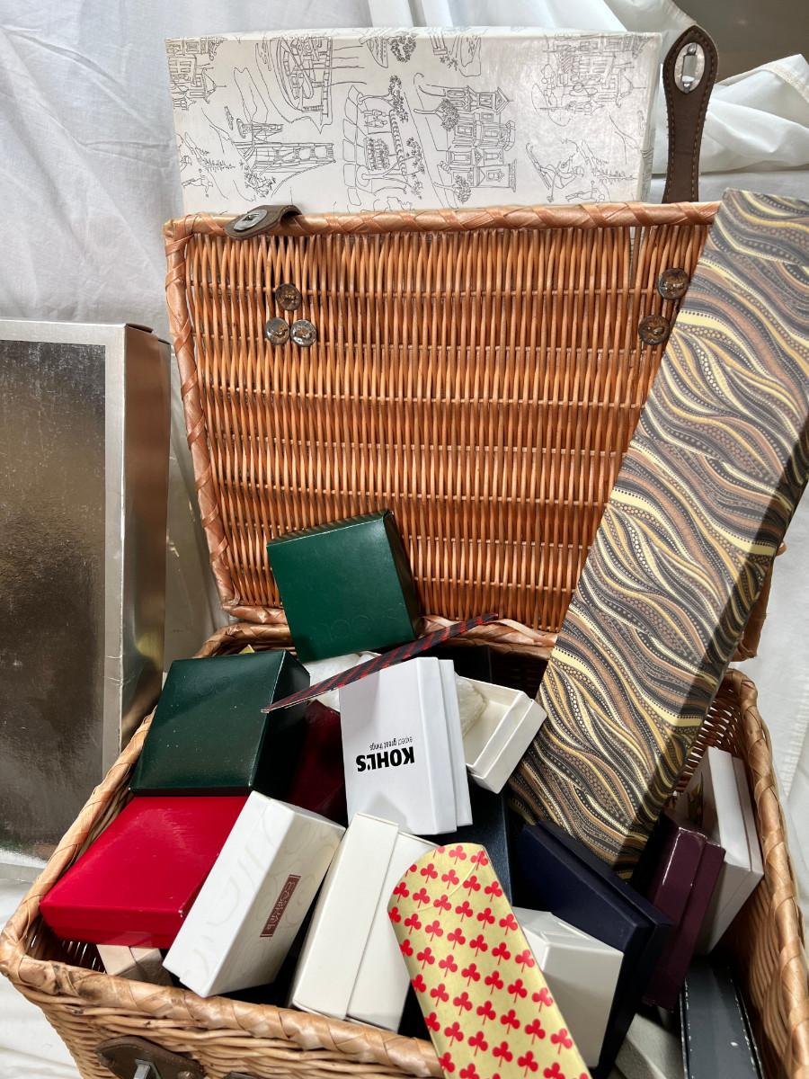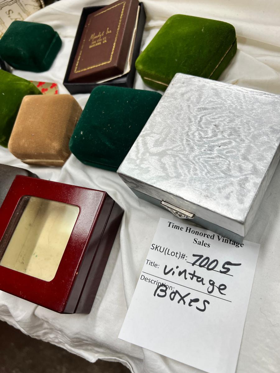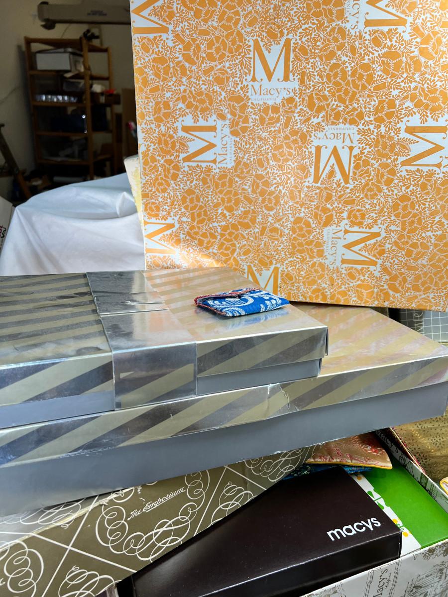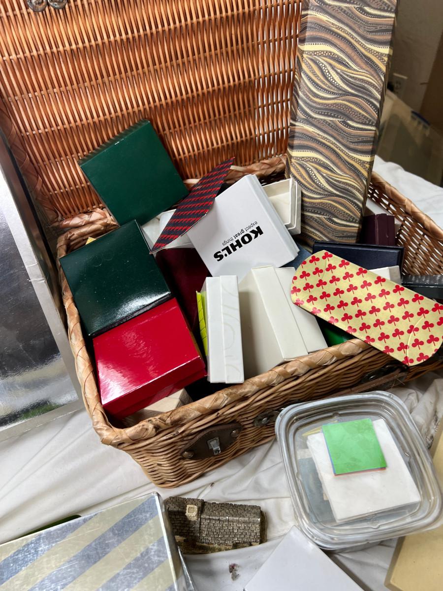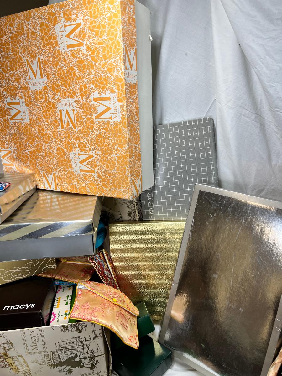 basket, many empty jewelry and other small boxes large selection of nested department store boxes, all vintage. Huge stack of vintage 1970s wrapping papers, most individually packaged like would be purchased at Hallmark. $25.00 surcharge to ship