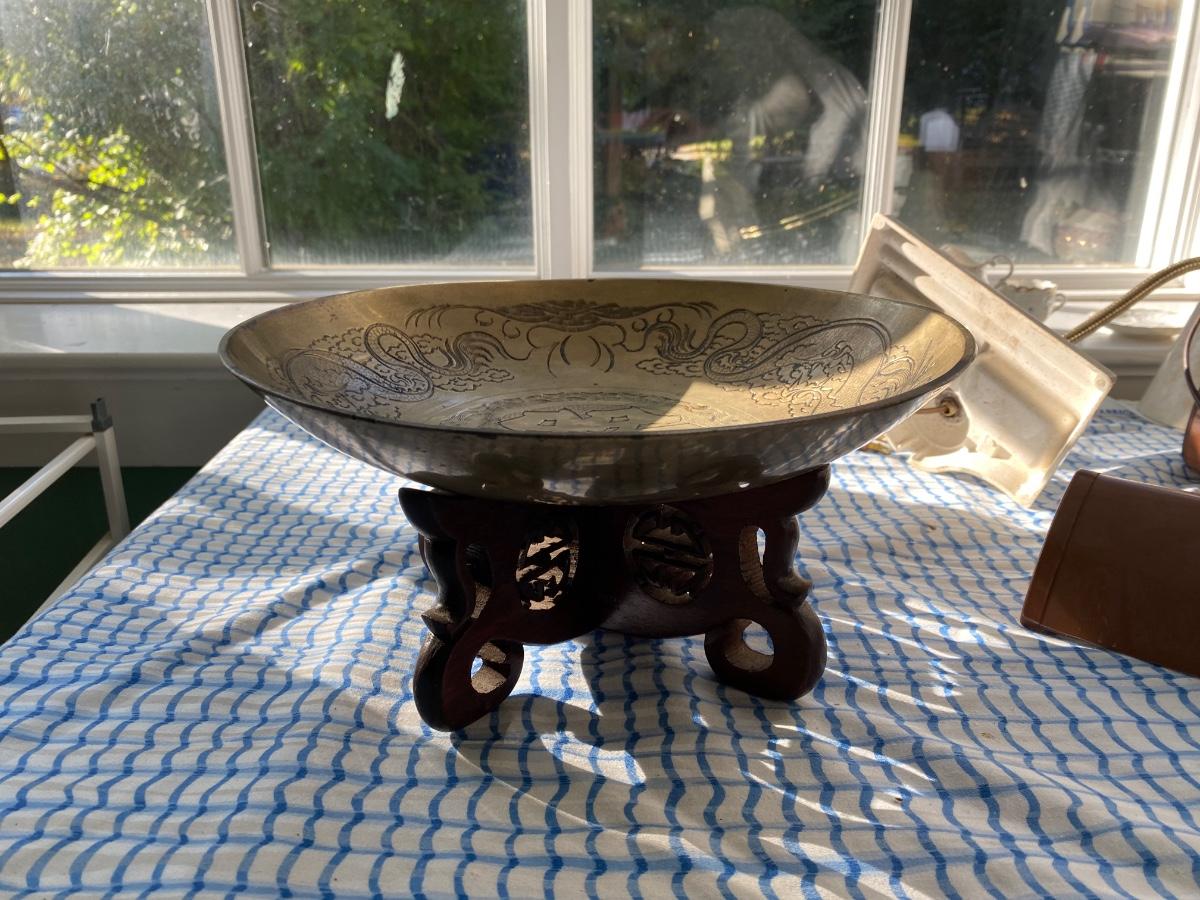 Huge Vintage Chinese Heavy Brass Bowl on Stand Dragons