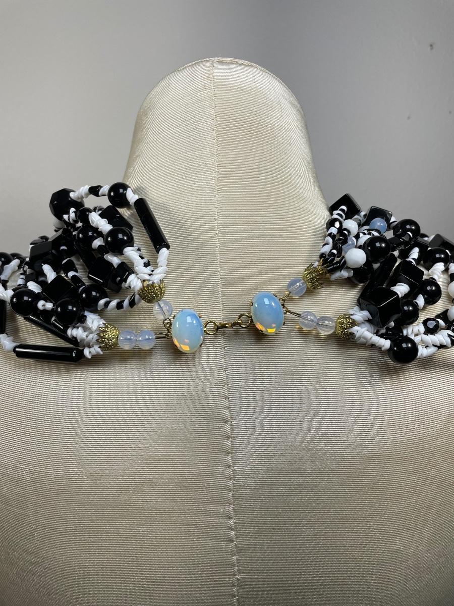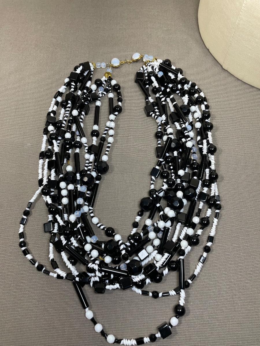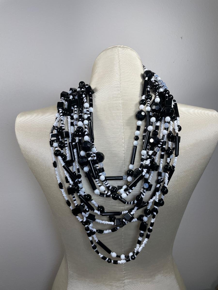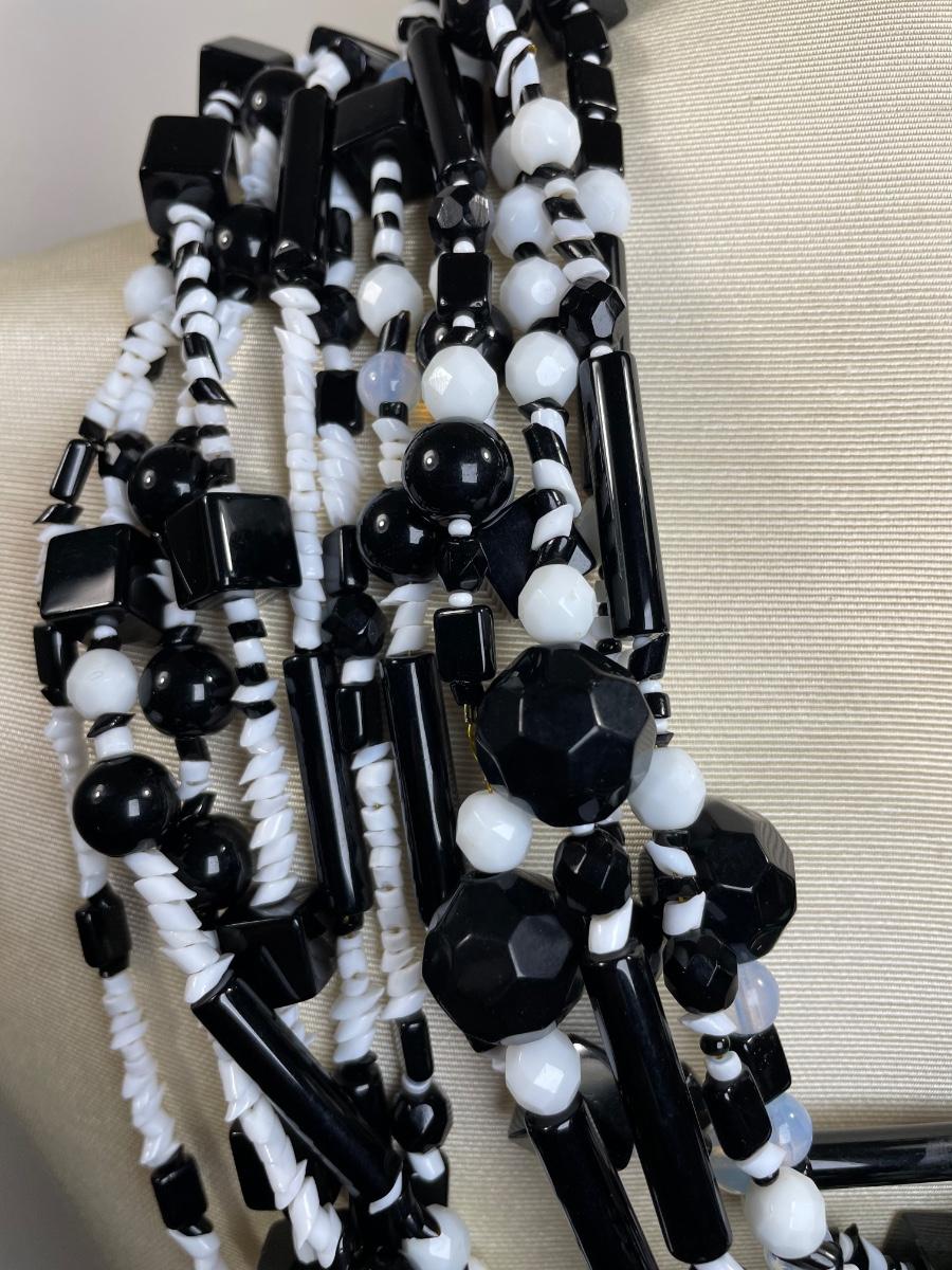 This is incredible! 12 strands of black and white glass beads and up to 34 inches long. It must weigh 2 pounds.