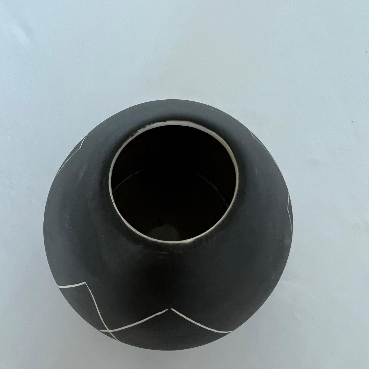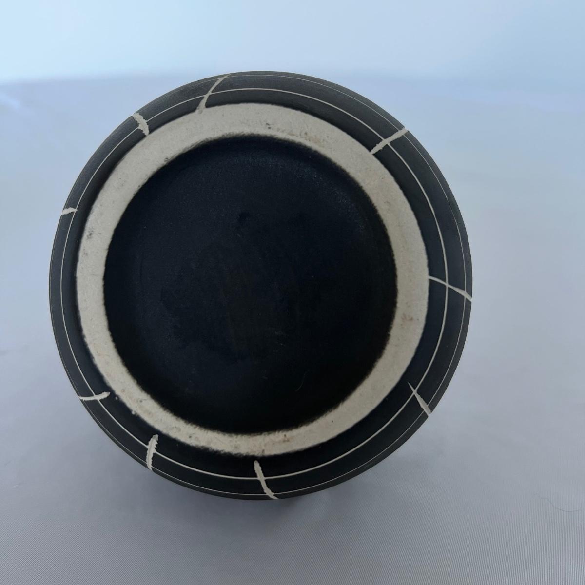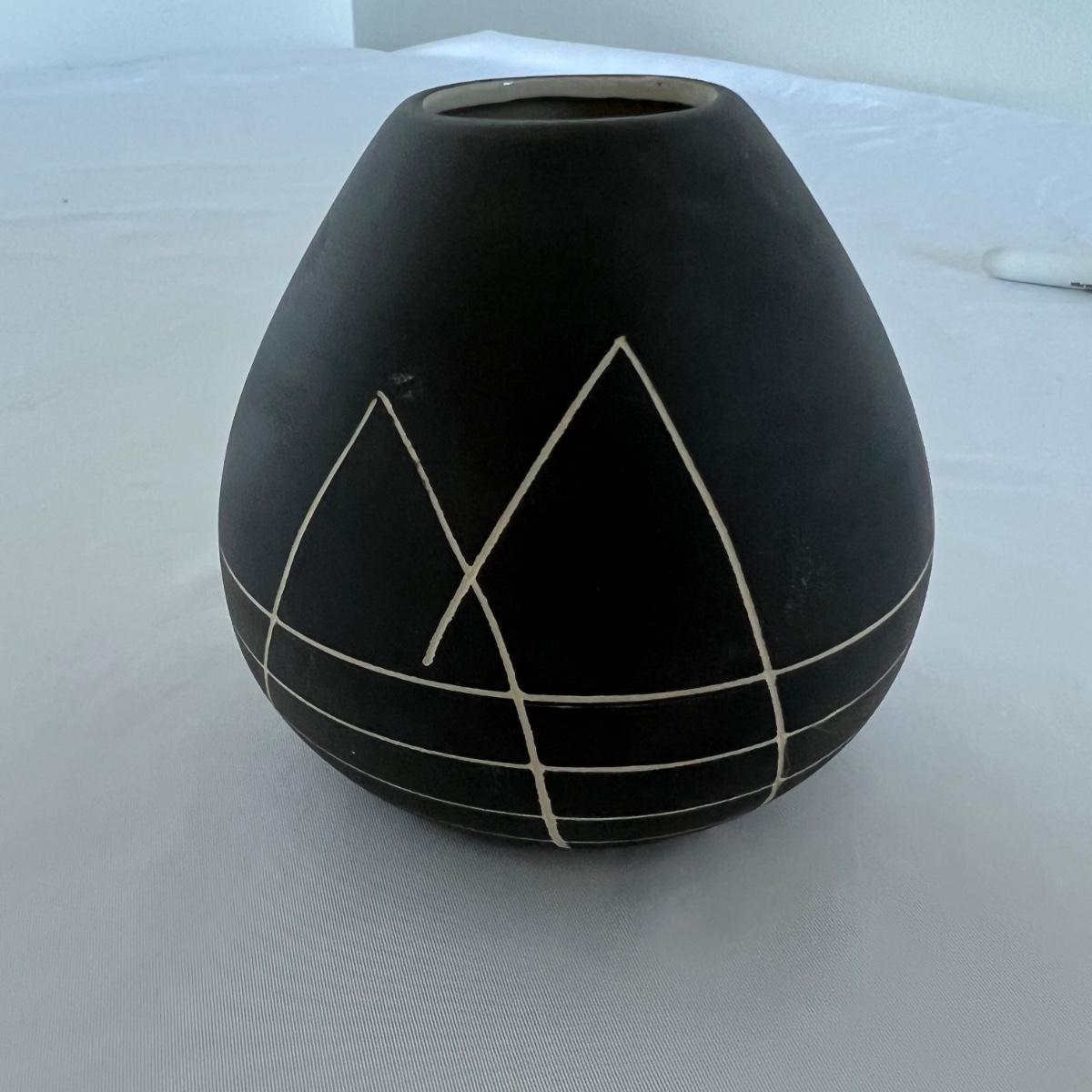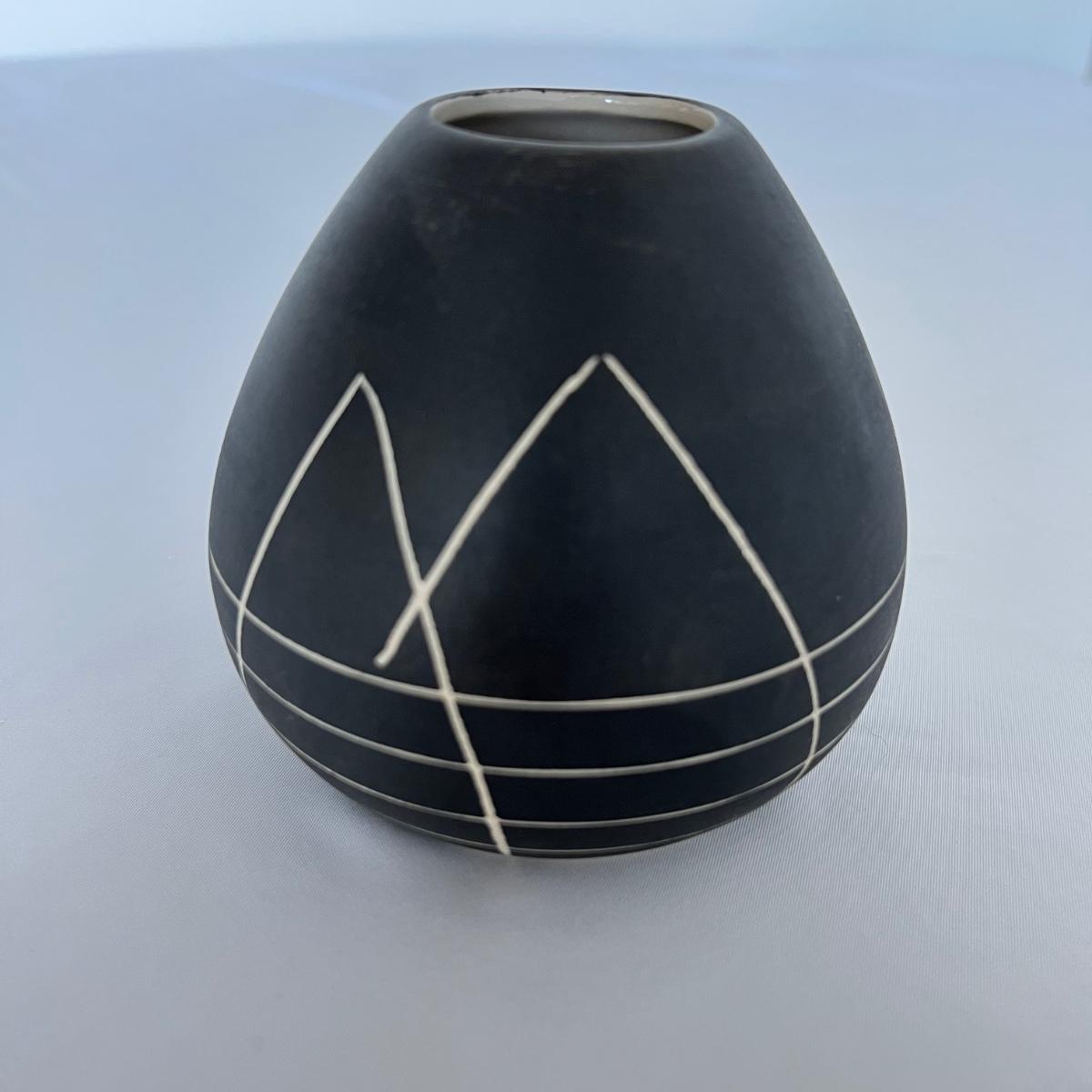 This Boss women’s perfume is almost full. We have paired it with an attractive matte black pottery vase that has sgraffito lines, it measures 2” D (top) x 4.5” H and is in very good condition with no chips or cracks.