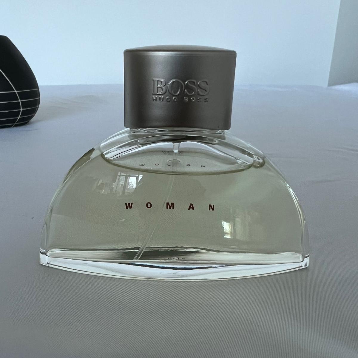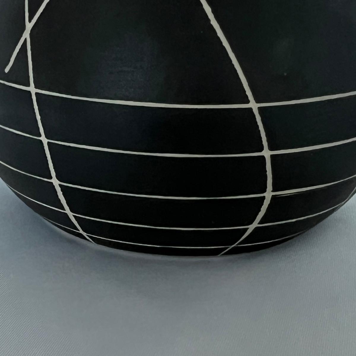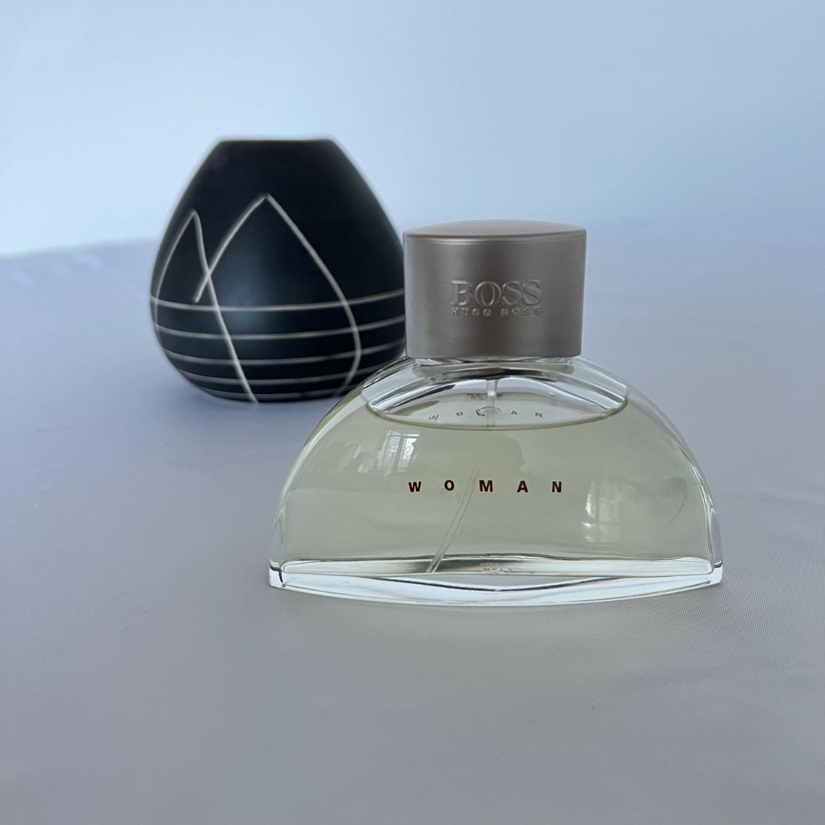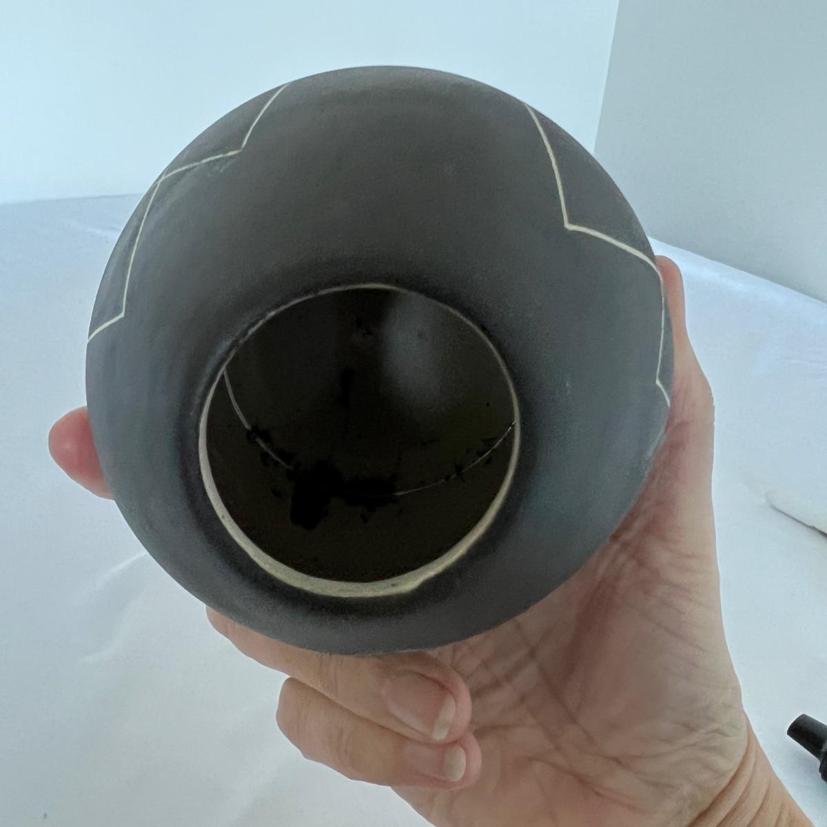 This Boss women’s perfume is almost full. We have paired it with an attractive matte black pottery vase that has sgraffito lines, it measures 2” D (top) x 4.5” H and is in very good condition with no chips or cracks.