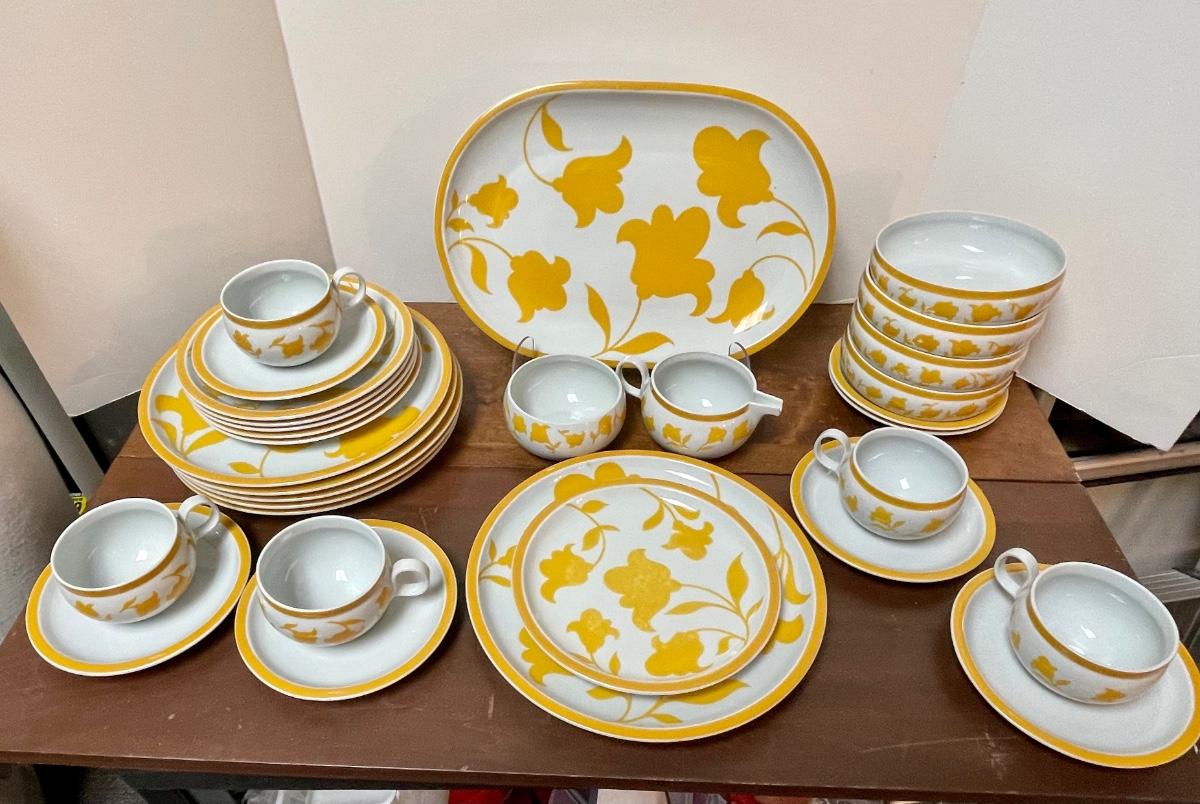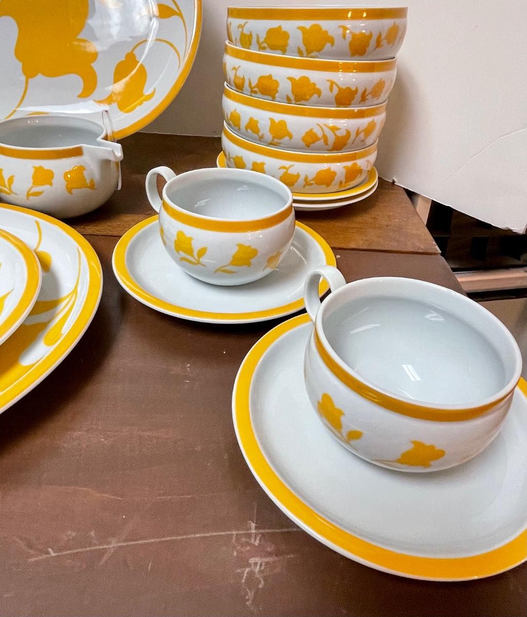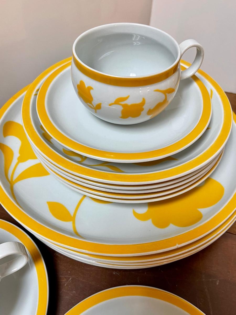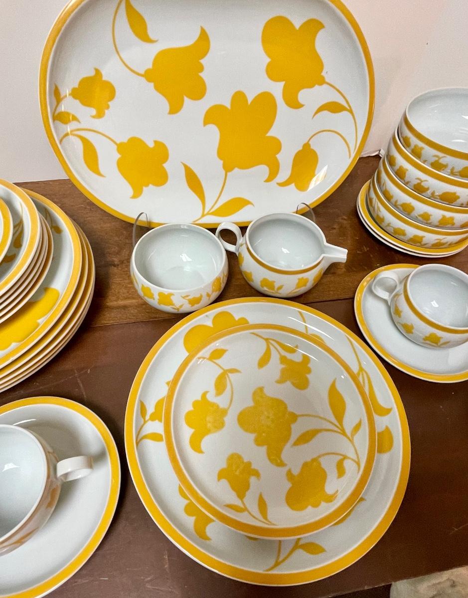 Yellow and White Hearthstone Block Vista Alegre Portugal Ginger Dishware Set. In good condition. Includes all the pieces seen. May be a chip or two. Great for adding to existing dishware.