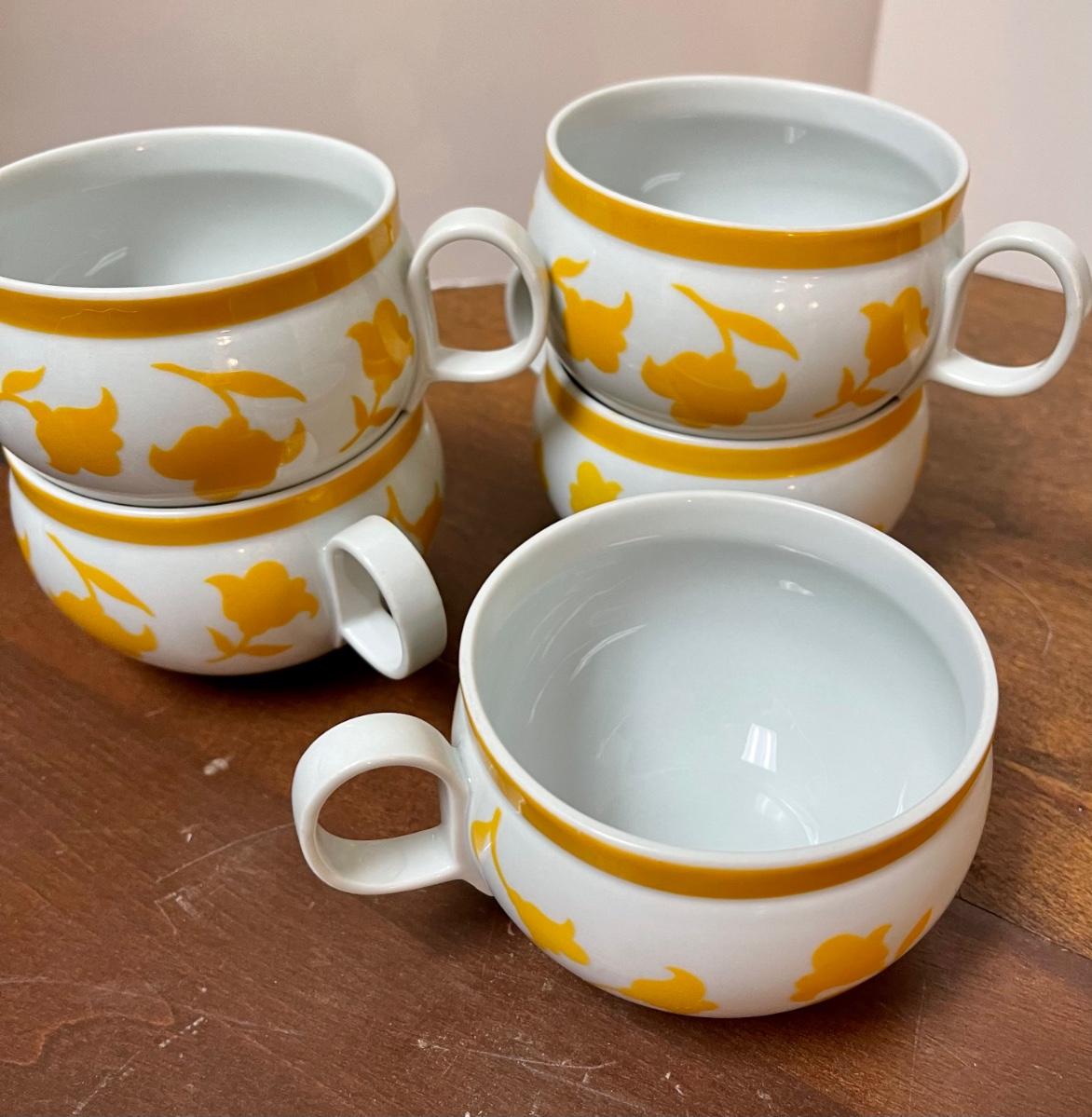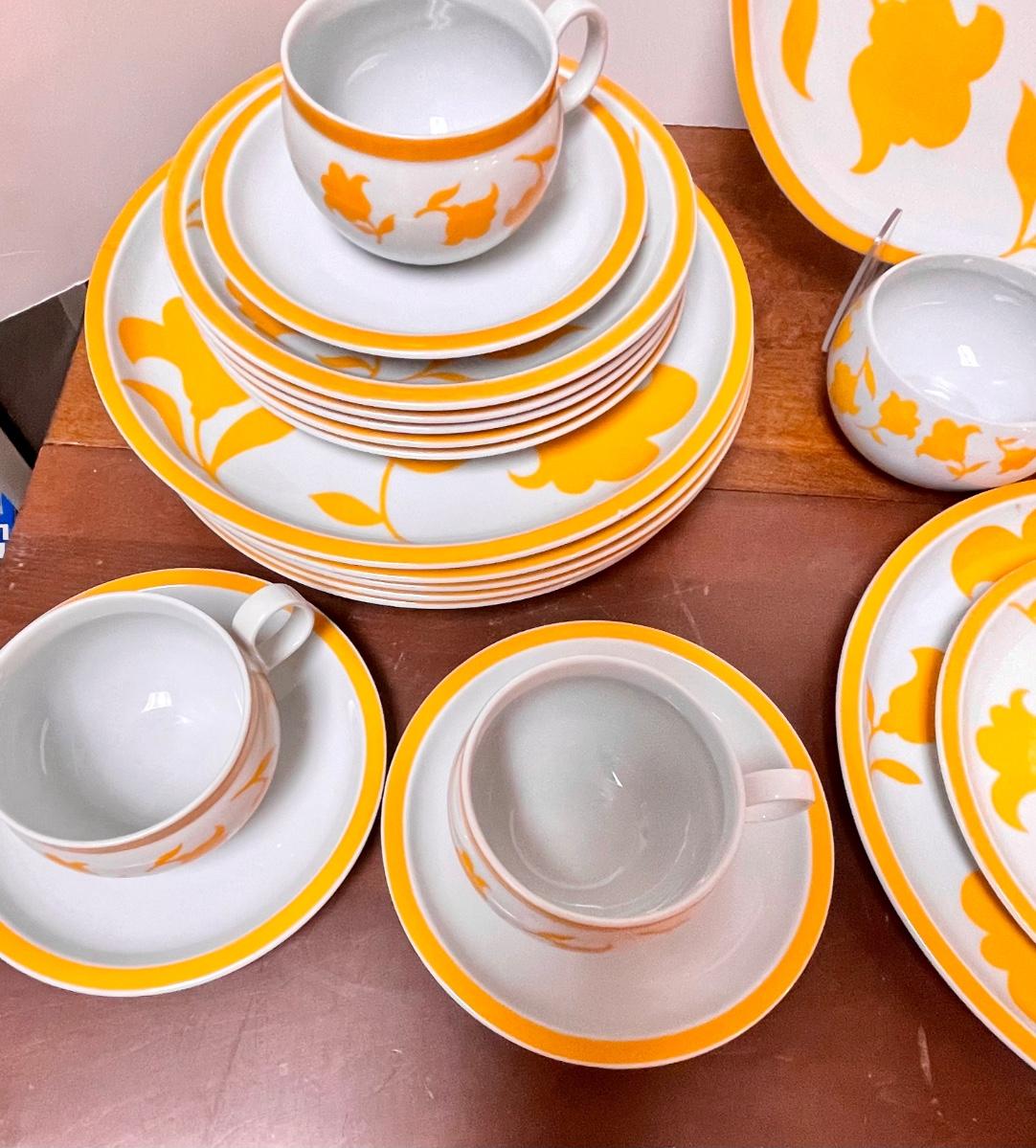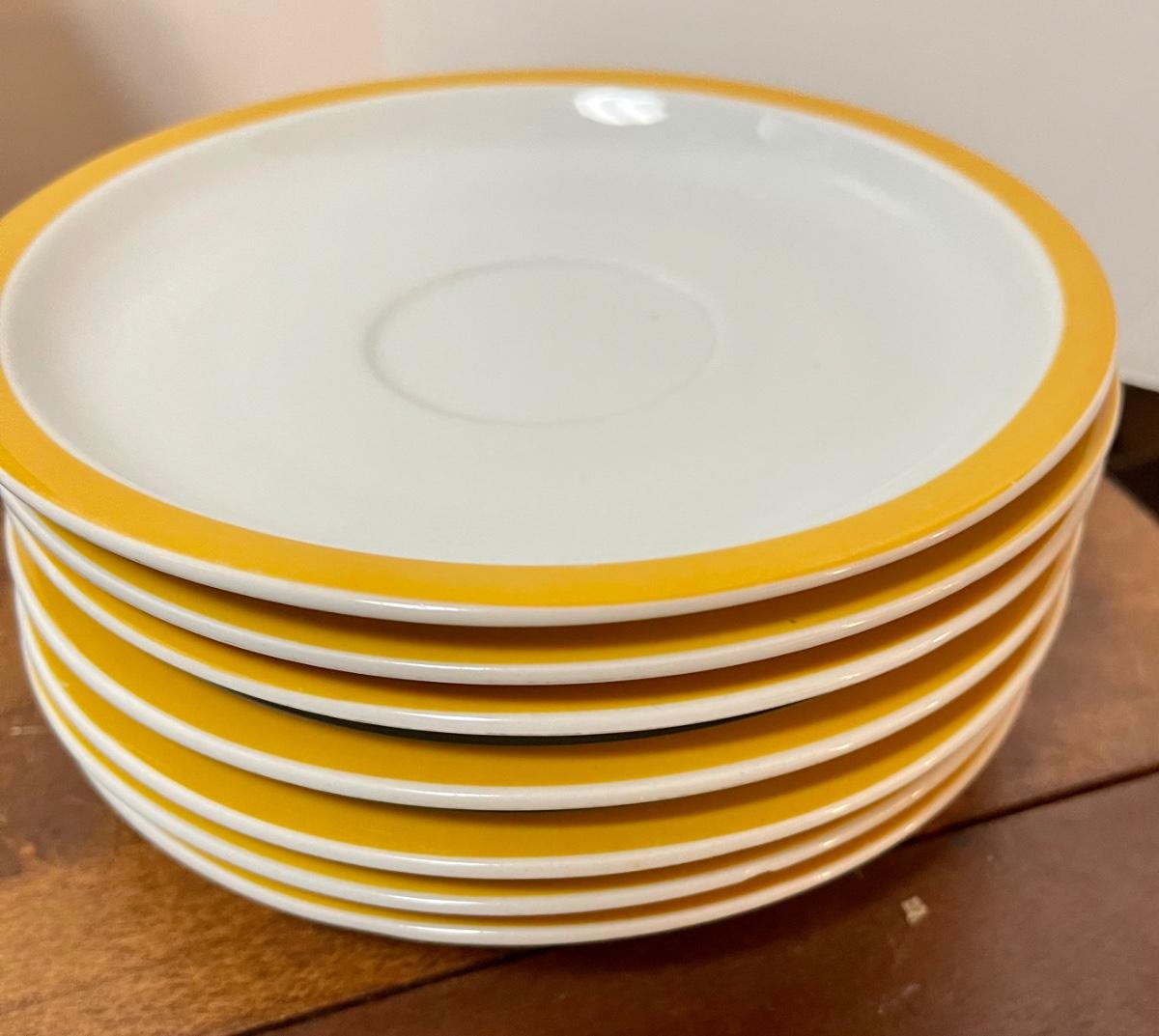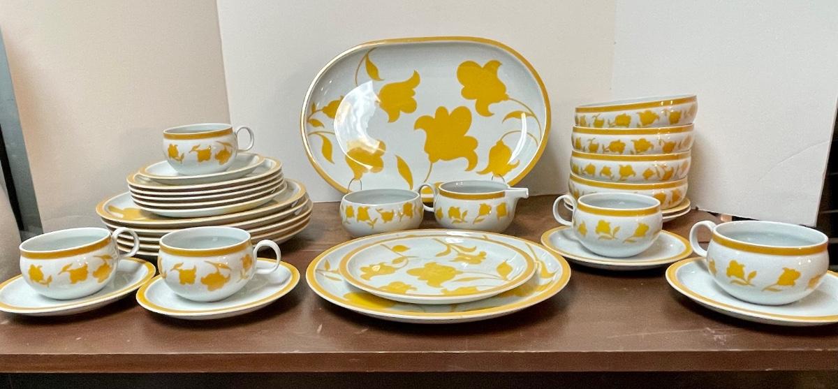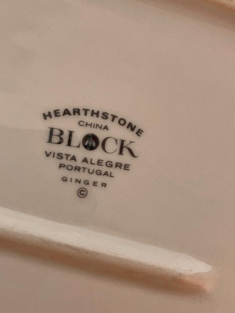 Yellow and White Hearthstone Block Vista Alegre Portugal Ginger Dishware Set. In good condition. Includes all the pieces seen. May be a chip or two. Great for adding to existing dishware.