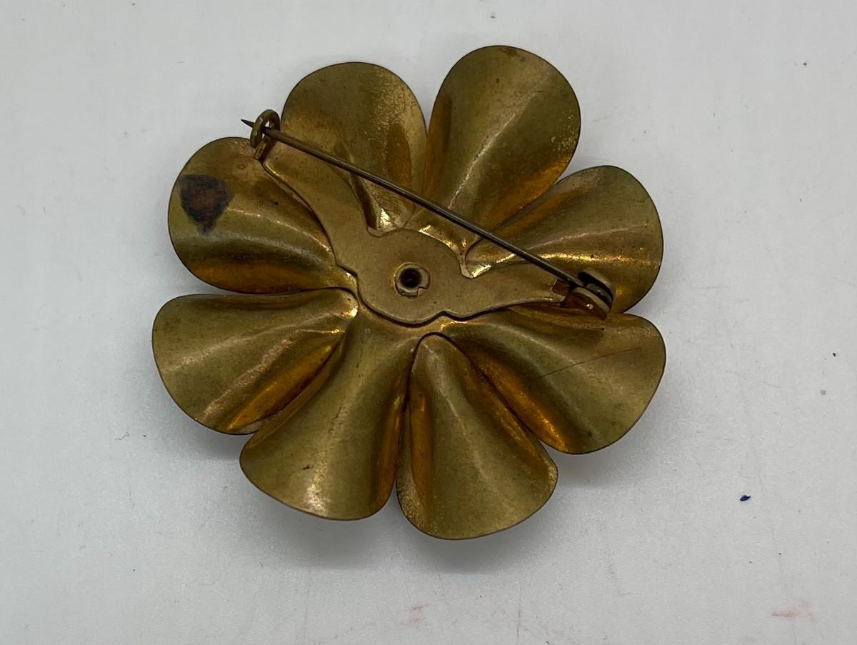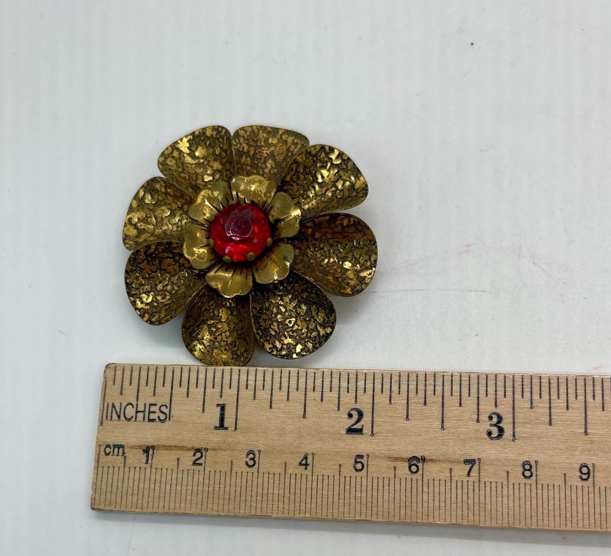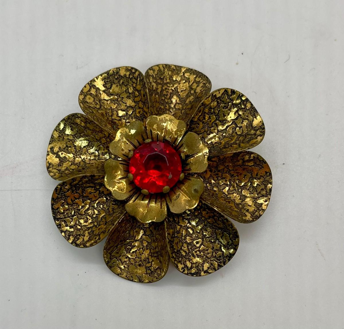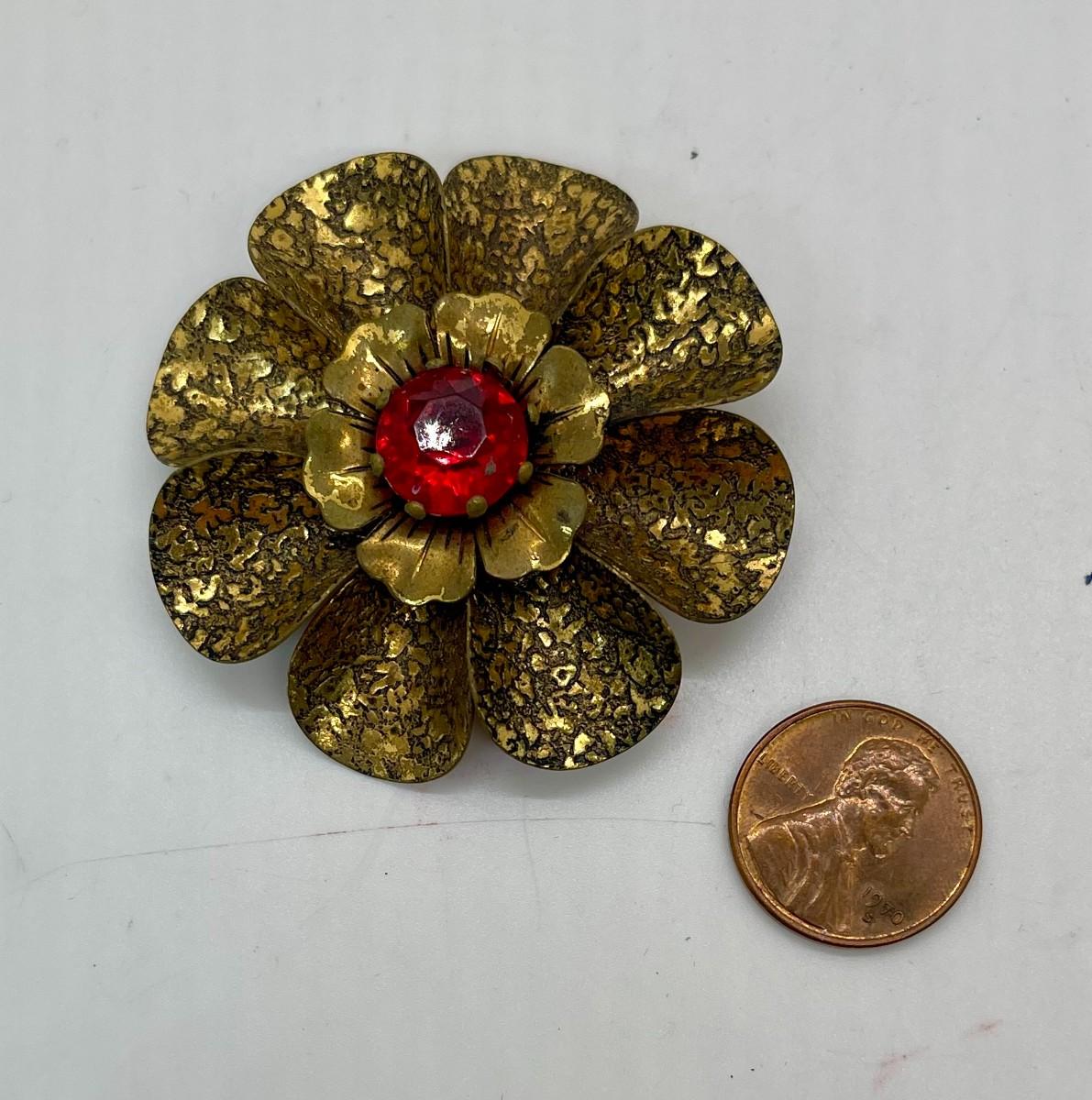Vintage Brooch or Pin Brass with Red-Orange Stone