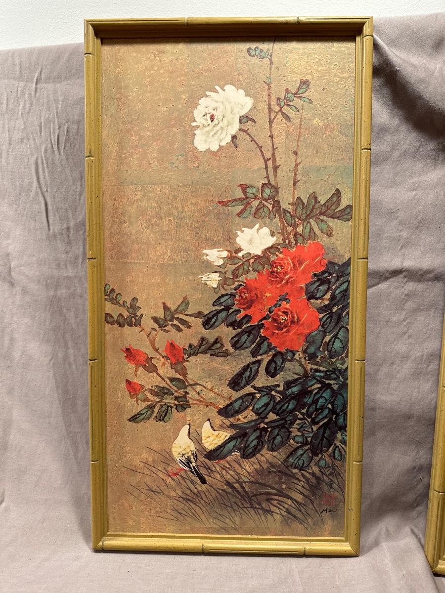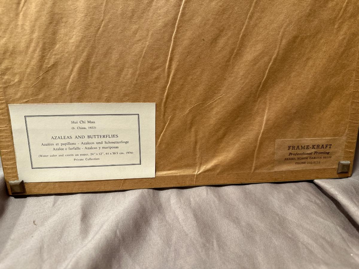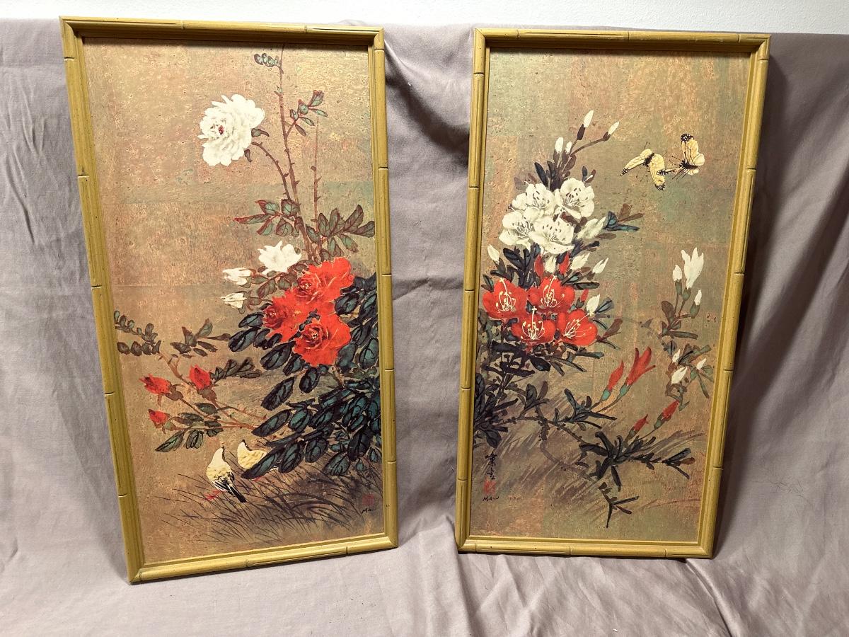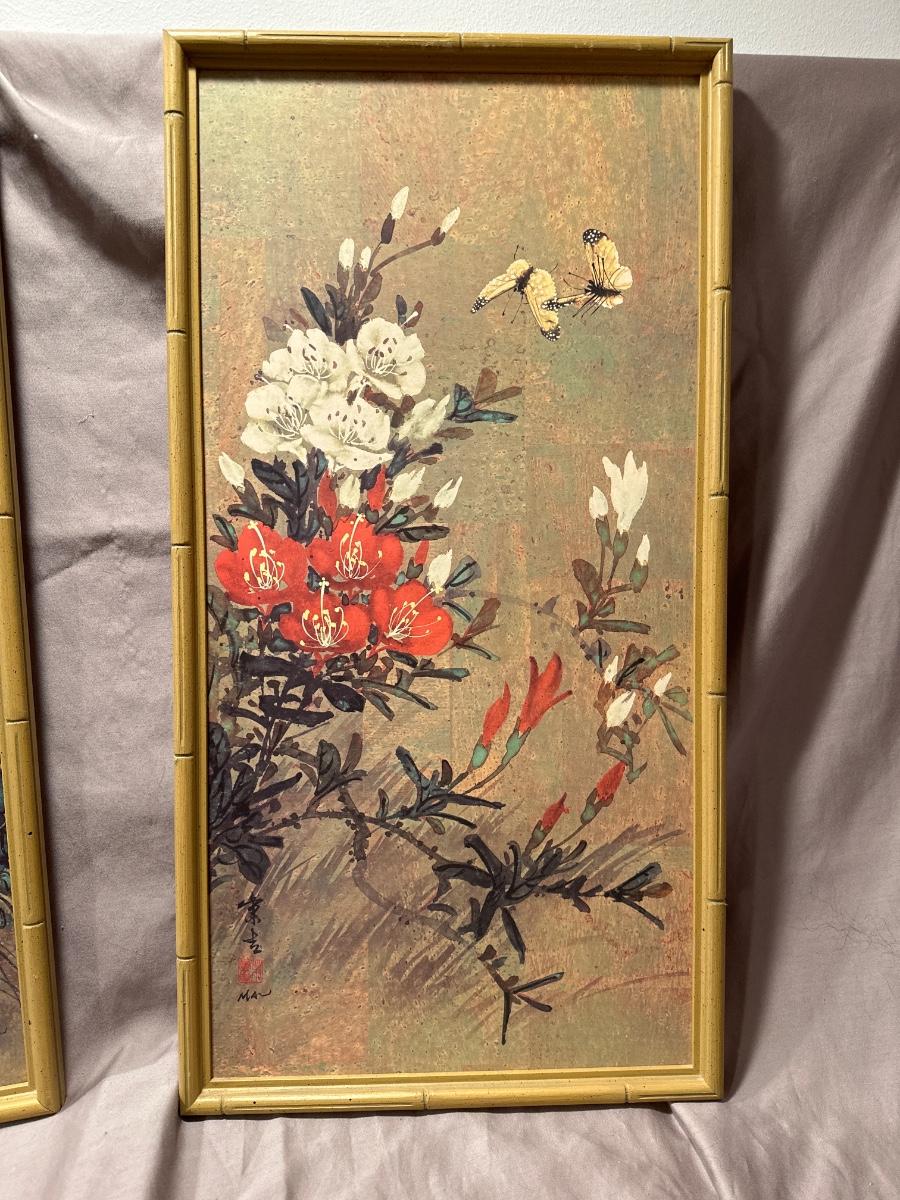 Two pieces both framed here in Fargo, finches and roses, and azaleas and butterflies.