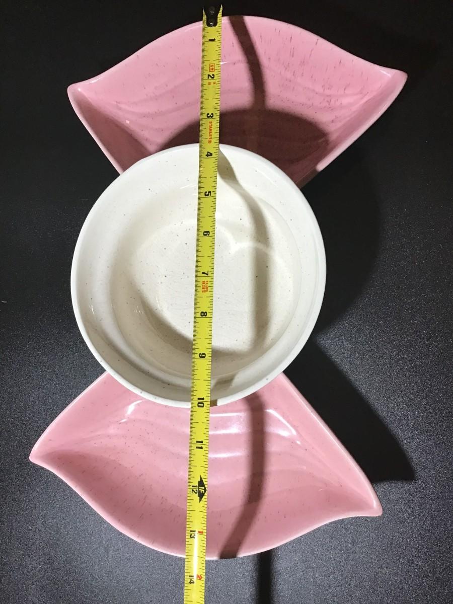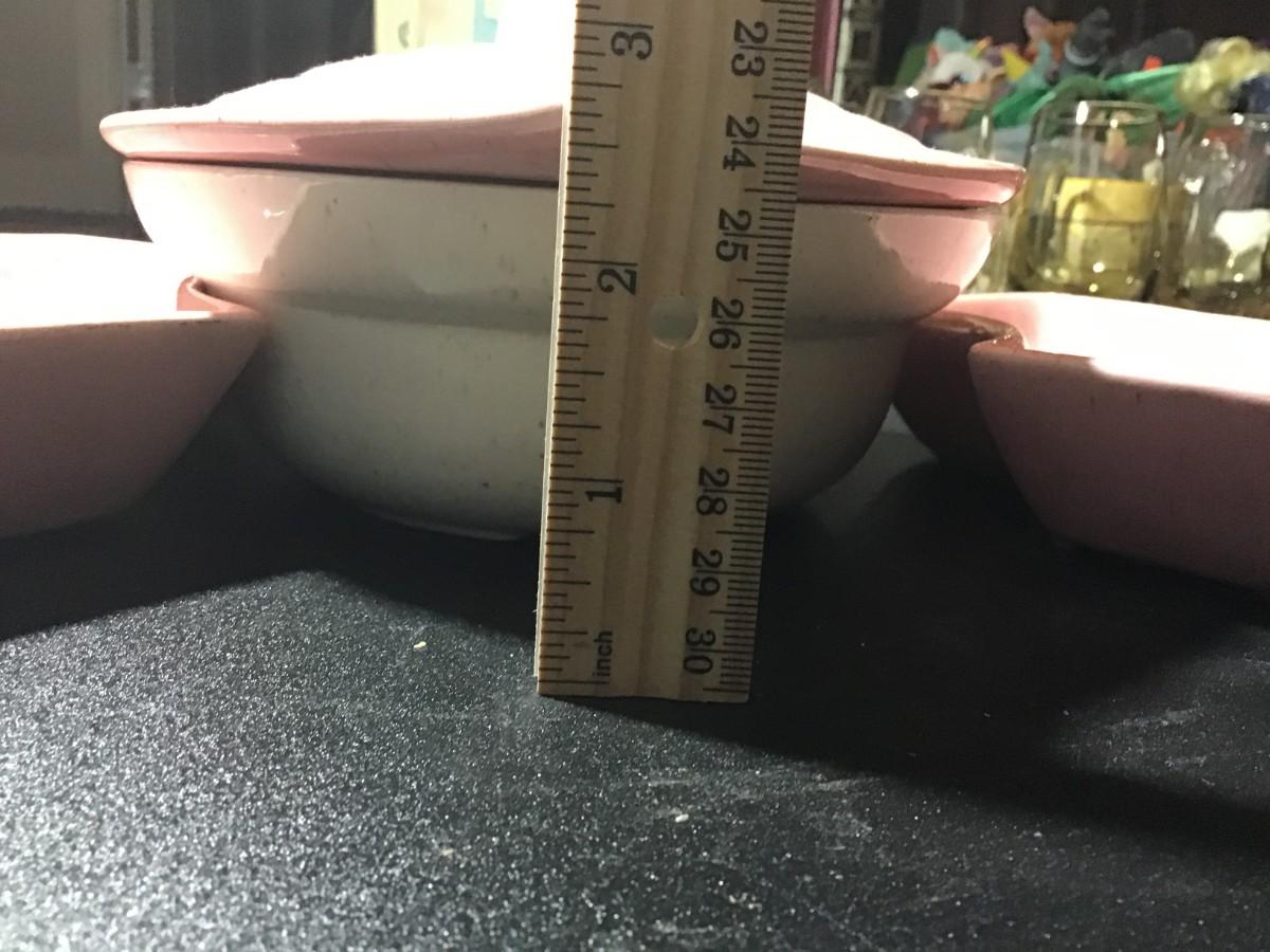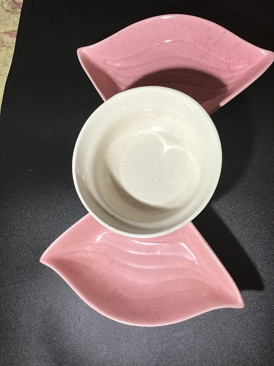 Comes as pictured; Missing two white dishes and the lazy susan; There are small chips on the pink dishes