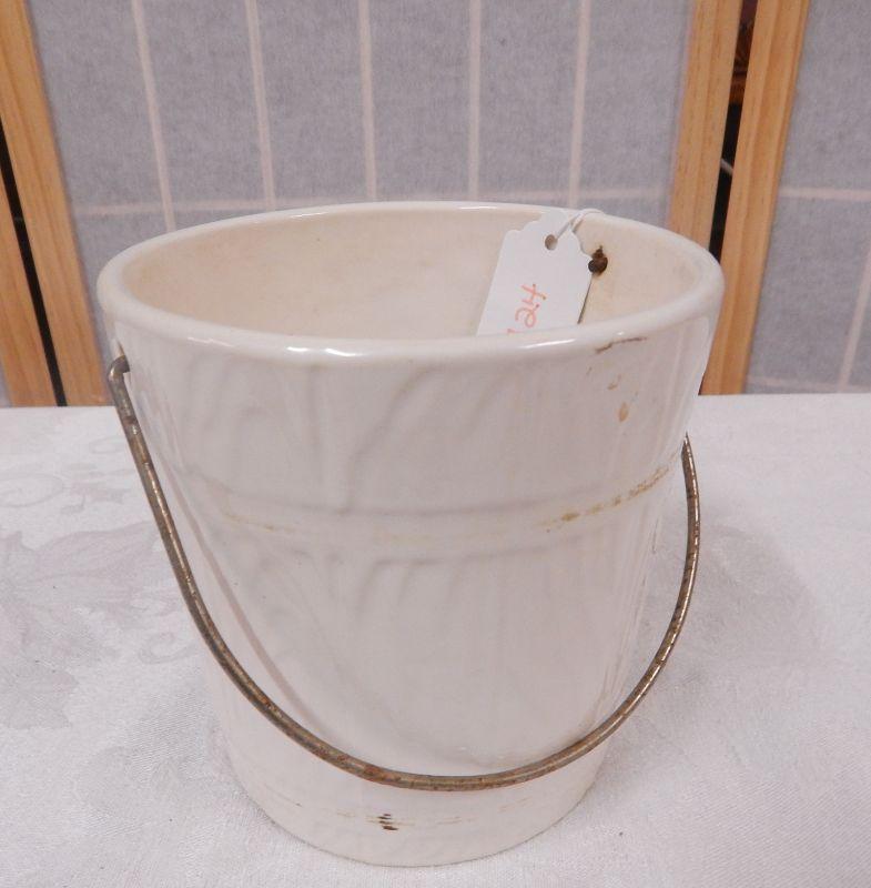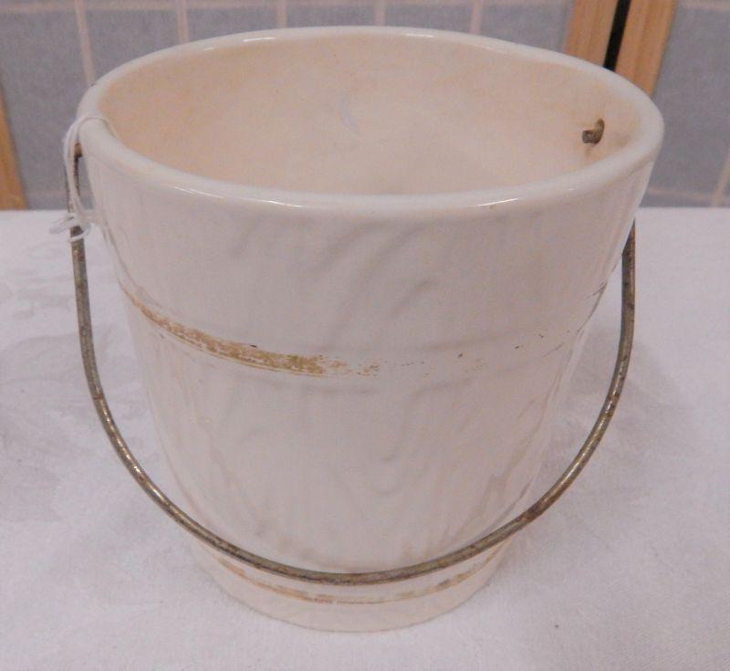 Hull Pottery White Bucket w/ Metal Handle - 5" Tall - 4" Bottom Diameter - Missing Metal Bands
