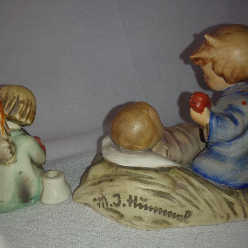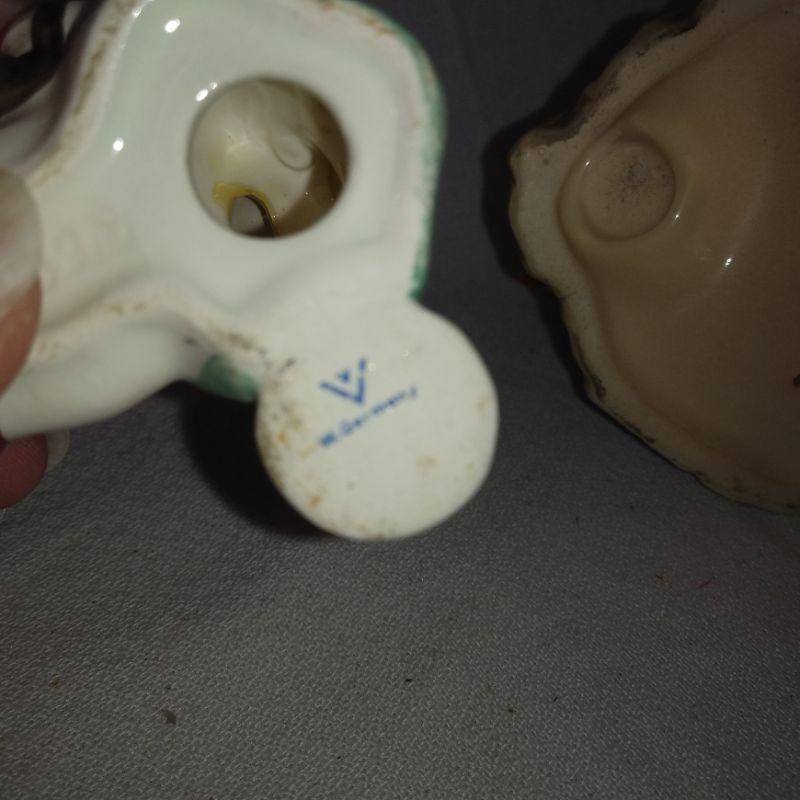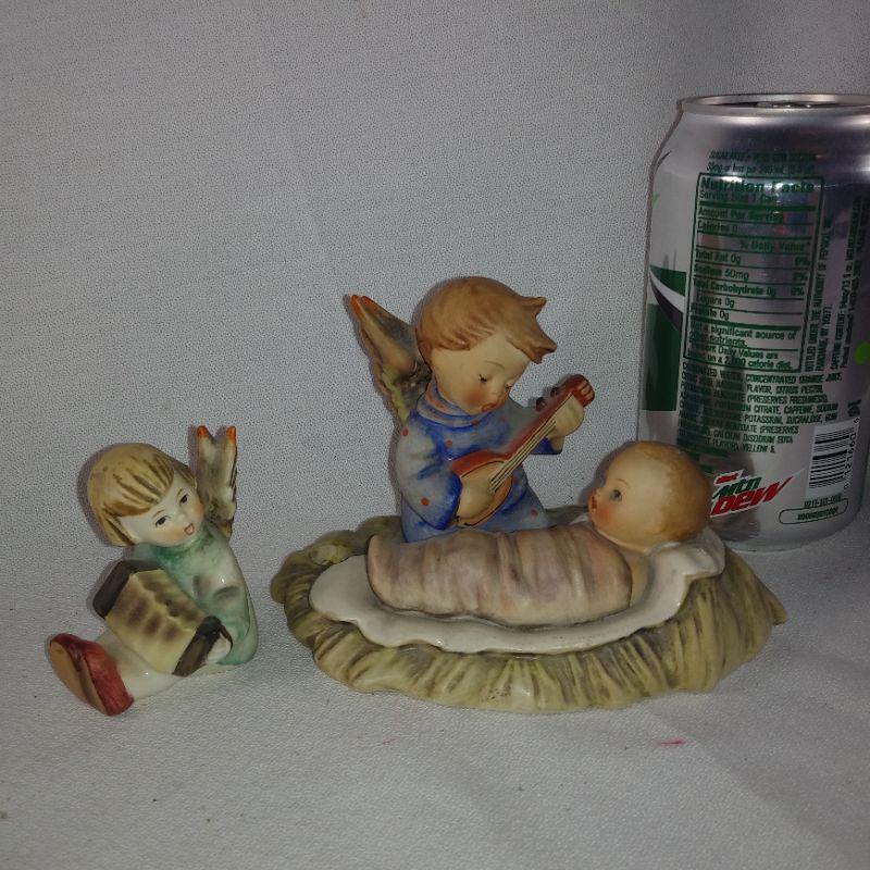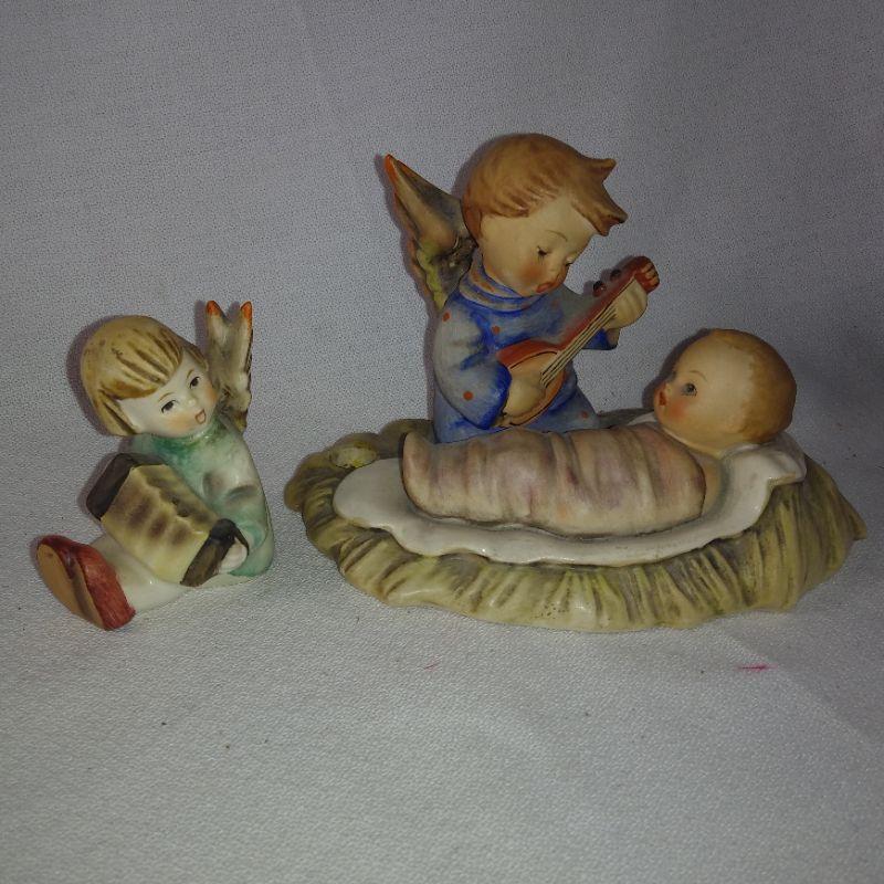 Pair of very sweet angles playing music to the Baby Jesus. Marked West Germany. Both pieces have a candle holder spot. The larger of the two is 5 1/2-inches long X 3 1/2-sinches tall the other is 2-inches long X 2 1/2-inches tall. Both are in very good condition - no chips or cracks.