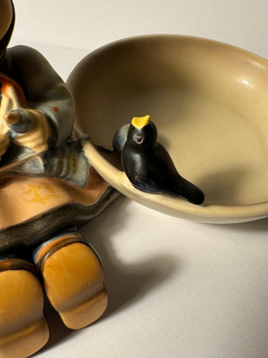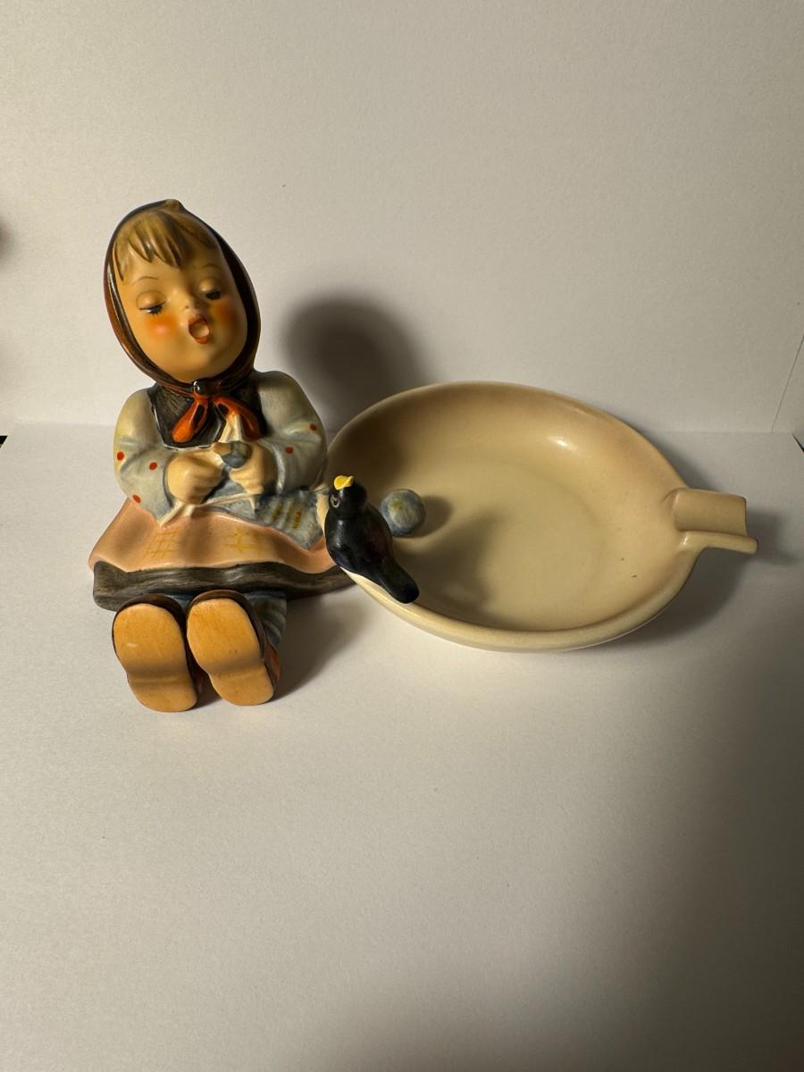 Hummel ashtray featuring a girl knitting and a bird. This particular Hummel piece is also known by the name "Happy Pastime". The ashtray is made of ceramic and was manufactured by Goebel in West Germany