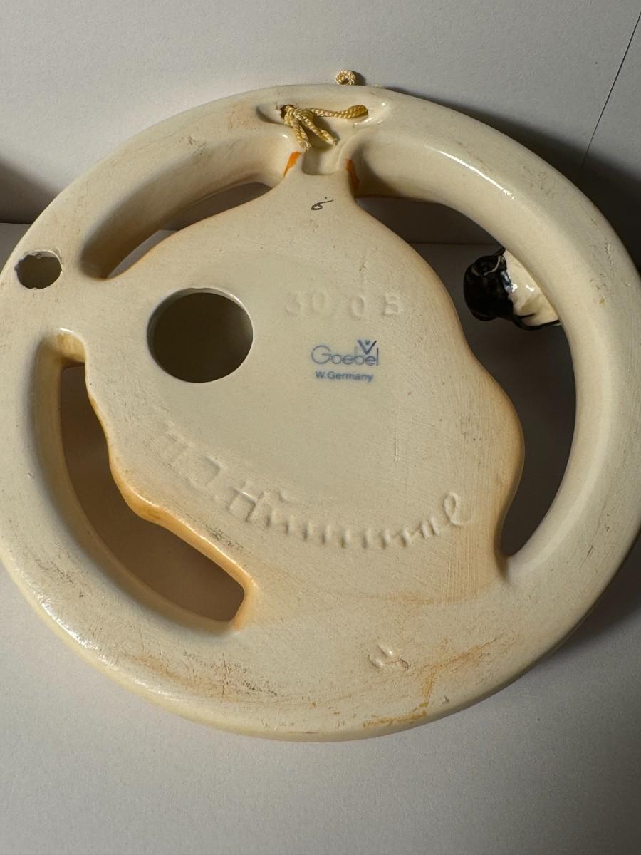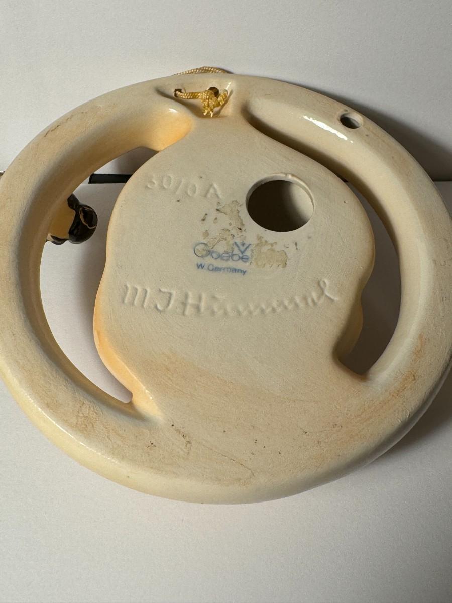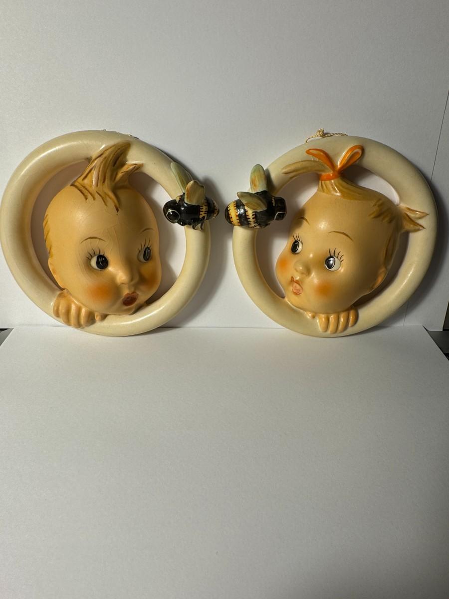 Goebel Hummel Ba-Bee Ring wall plaques. These wall plaques are part of the original Hummel Collection first released in 1935. The plaques are made of porcelain and feature a baby boy and girl looking at a bumblebee through a ring. The boy has dark blonde hair and hazel eyes, while the girl has an inquisitive expression. These plaques were designed by master sculptor Reinhold Unger. They typically measure around 5 inches in diameter. In excellent condition