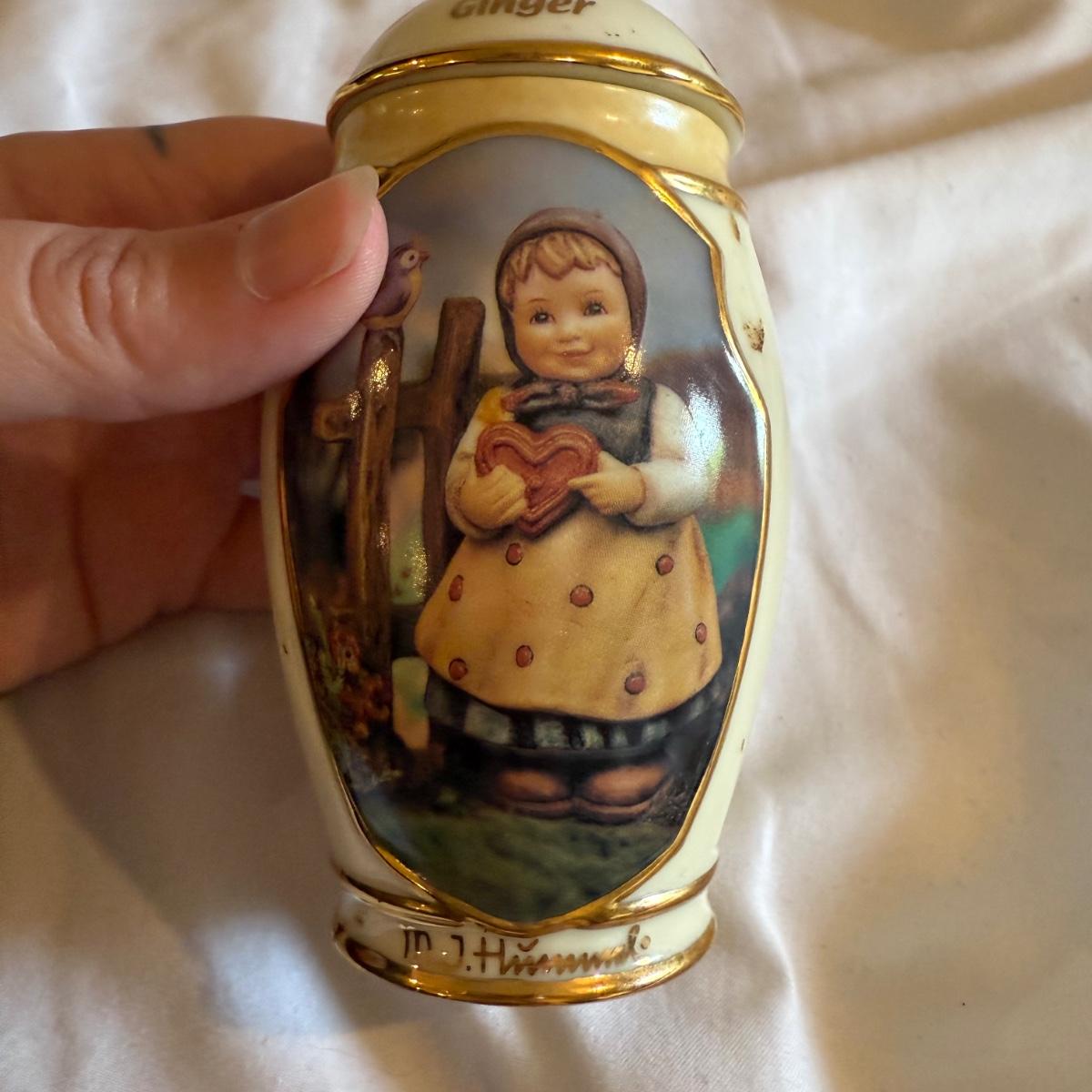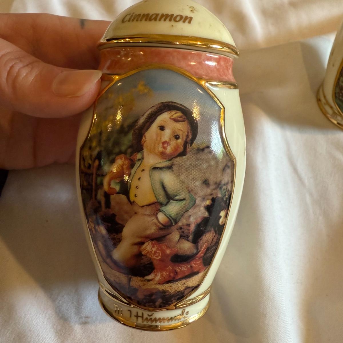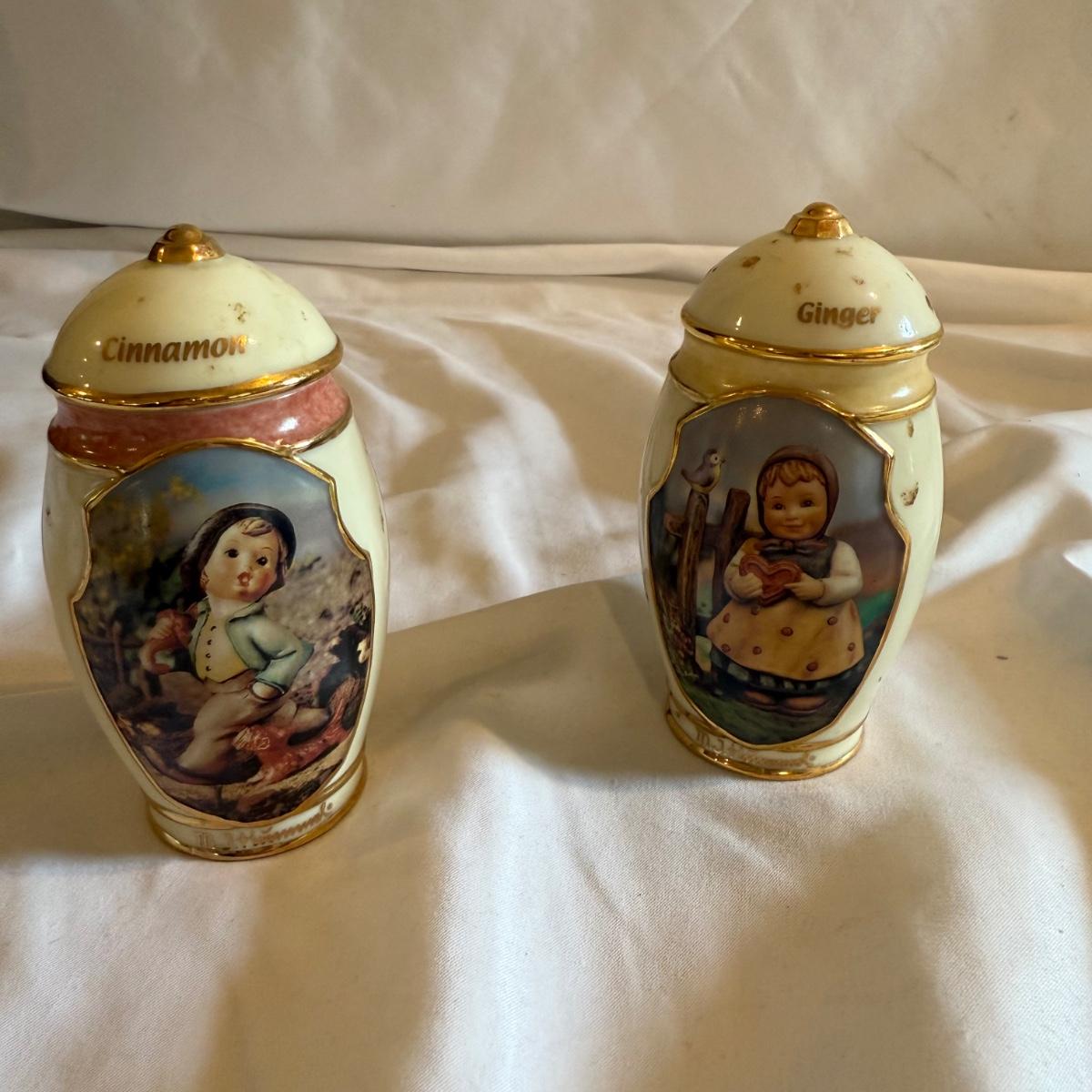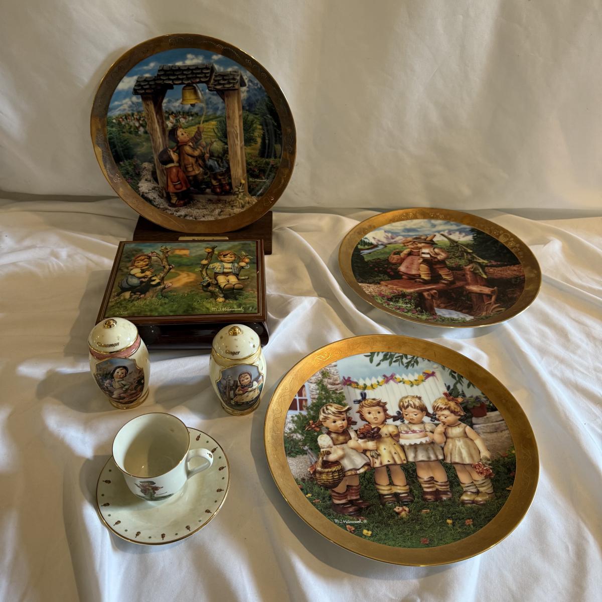This lot contains seven Hummel collectibles. There are three plates including one with its own stand. Two spice containers, one for ginger and one for cinnamon. Also included is a tea cup with saucer and a jewelry box. Starting with the plates they all have a 10.5”D. Each plate has a name and included in this collection is “We Wish You the Best”, “On Our Way”, and “Let’s Tell the World” which comes with its own wooden stand which measures 8” x 4”. Next we have the spice containers, both of which have tops with a rubber stopper to hold them in place. Each one measures approximately 2.5” x 4.5”H. Next is a tea cup and saucer called “Little Fiddler”. The saucer has a 4.75”D and the cup has a 2.5”D mouth and stands 2.5”H. Last is the wood jewelry box, the lid's hinges have broken off and so it is detached and the music doesn’t work. The image is called “Apple Tree Boy & Girl” and it measures 7” x 6” x 2.75”H. Shipping available.