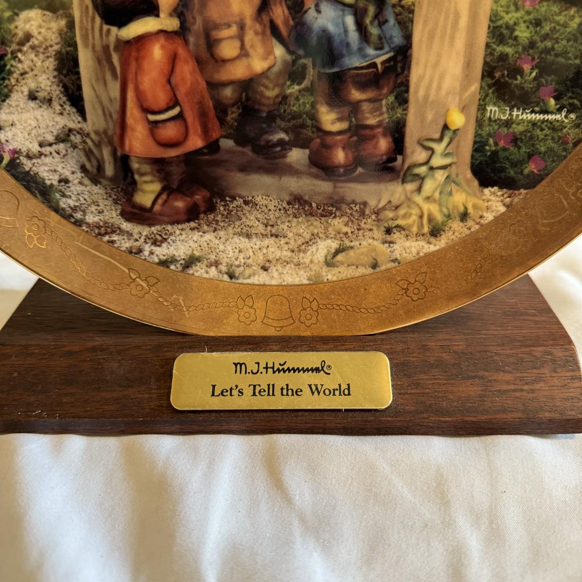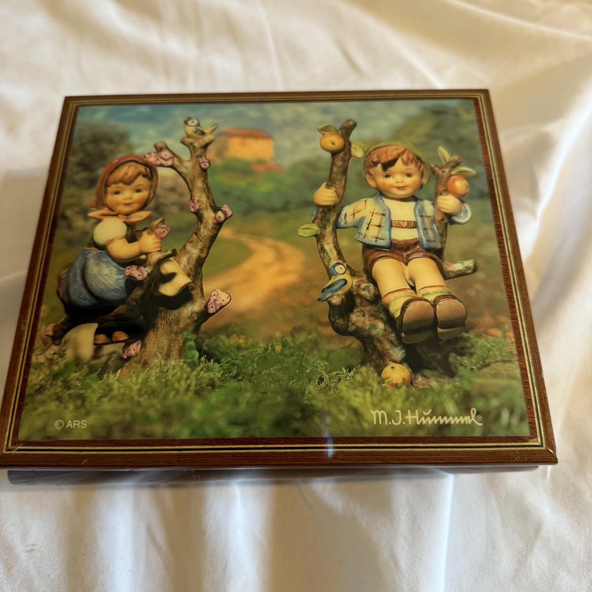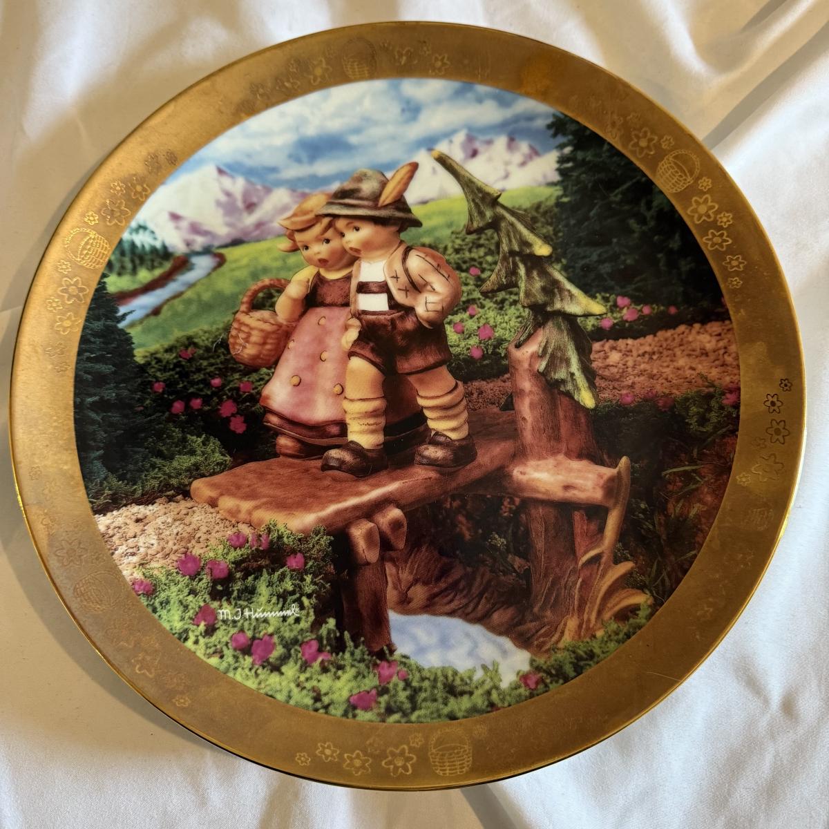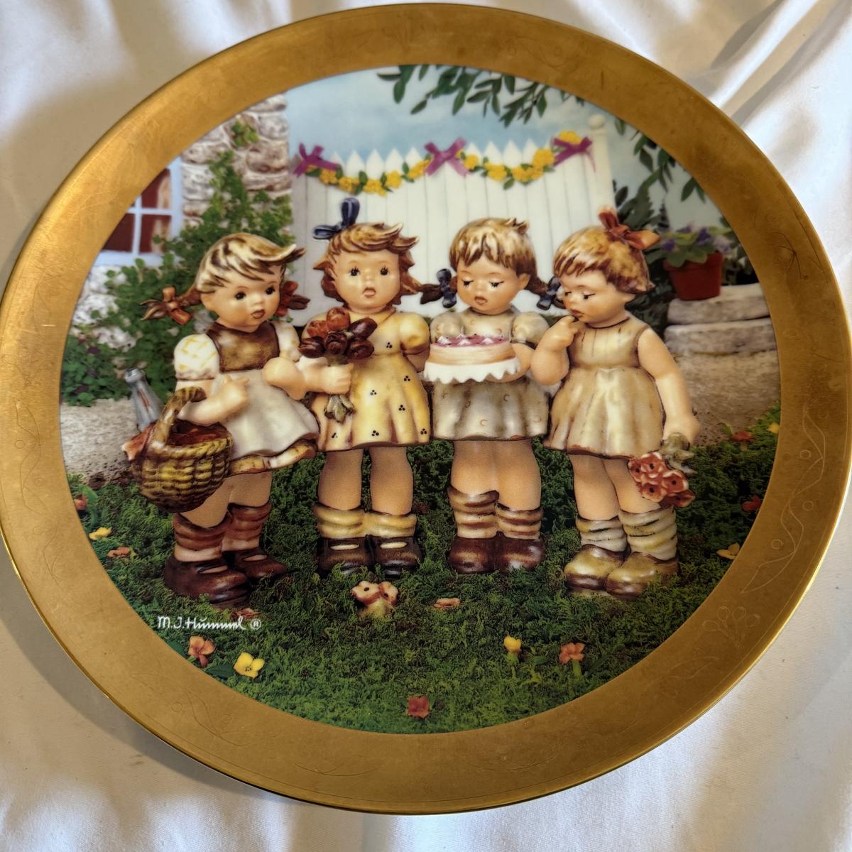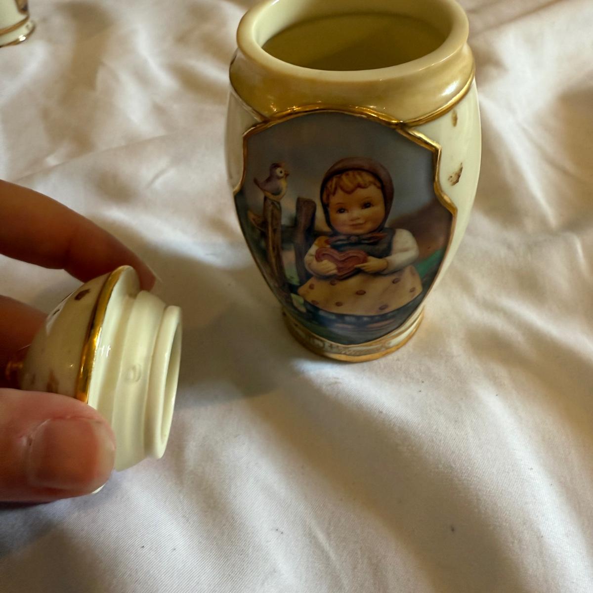 This lot contains seven Hummel collectibles. There are three plates including one with its own stand. Two spice containers, one for ginger and one for cinnamon. Also included is a tea cup with saucer and a jewelry box. Starting with the plates they all have a 10.5”D. Each plate has a name and included in this collection is “We Wish You the Best”, “On Our Way”, and “Let’s Tell the World” which comes with its own wooden stand which measures 8” x 4”. Next we have the spice containers, both of which have tops with a rubber stopper to hold them in place. Each one measures approximately 2.5” x 4.5”H. Next is a tea cup and saucer called “Little Fiddler”. The saucer has a 4.75”D and the cup has a 2.5”D mouth and stands 2.5”H. Last is the wood jewelry box, the lid's hinges have broken off and so it is detached and the music doesn’t work. The image is called “Apple Tree Boy & Girl” and it measures 7” x 6” x 2.75”H. Shipping available.