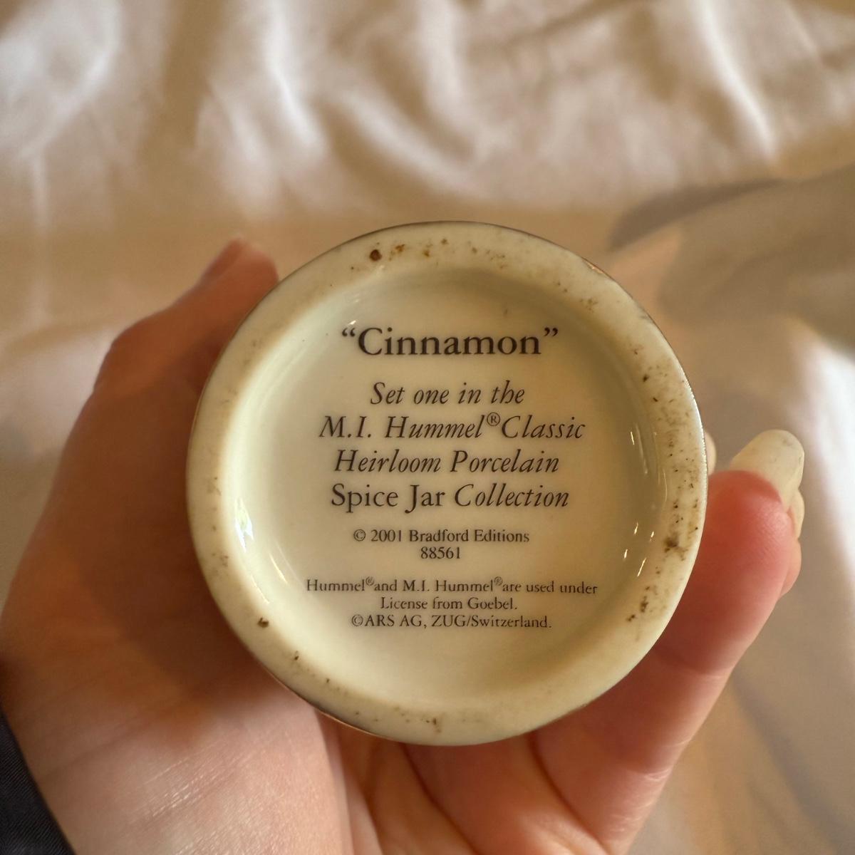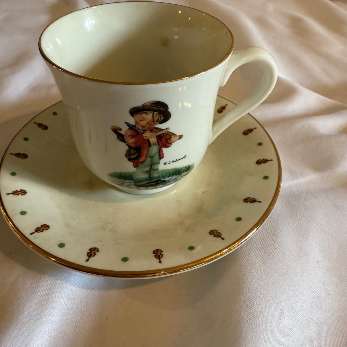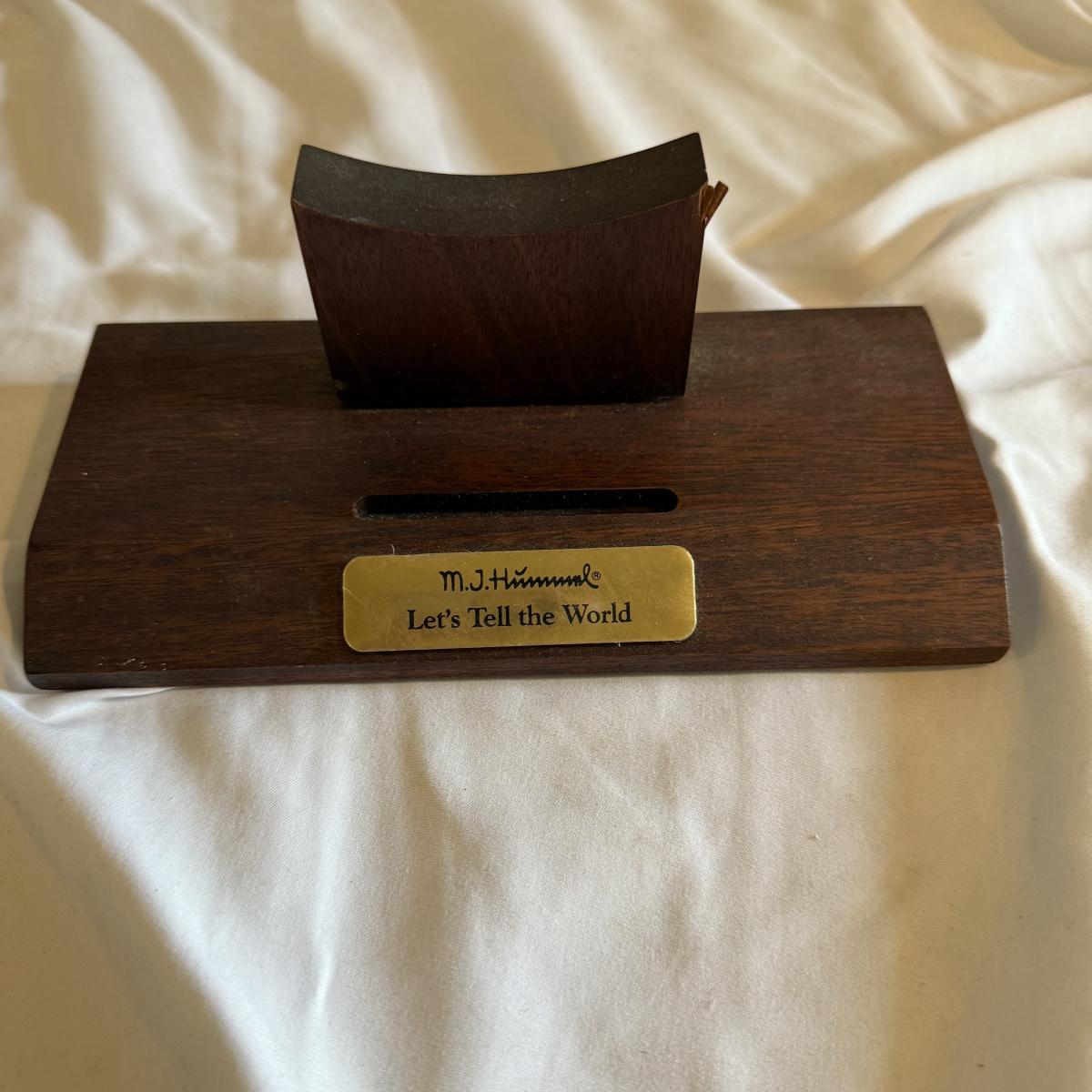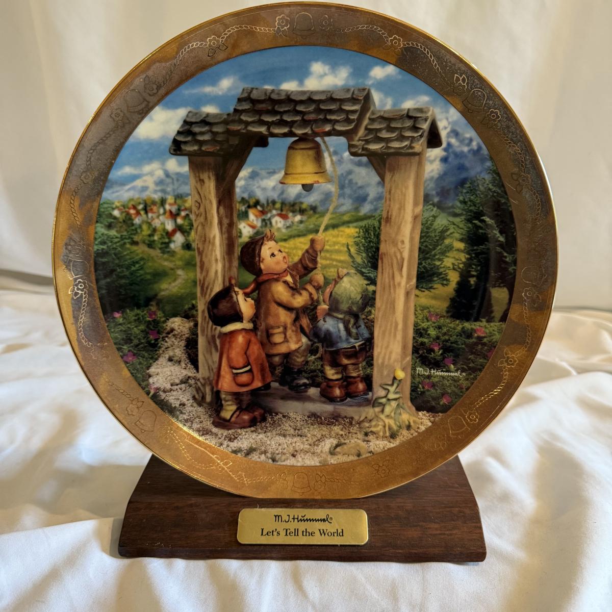 This lot contains seven Hummel collectibles. There are three plates including one with its own stand. Two spice containers, one for ginger and one for cinnamon. Also included is a tea cup with saucer and a jewelry box. Starting with the plates they all have a 10.5”D. Each plate has a name and included in this collection is “We Wish You the Best”, “On Our Way”, and “Let’s Tell the World” which comes with its own wooden stand which measures 8” x 4”. Next we have the spice containers, both of which have tops with a rubber stopper to hold them in place. Each one measures approximately 2.5” x 4.5”H. Next is a tea cup and saucer called “Little Fiddler”. The saucer has a 4.75”D and the cup has a 2.5”D mouth and stands 2.5”H. Last is the wood jewelry box, the lid's hinges have broken off and so it is detached and the music doesn’t work. The image is called “Apple Tree Boy & Girl” and it measures 7” x 6” x 2.75”H. Shipping available.
