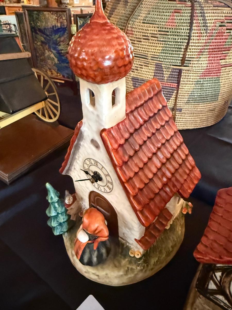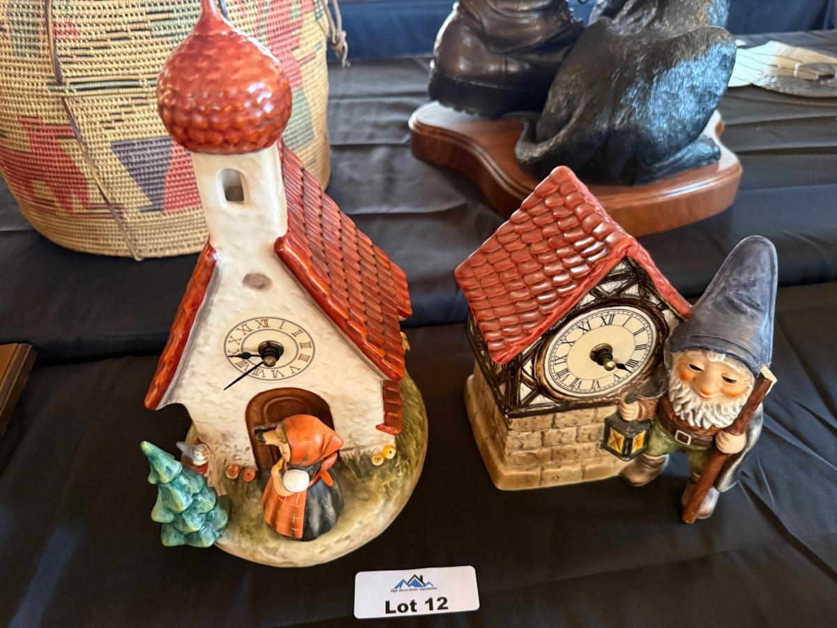 signed hummel clocks The Love Lives on Chapel and gnome one Conny Night watchman is missing a hand on clock and we also do have other hummels in auction