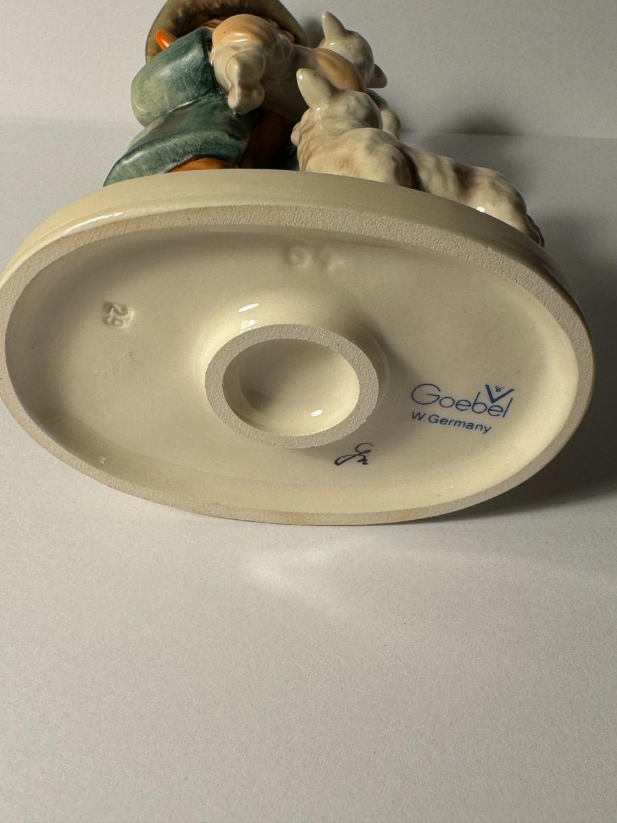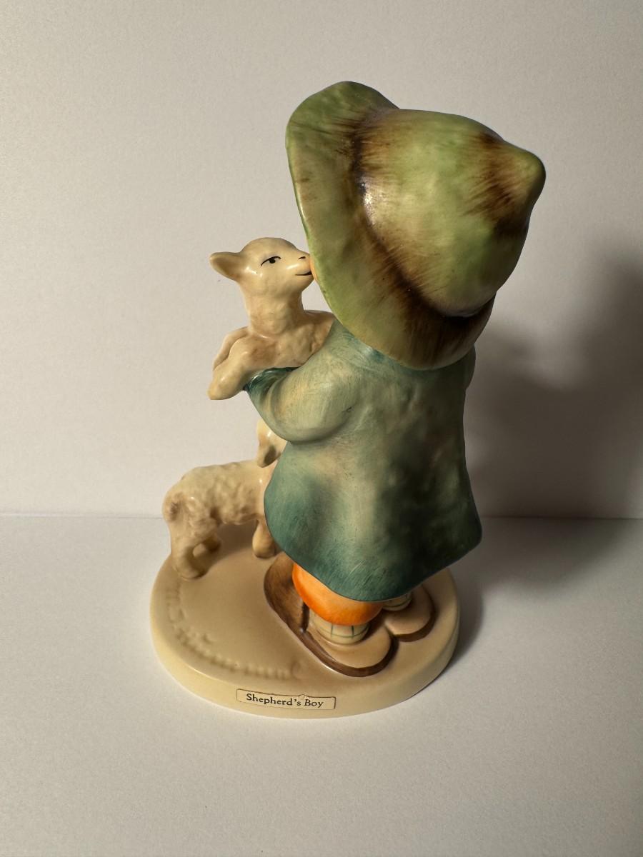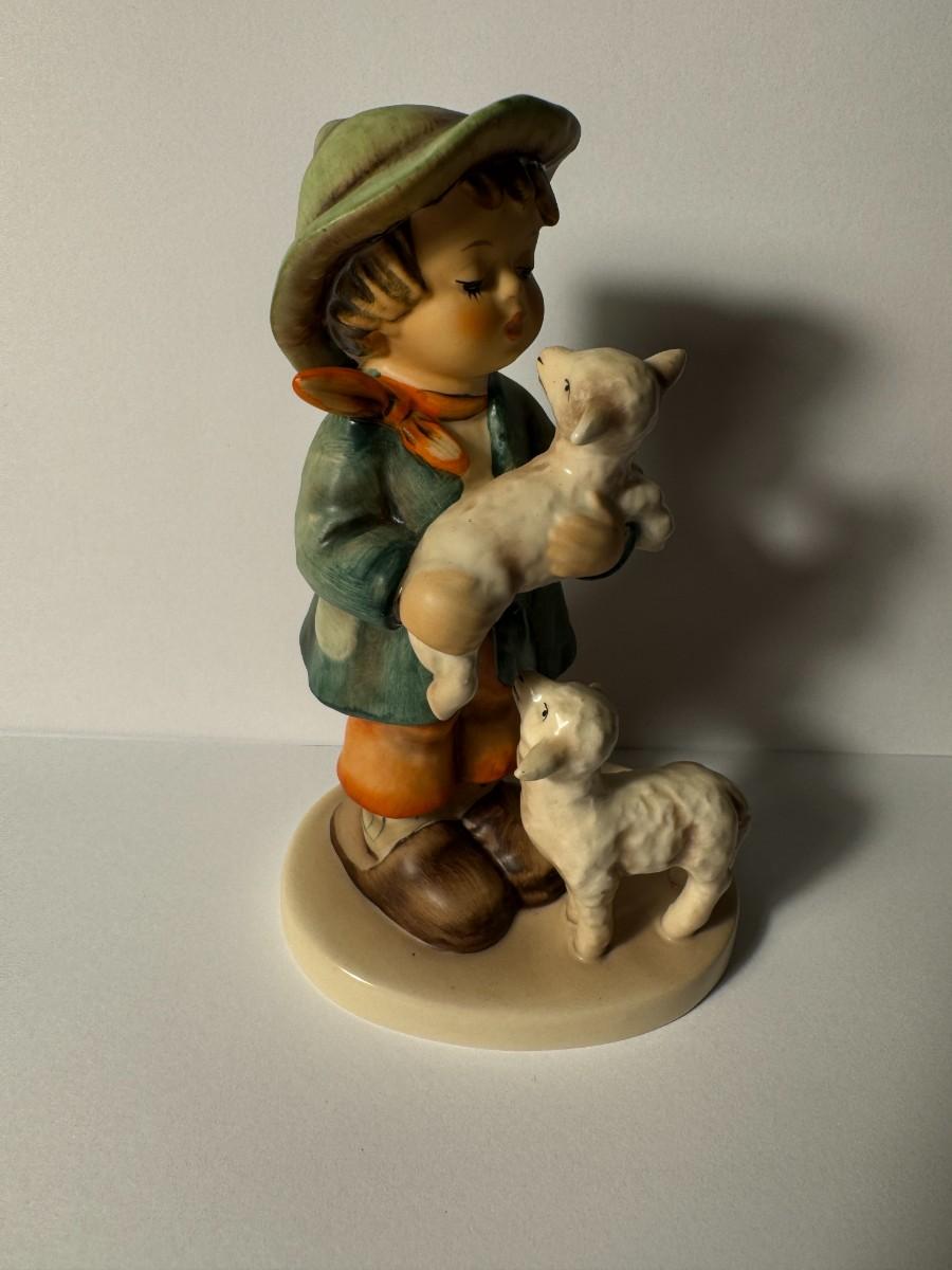 Hummel figurine titled "Shepherd's Boy", also known as "The Good Shepherd", number 64. This collectible figurine was designed by Arthur Möeller in 1937 and possibly remodeled by Gerhard Skrobek in the 1960s. It features a young boy, a shepherd, holding one lamb and with another at his feet. It depicts a scene that portrays the gentle spirit of childhood and the serenity of pastoral life.