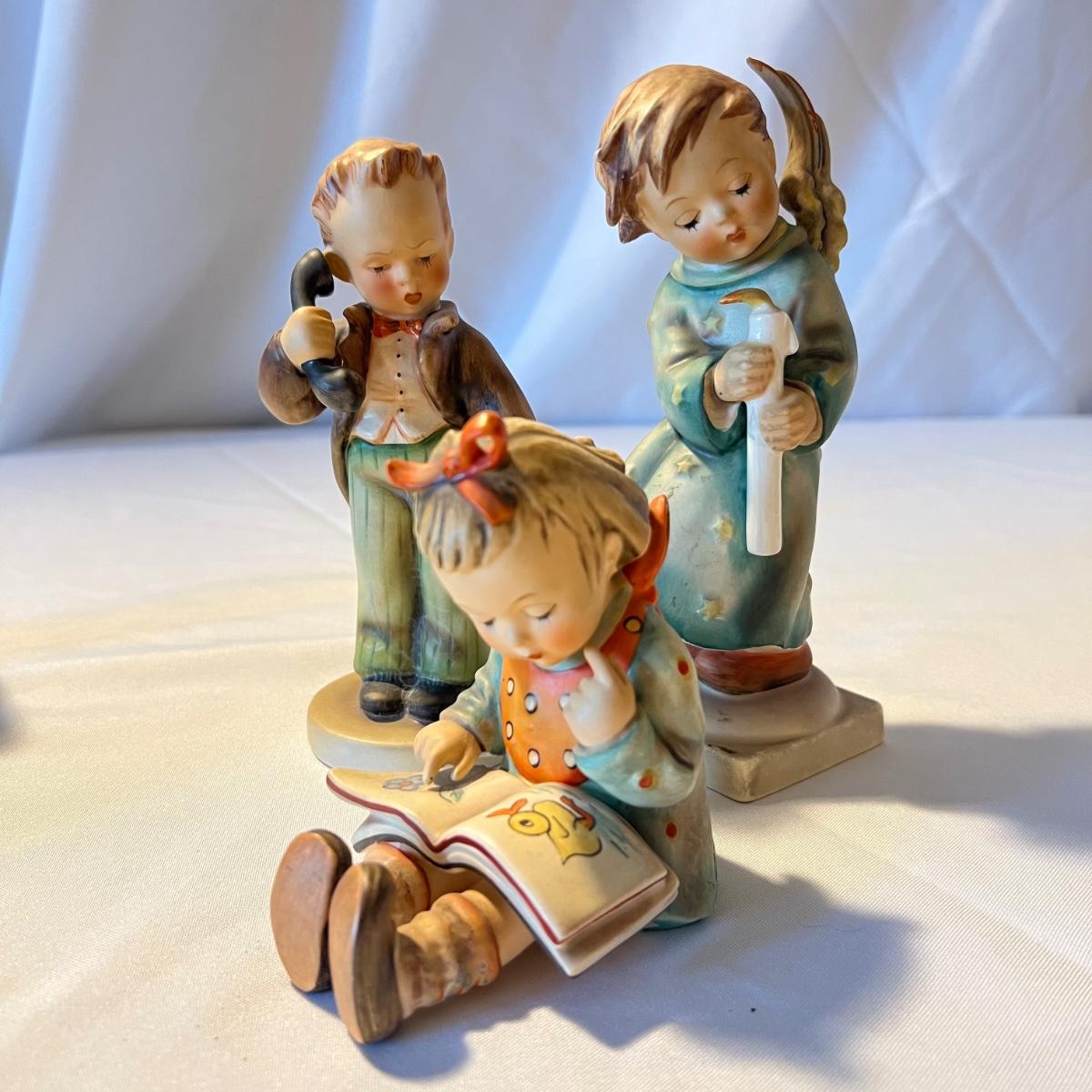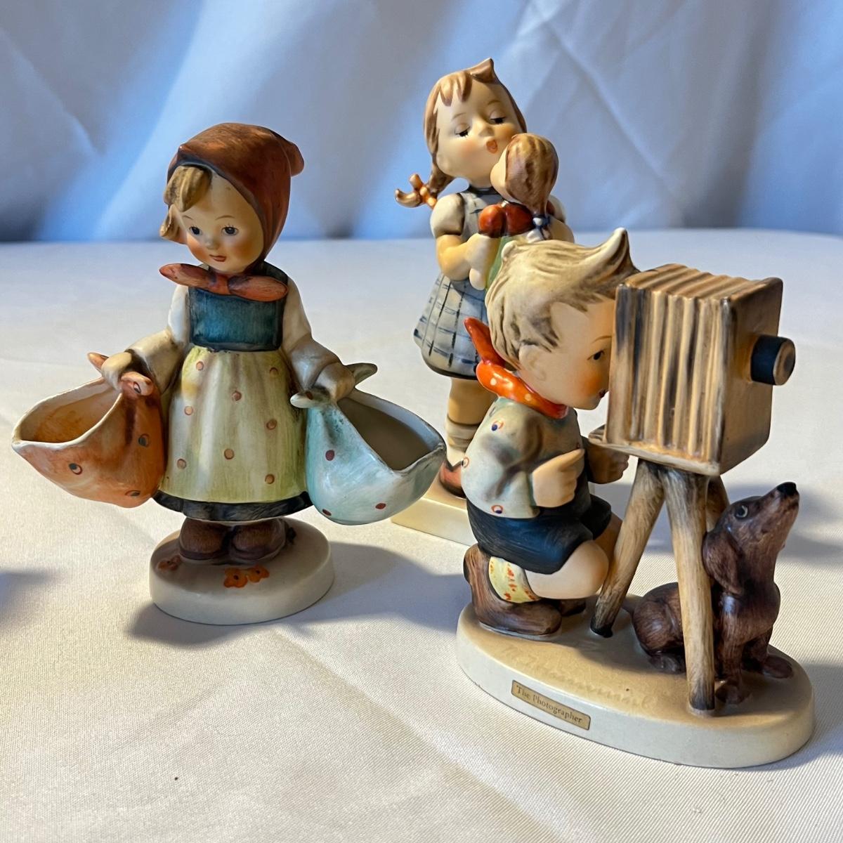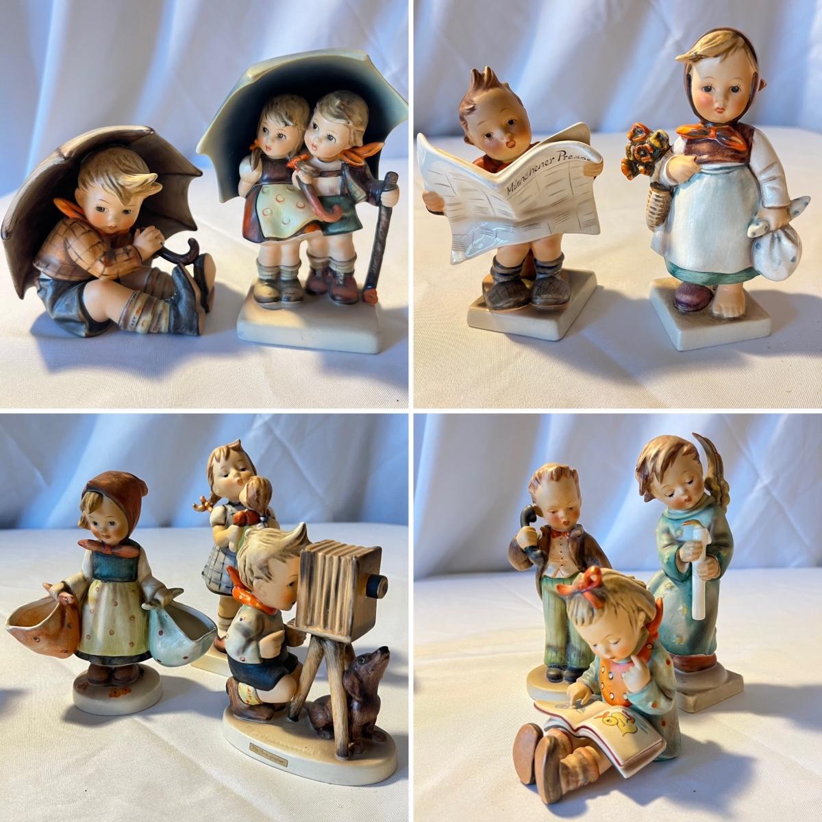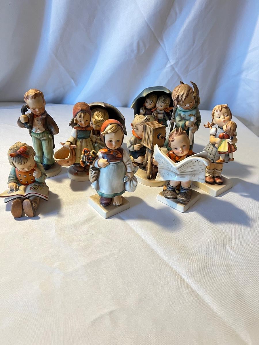 Ten Hummel ceramic/porcelain figurines. See photos for more information. Tallest one measures 2.5” square (base) x 8”H.