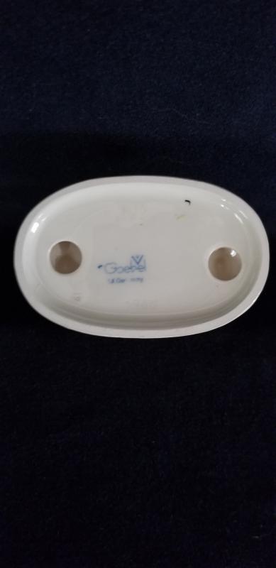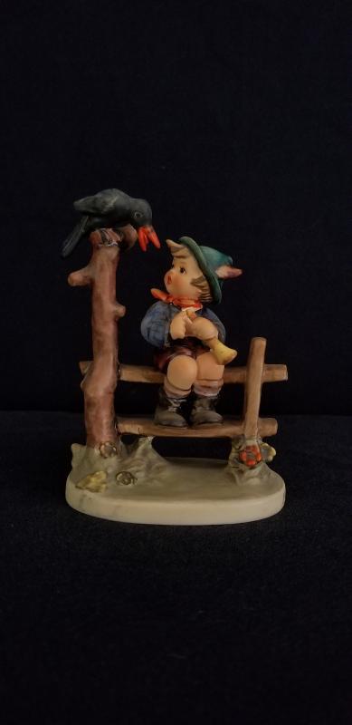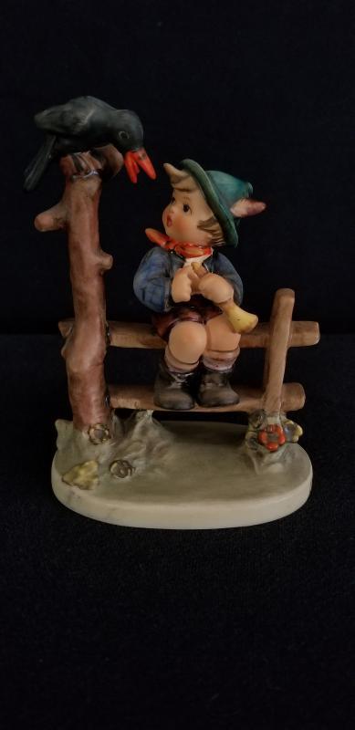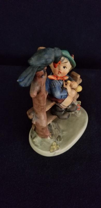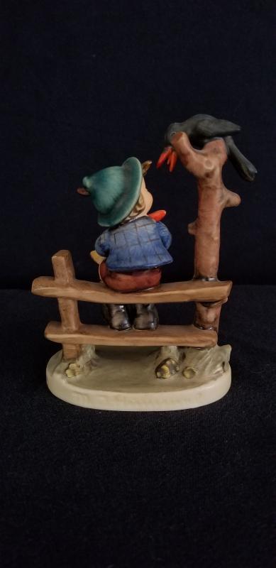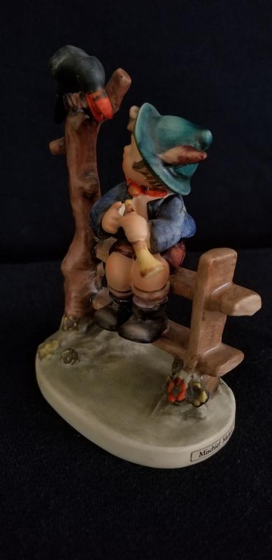 This Hummel stands 5" tall and weighs 6.1 oz. On the bottom it is incised with a number and stamped in blue with a V and bumblebee and the word Goebel + W Germany. Marking identifies this piece as produced between 1972-1979.
