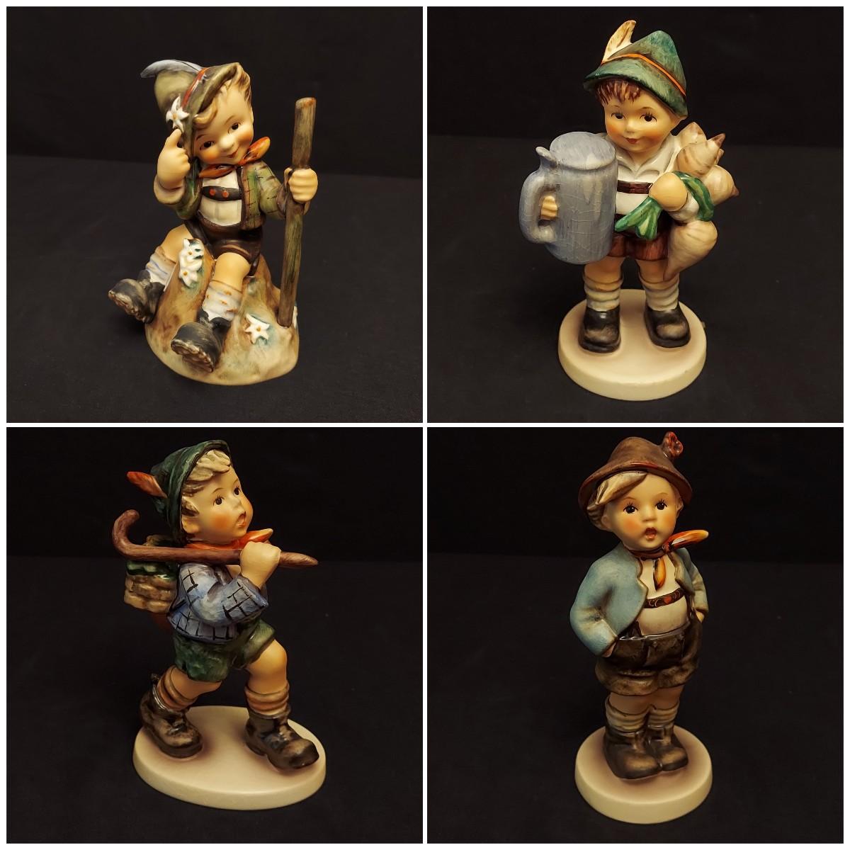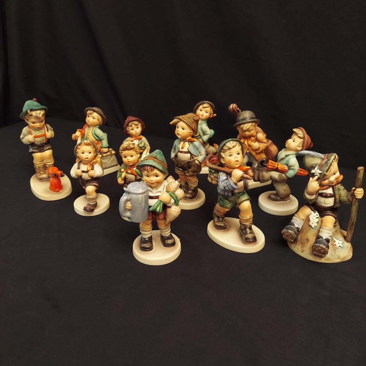 Lot includes 12 Hummel figurines like The Mountaineer, The Run-a-way, For Father and more. The Mountaineer is 3"D x 5"H. Some pieces are stamped with the date the form was originally released. See trademark image for a more accurate approximation of age. Please see photos for further details. Shipping available