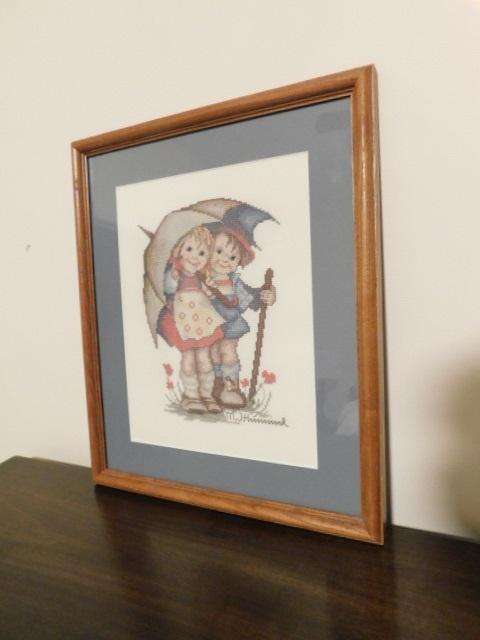 Hummel Needlework Framed Sharing an Umbrella 12"x15'