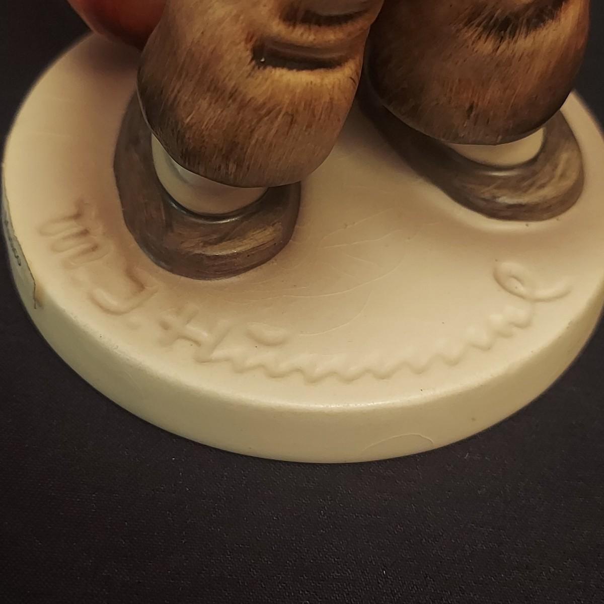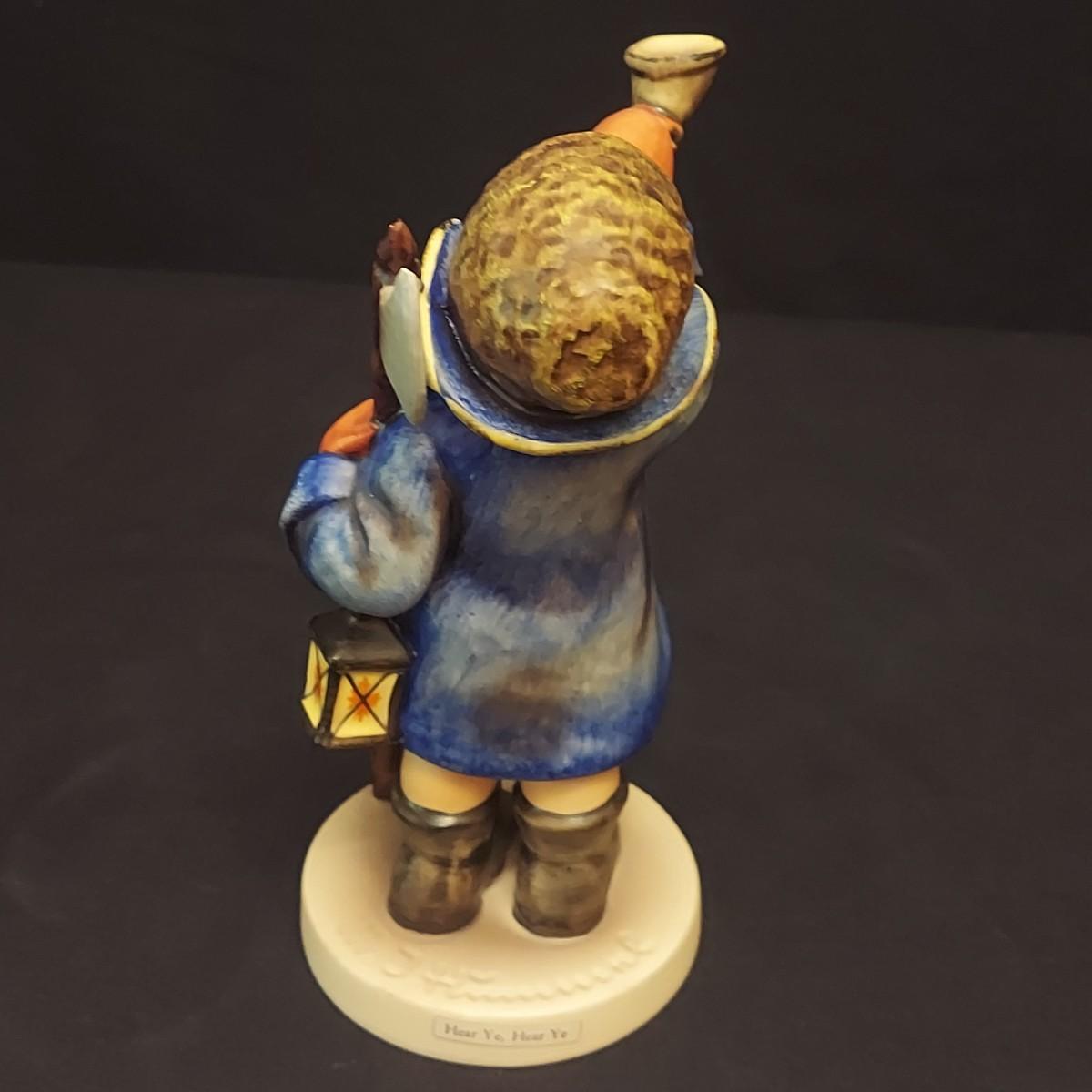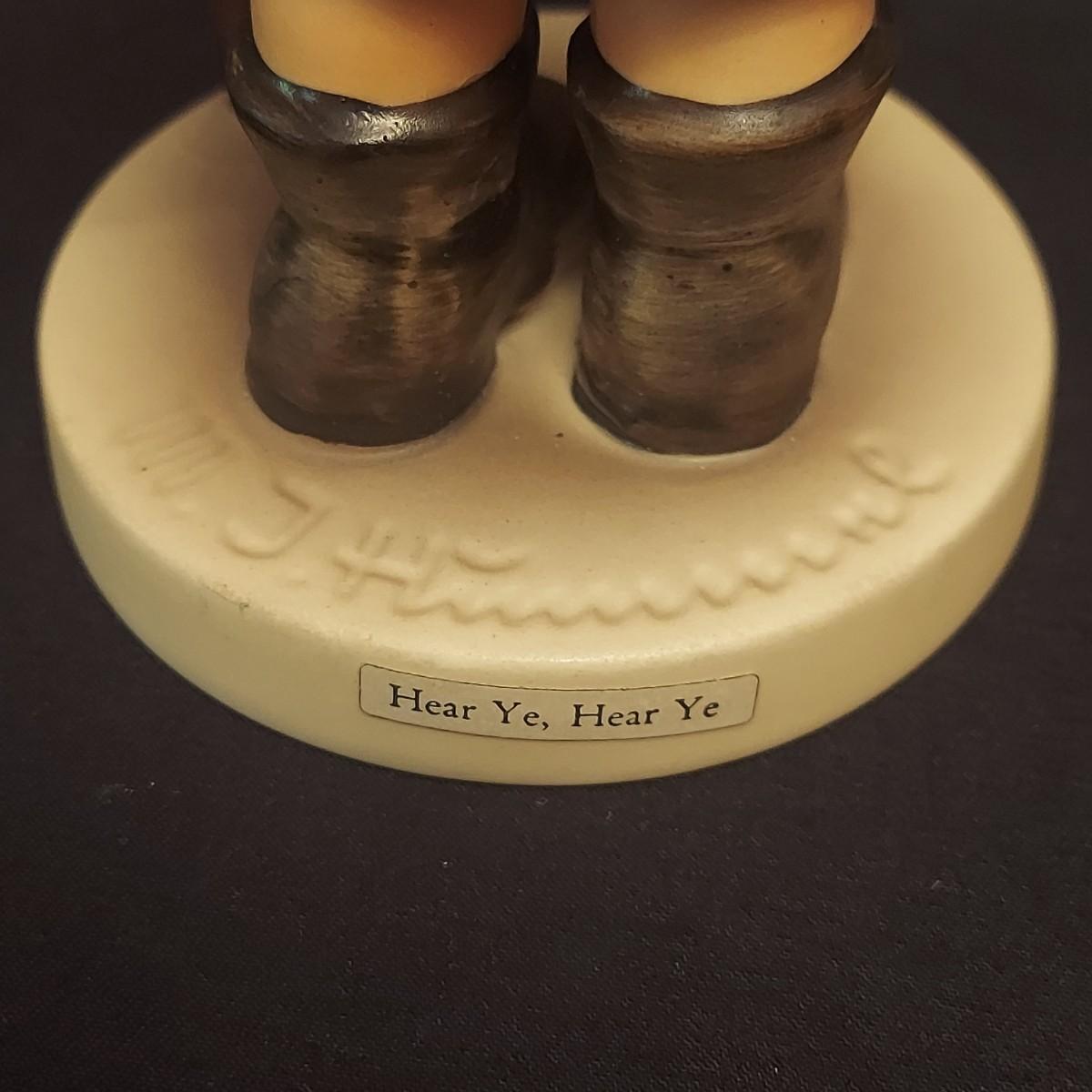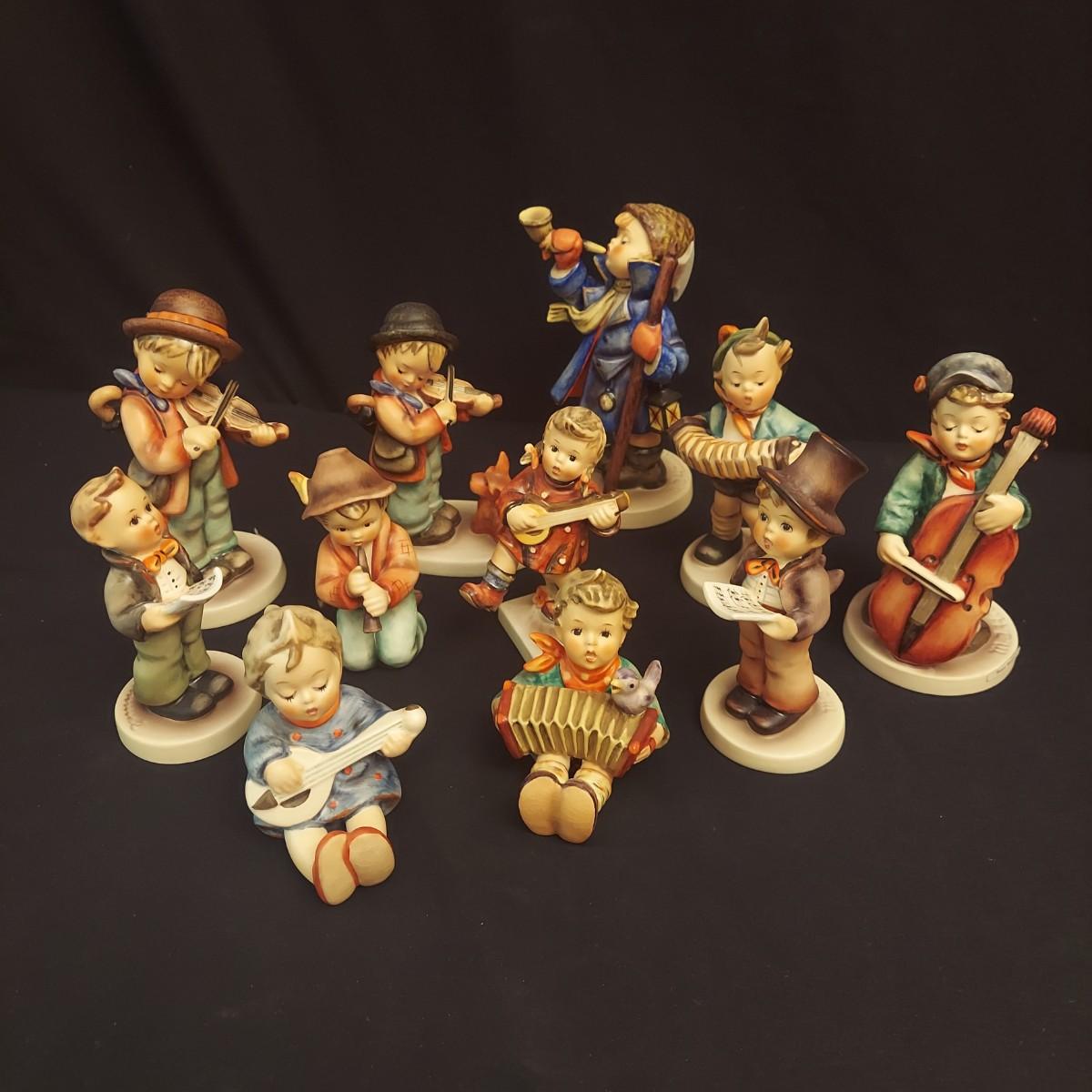 Lot includes 11 Hummel figurines like Street Singer and Soloist. The Hear Ye, Hear Ye figure is the largest at 3"D x 6"H. Some pieces are stamped with the date the form was originally released. See trademark image for a more accurate approximation of age. Please see photos for further details. Shipping available