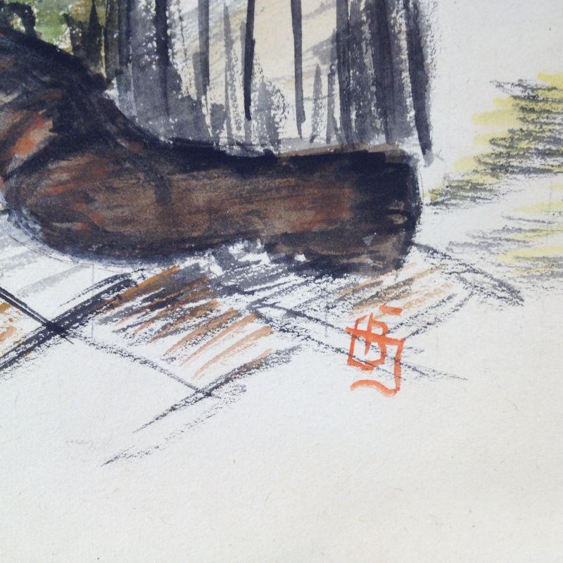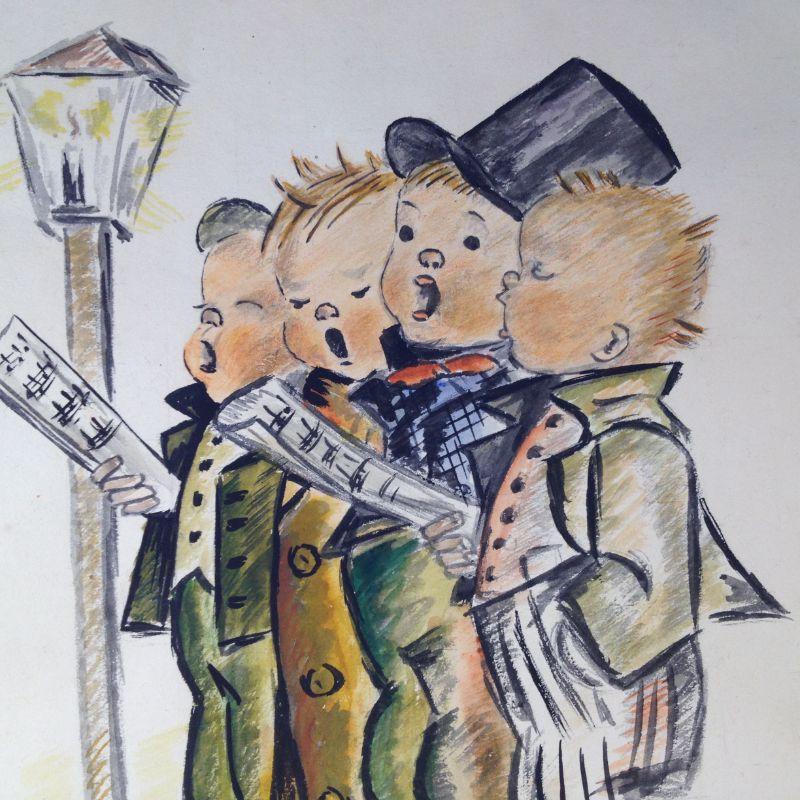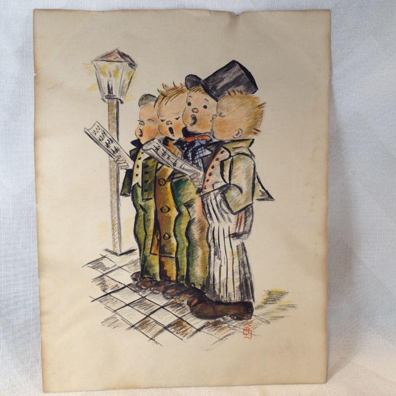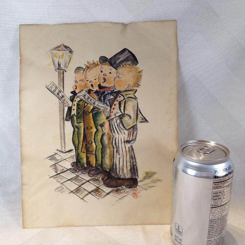 This auction lot is for a wonderful Drawing of Hummel-Style Children Carolers. It looks to be ink and watercolor. It is signed - see photo - but the mark is unknown to us. It shows yellowing and age. It measures about 8-inches X 10.5-inches.