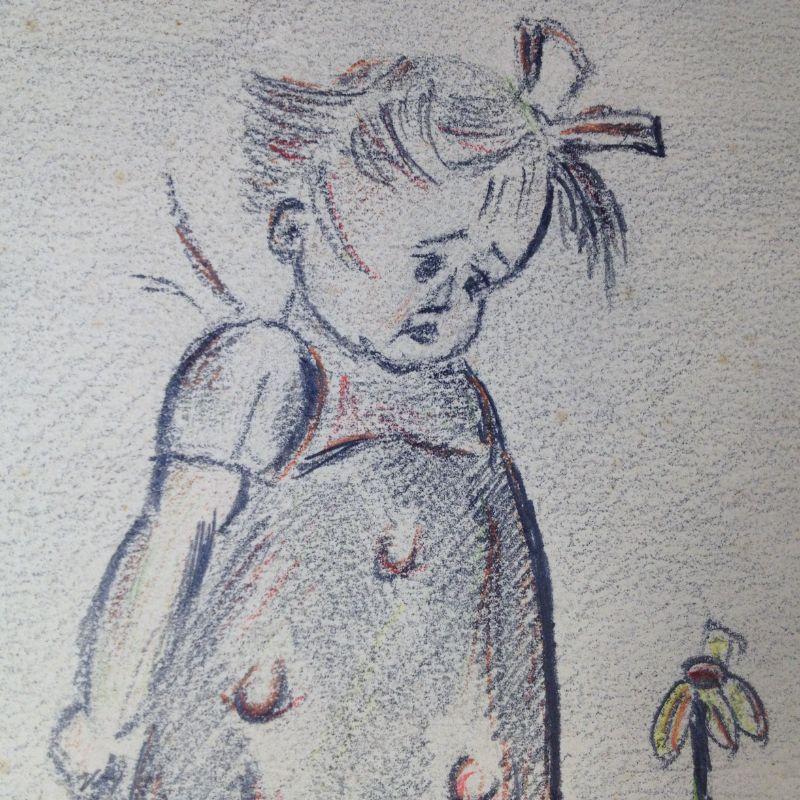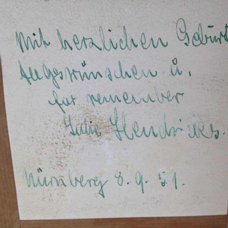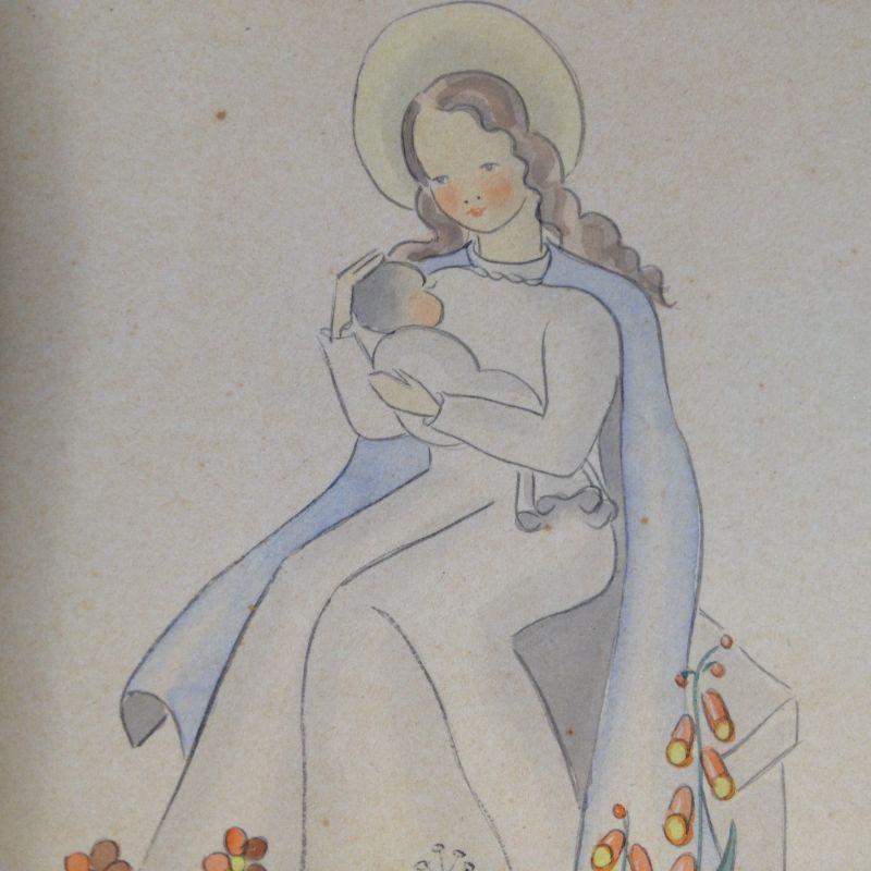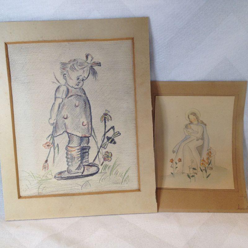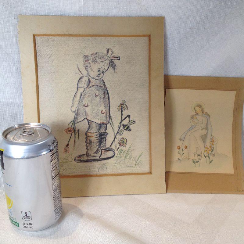 This auction lot is for a set of Hummel-Style Pictures. One is a color pencil sketch of a little girl with flowers, matted in a very old yellowed mat but it is signed on the back in German. The second is a "Madonna" style - could be a print - just cannot tell. It is, however, very nice!