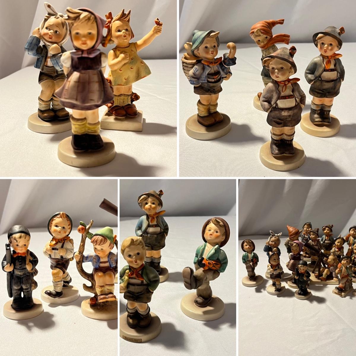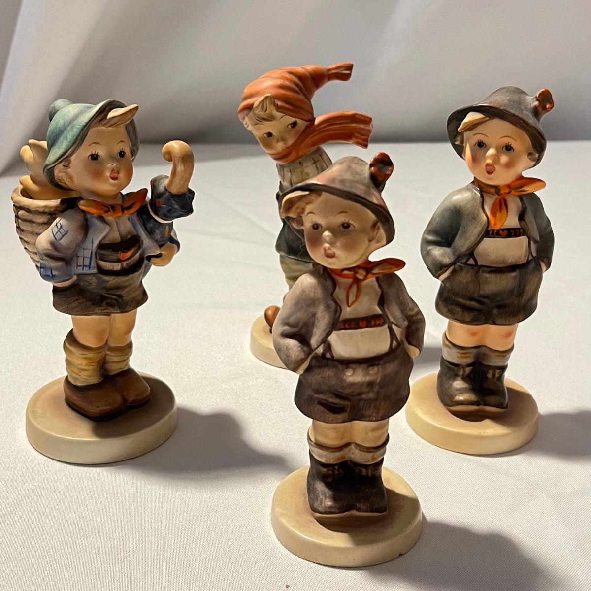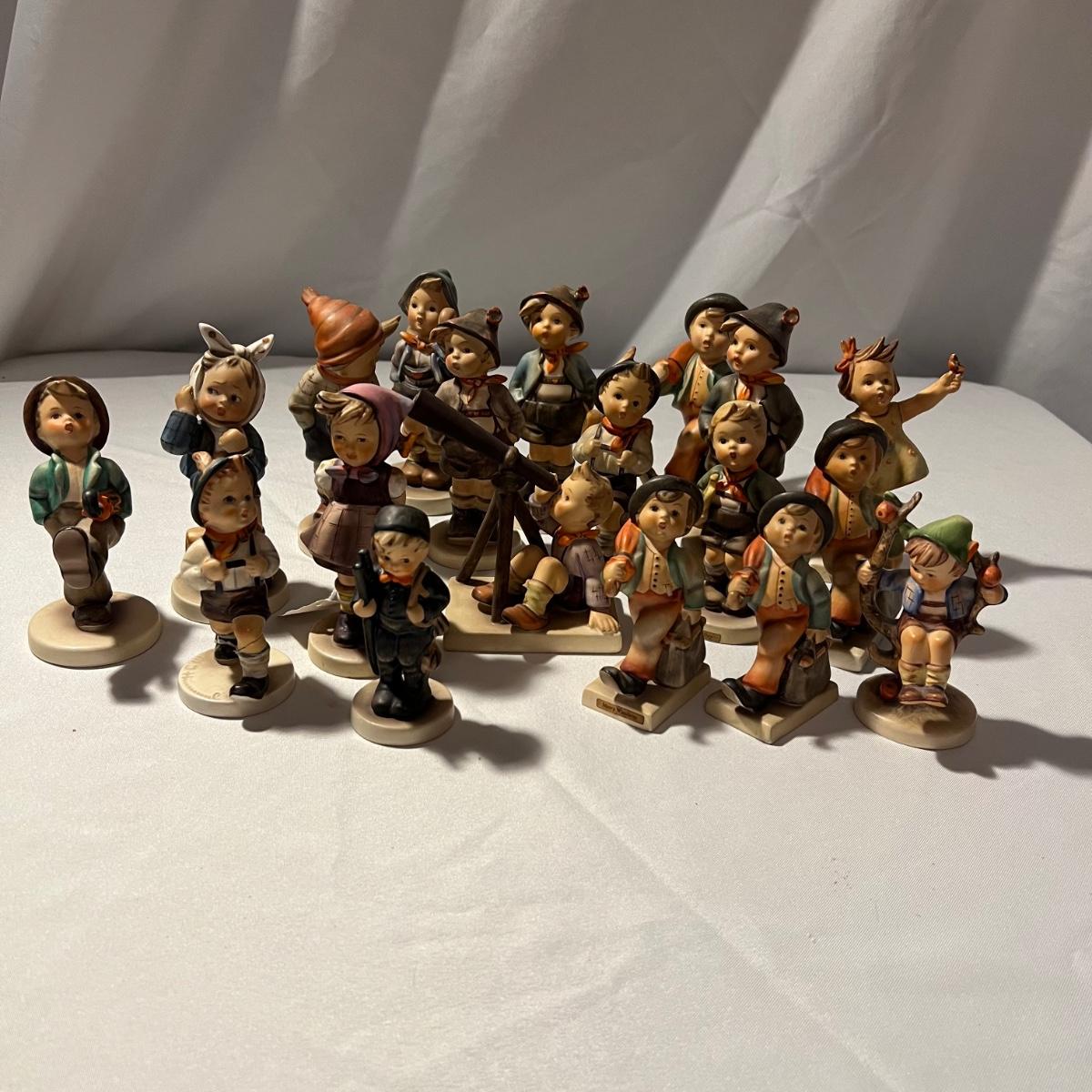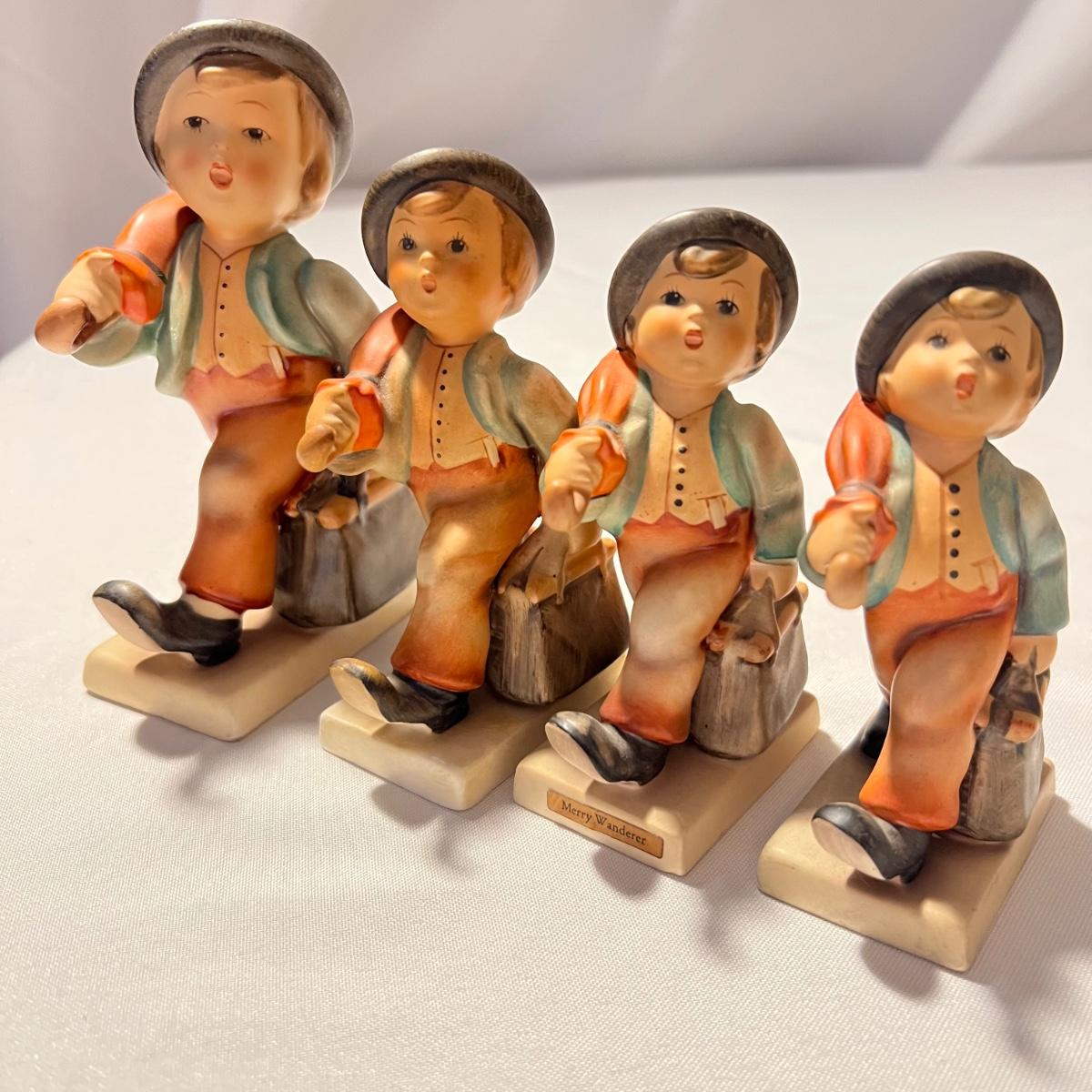 A collection of 19 Hummel figurines includes four Merry Wanderers, but in different sizes with the largest measuring 2” x 3” x 6”H. See photos for hallmarks and other information on all figurines.