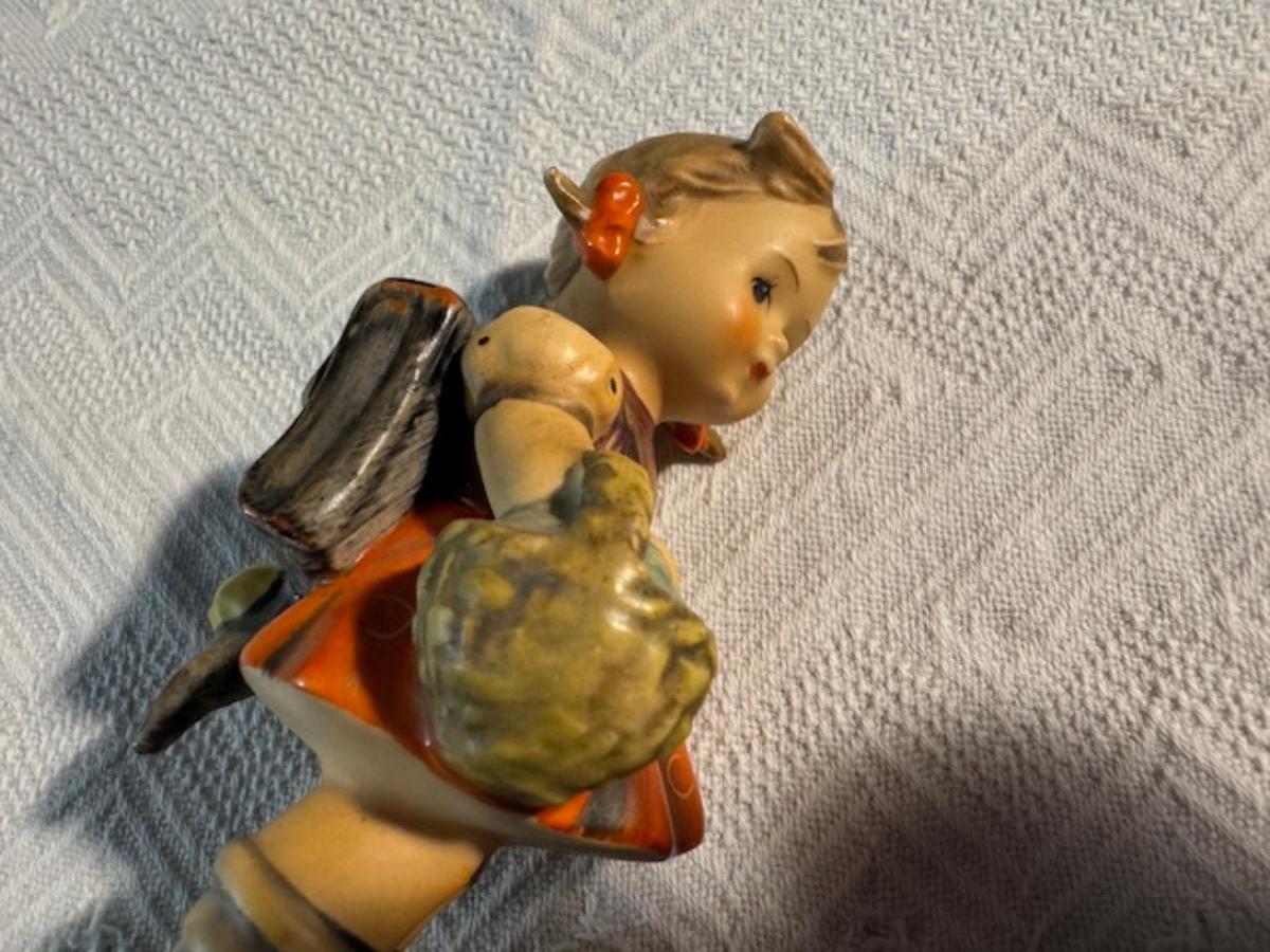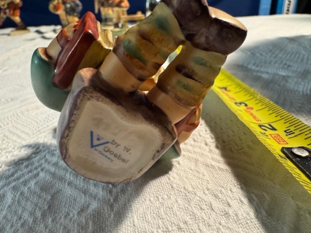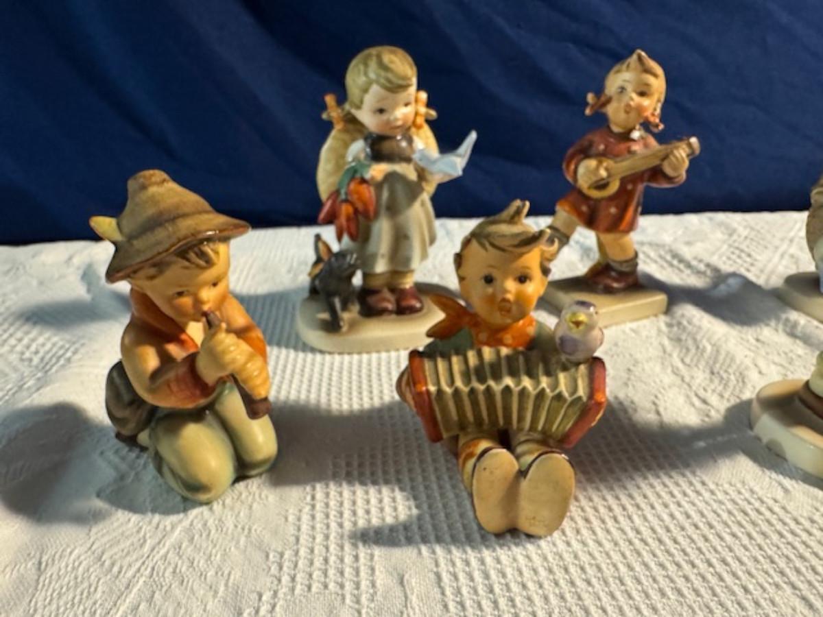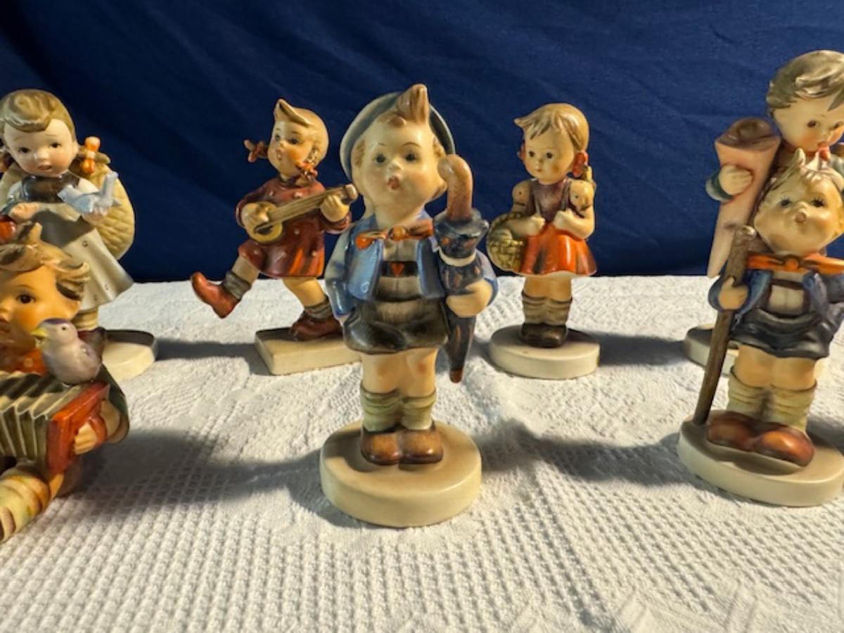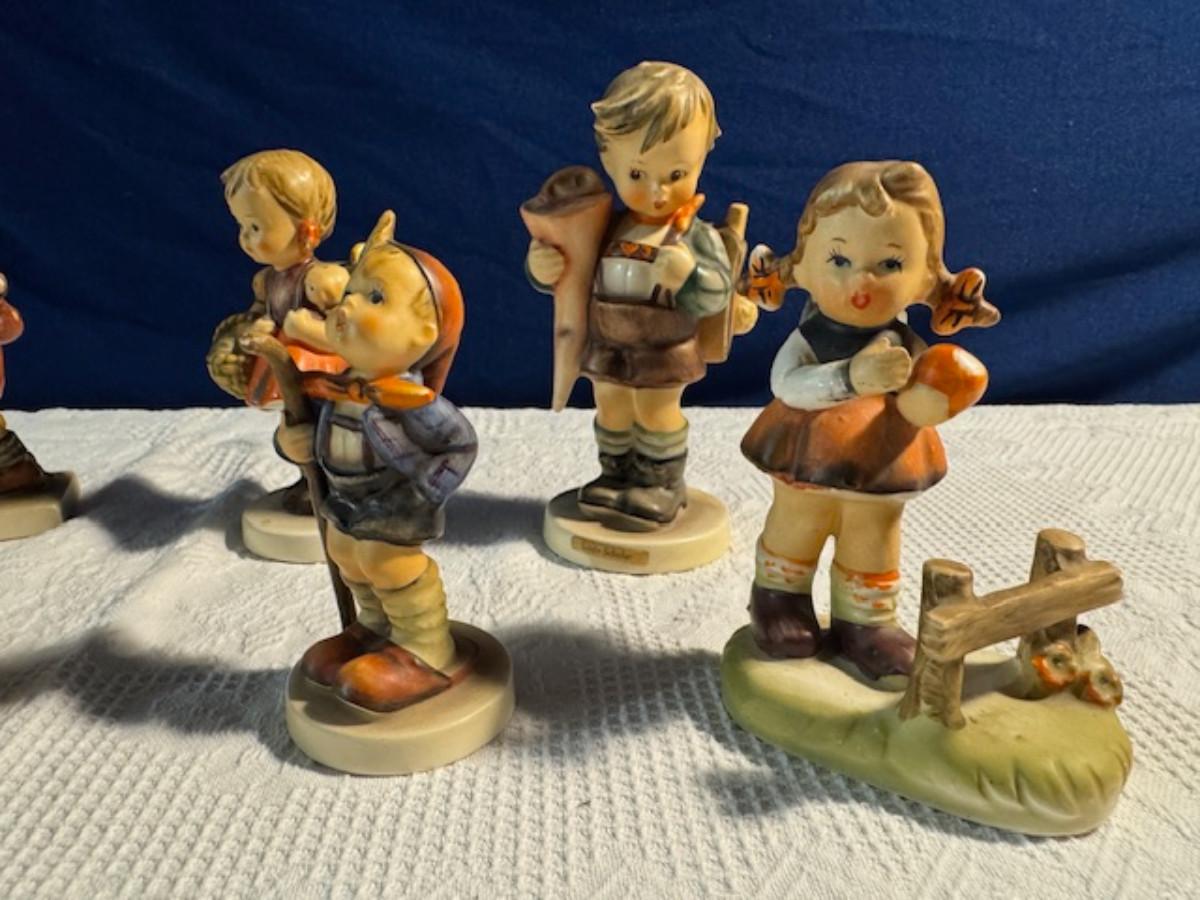 Little hiker 16 2/0 mark 3, School Girl 81 2/0 mark 3, Little Scholar 80 mark 3, Home From the Market 198 mark 4, Boy Playing Accordion Goebel, Little Tooter, Happiness 86 - as is, neck has been glued back on.