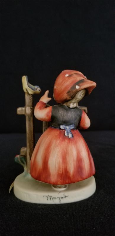 This Hummel stands 4" tall and weighs 3.5 oz. On the bottom it is incised with a number and stamped in blue with a V and bumblebee and the 3 lines next to it. Marking identifies this piece as produced between 1960-1974.