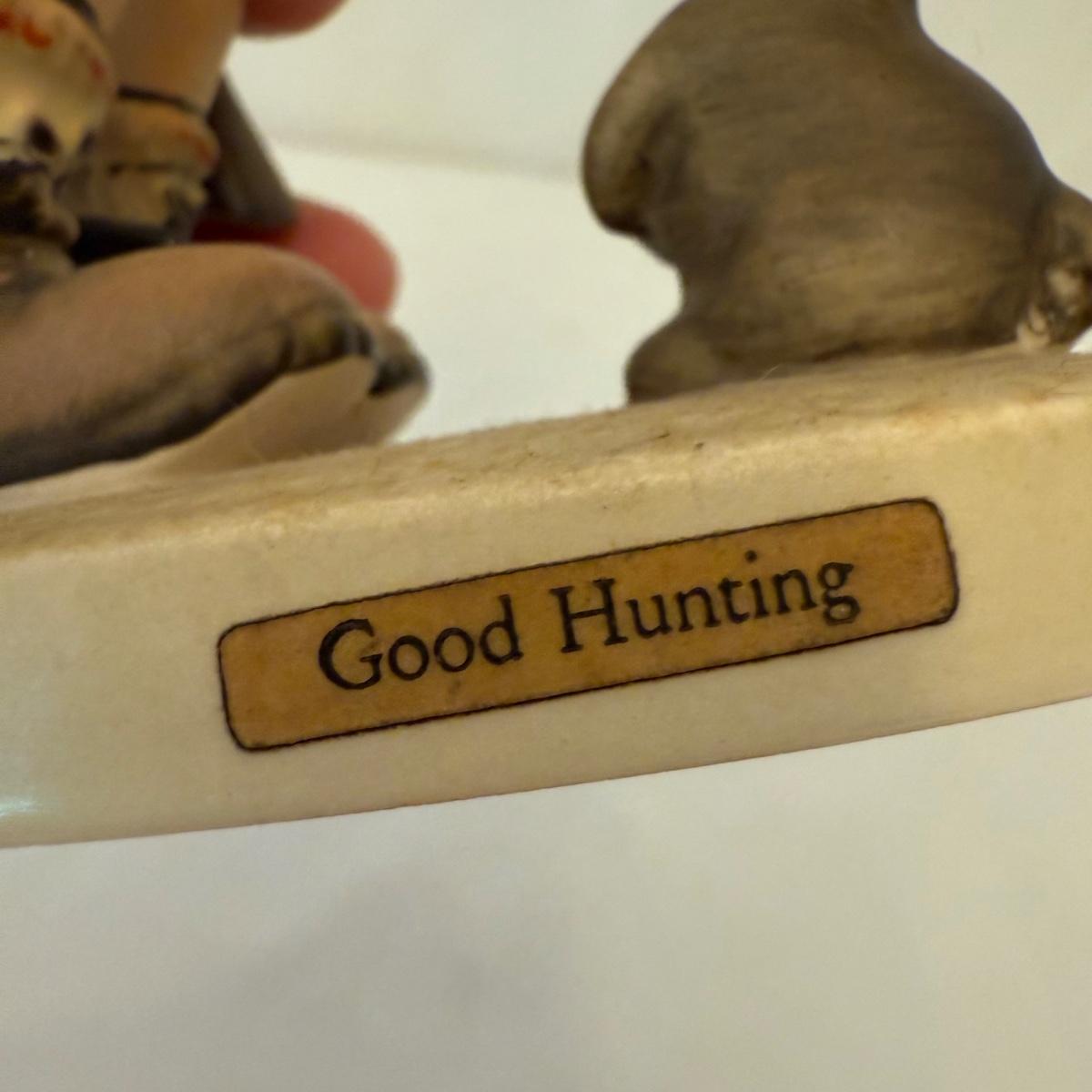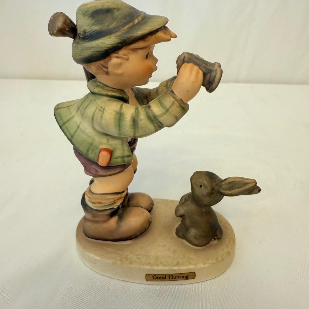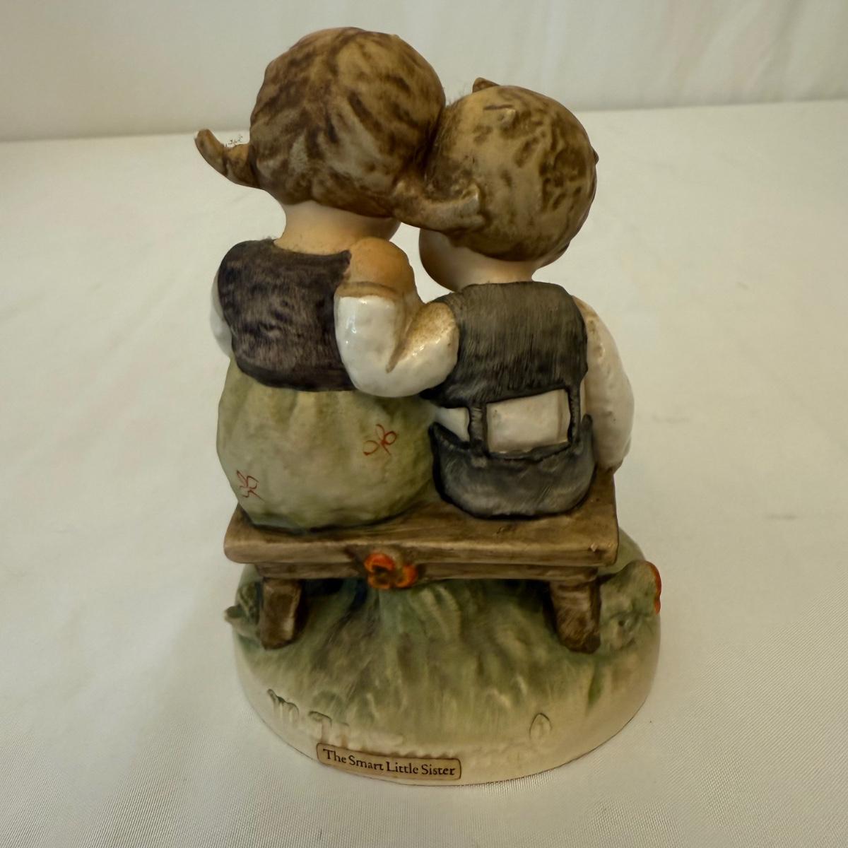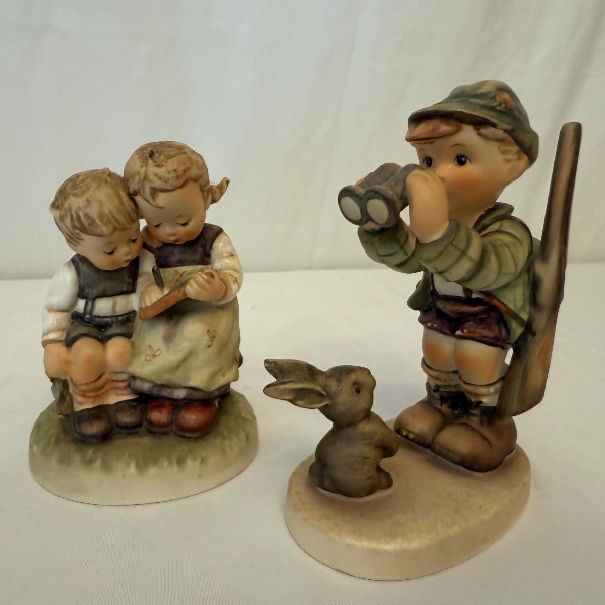 Two porcelain Hummel figurines. The Smart Little Sister is 3.25” x 3” x 4.5”H. Good Hunting is 3.5” x 2.25” x 5”H. Both are a little dusty but otherwise appear to be in good condition.