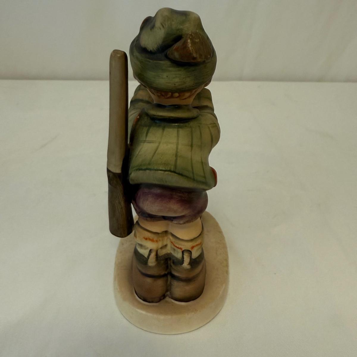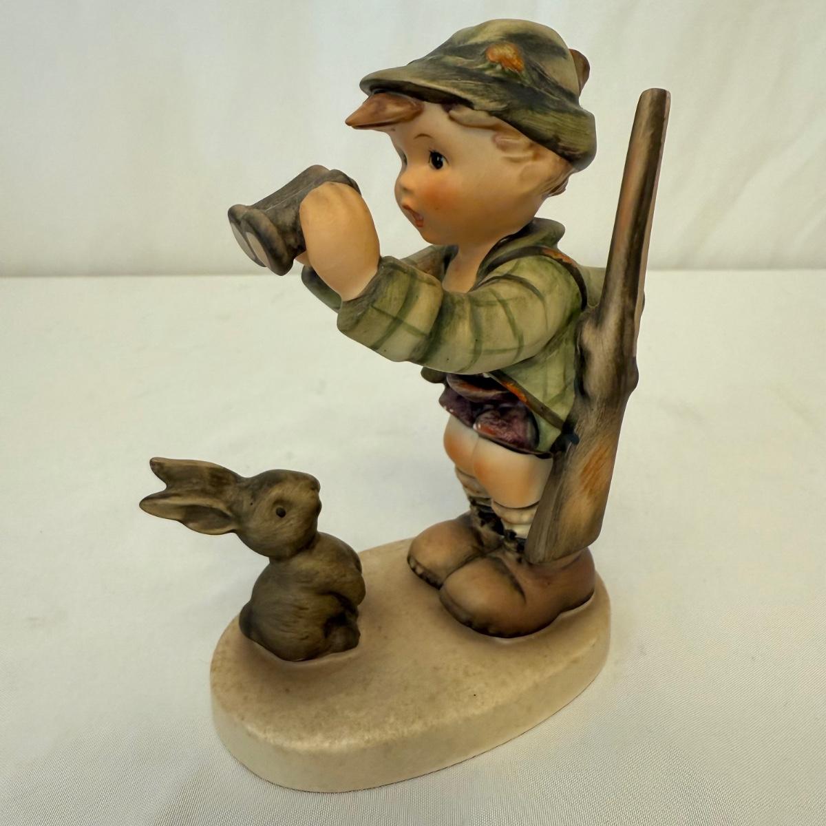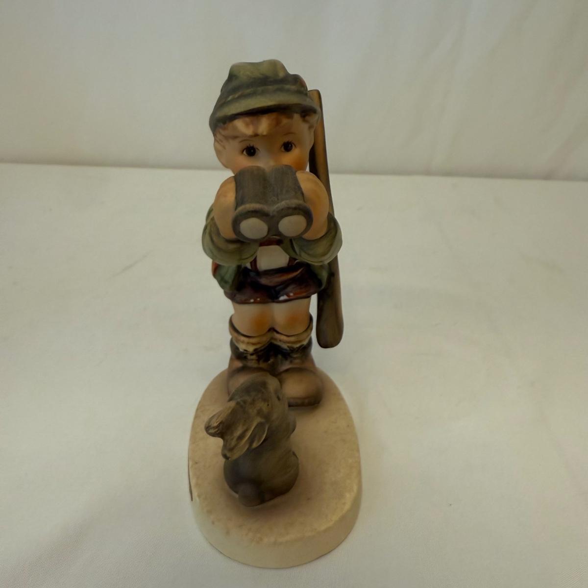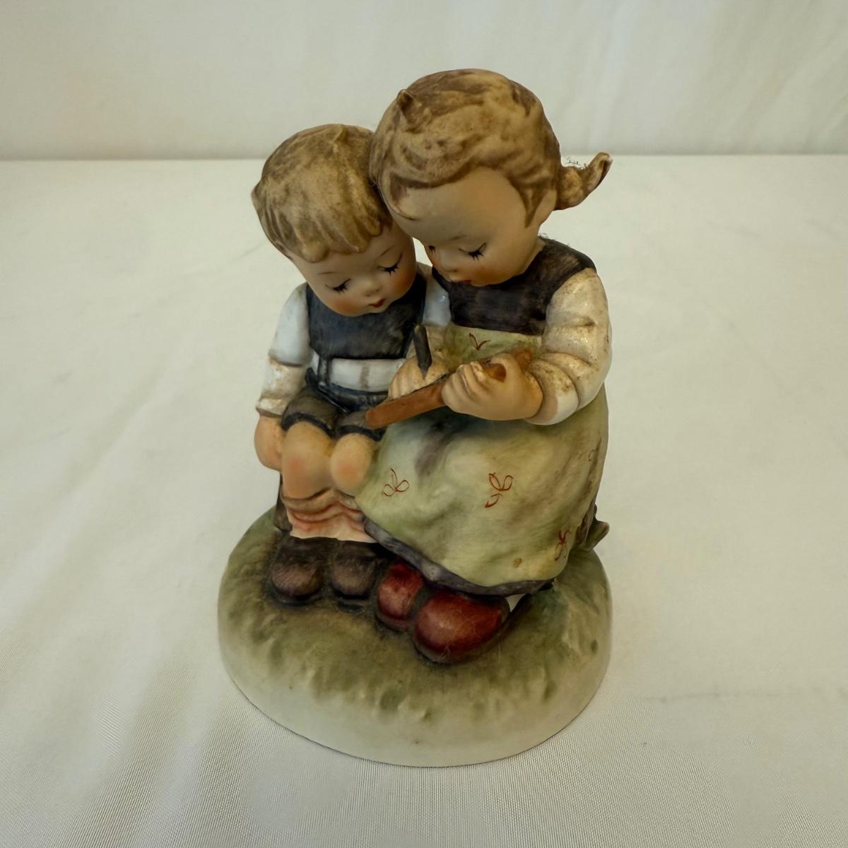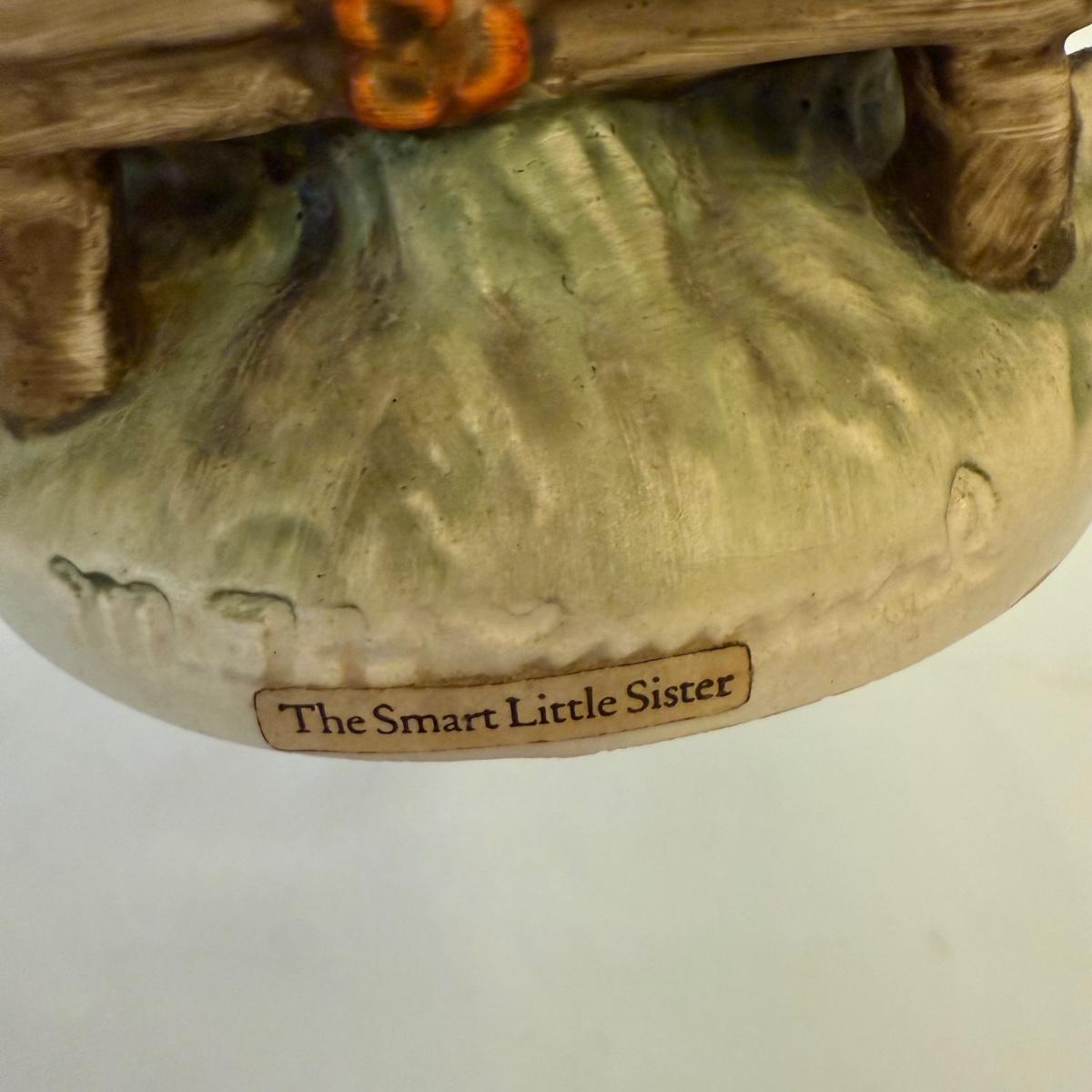 Two porcelain Hummel figurines. The Smart Little Sister is 3.25” x 3” x 4.5”H. Good Hunting is 3.5” x 2.25” x 5”H. Both are a little dusty but otherwise appear to be in good condition.