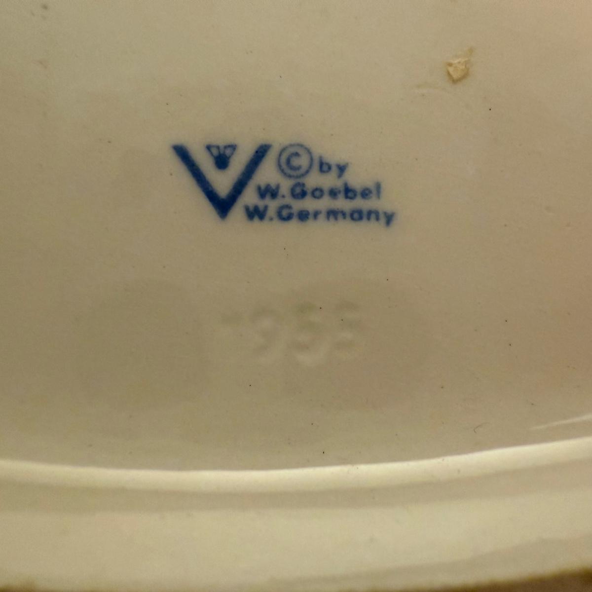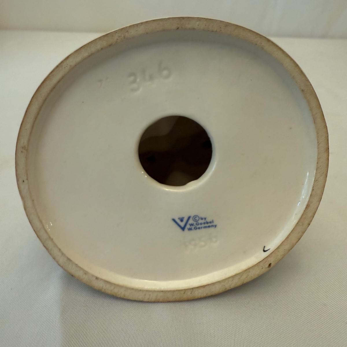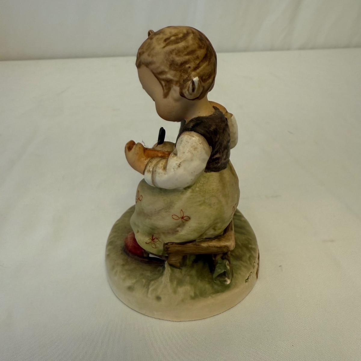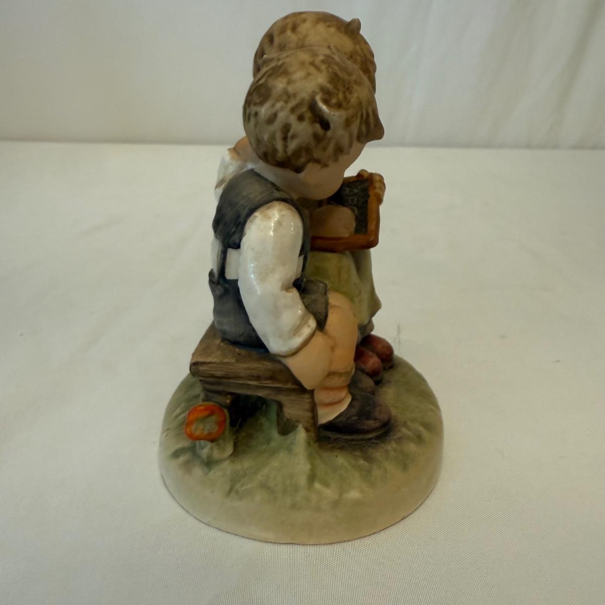 Two porcelain Hummel figurines. The Smart Little Sister is 3.25” x 3” x 4.5”H. Good Hunting is 3.5” x 2.25” x 5”H. Both are a little dusty but otherwise appear to be in good condition.