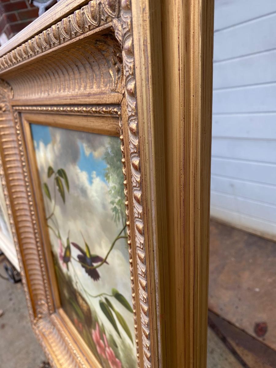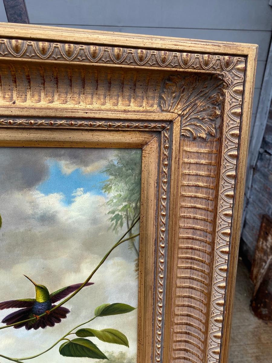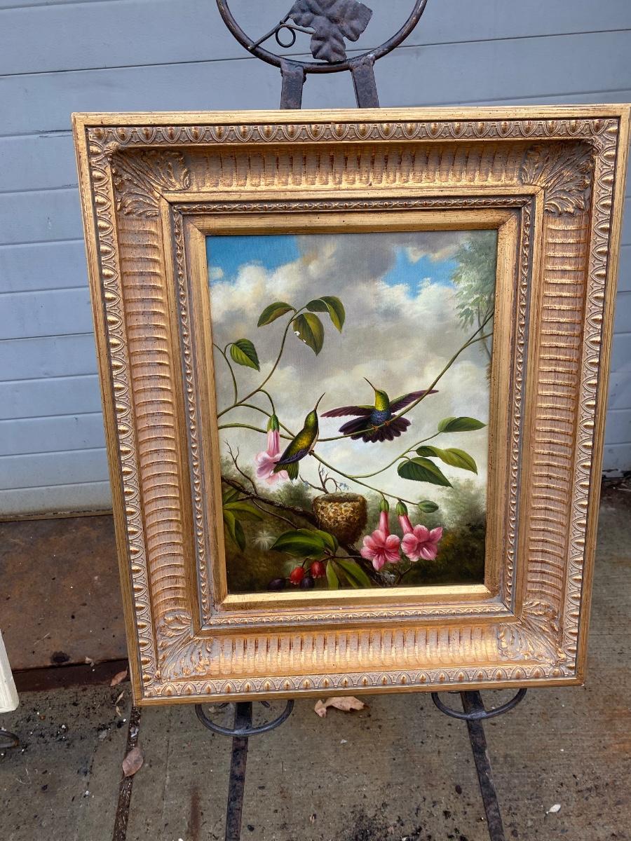 Gold framed painting of hummingbirds at the nest. Some wear on paint as shown in photo, but still a sweet painting. 20 x 24