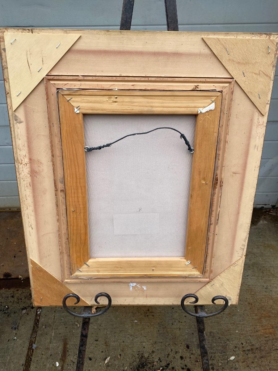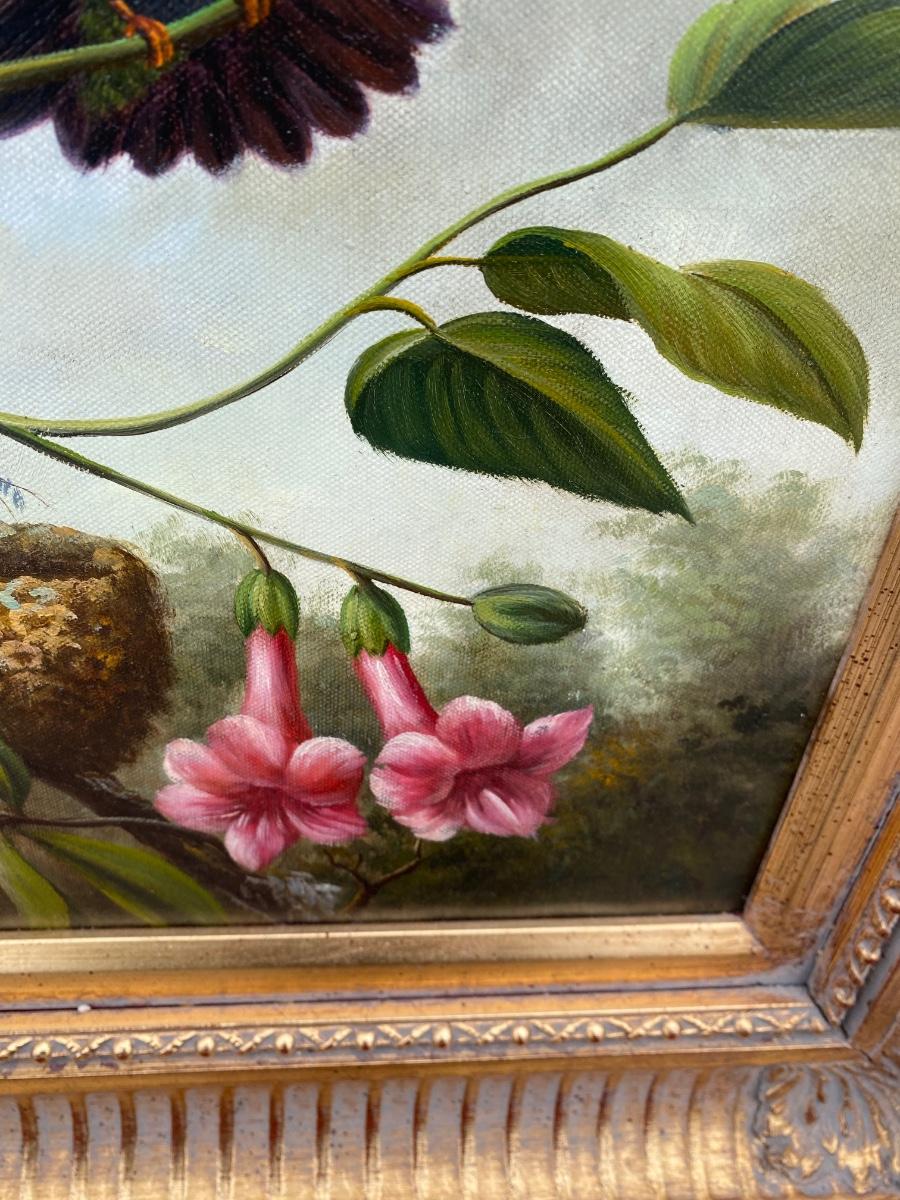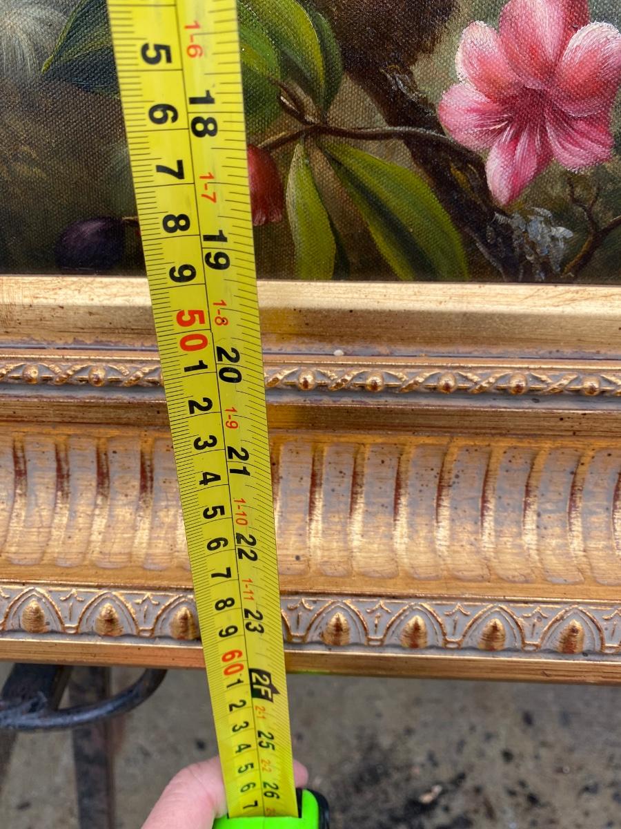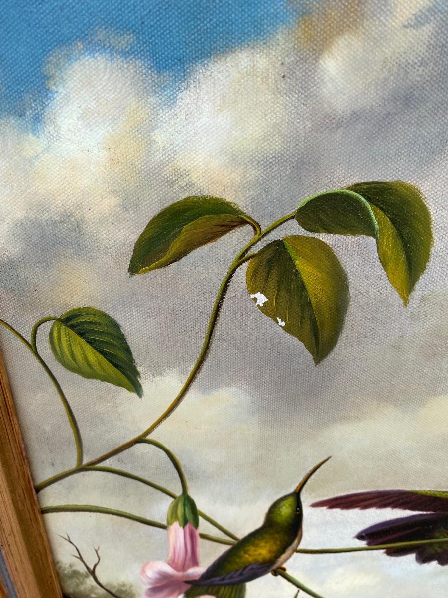 Gold framed painting of hummingbirds at the nest. Some wear on paint as shown in photo, but still a sweet painting. 20 x 24