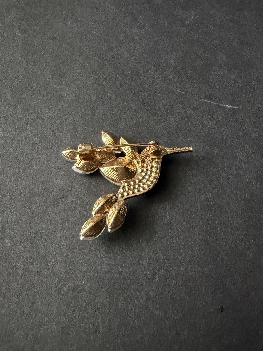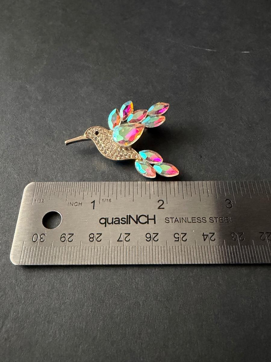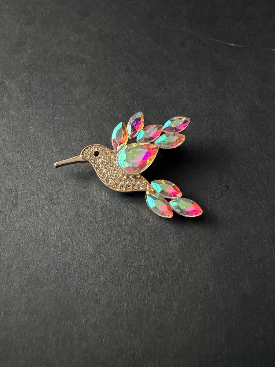 hummingbird brooch featuring aurora borealis type rhinestones in a silver-tone