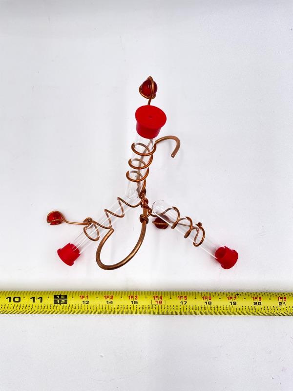 Hummingbird feeder with three tubes and copper-colored metal.