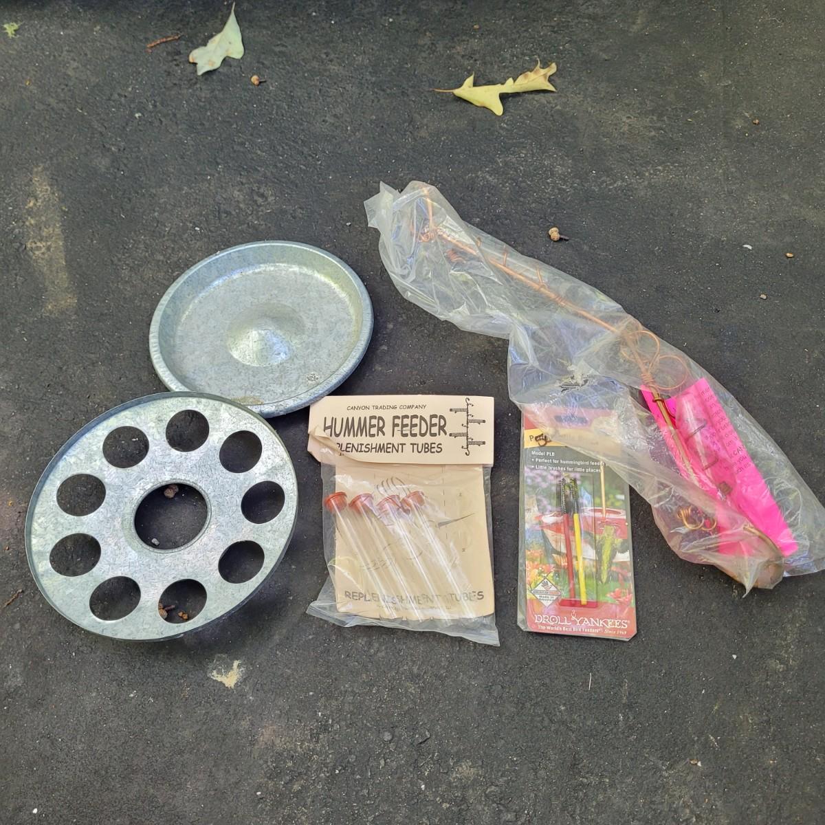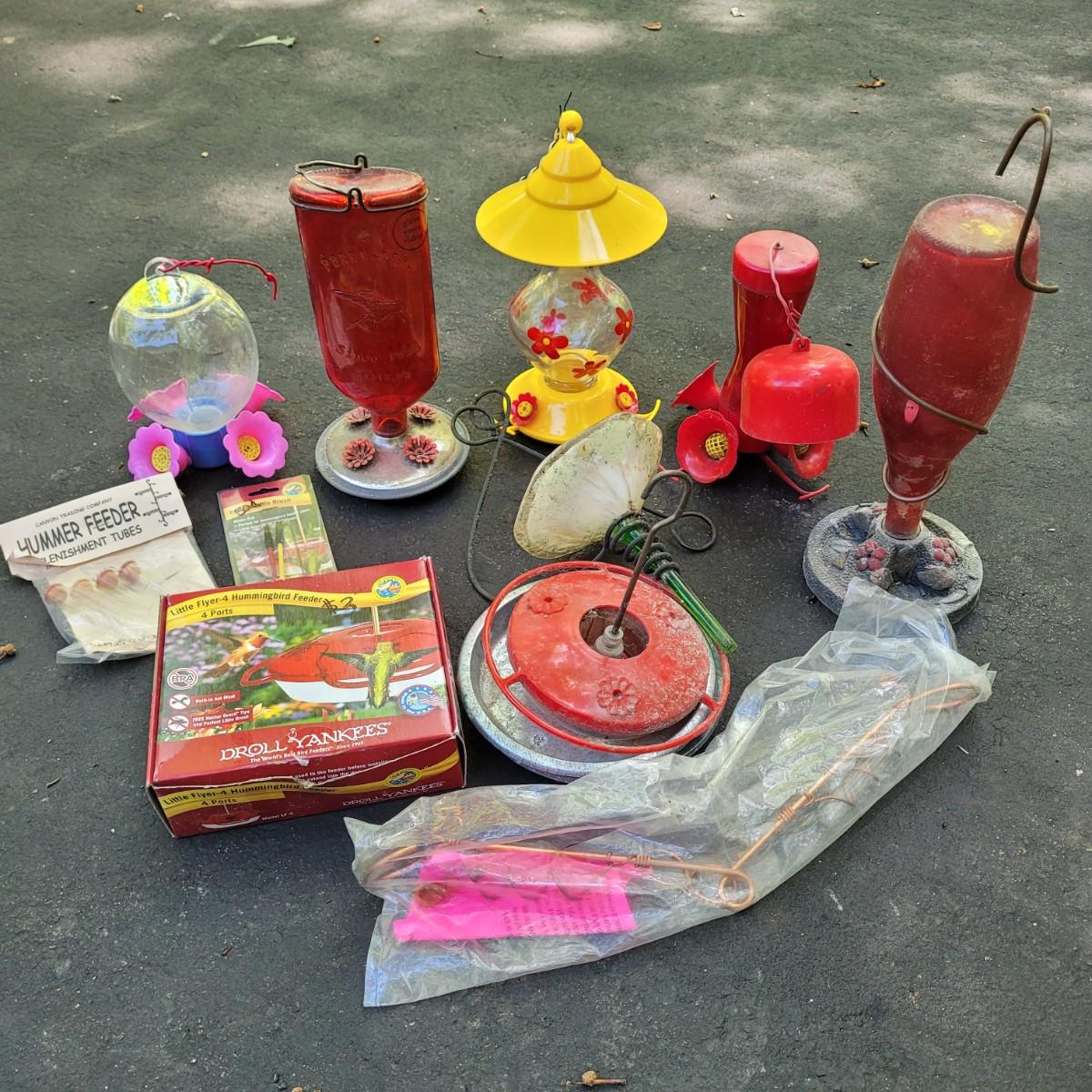 This lot includes eight hummingbird feeders and a variety of accessories. The feeders are mostly unique with one repeat. Some are made from glass, while others are made from plastic. See photos. Accessories include refill tubes, a metal hanger, and seed trays.