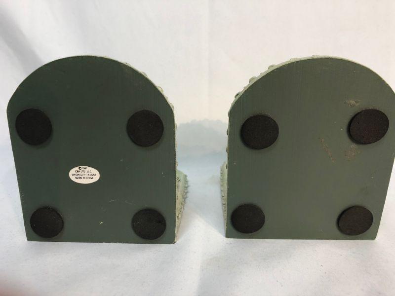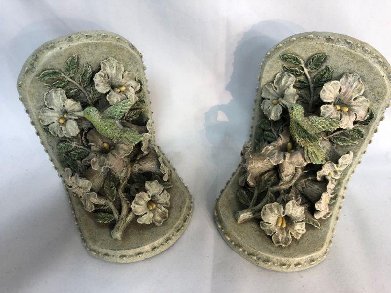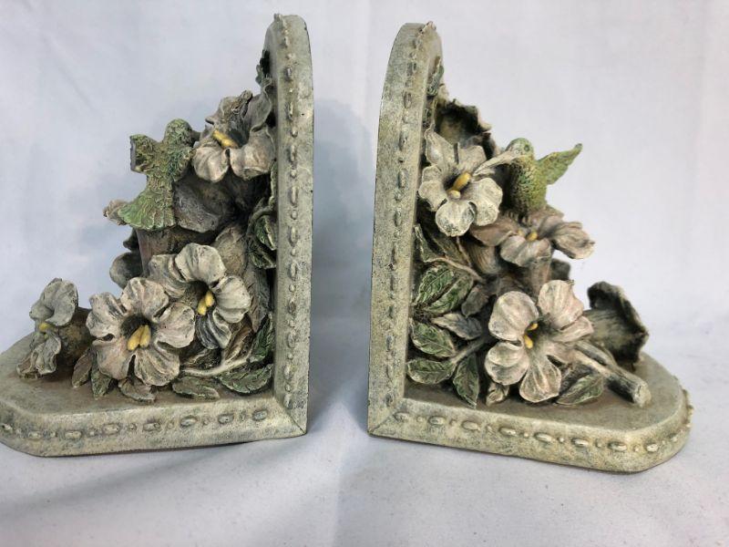 Pair of hummingbird & flower bookends. Heavy, feel like they might be made of plaster. Did not notice any chips.