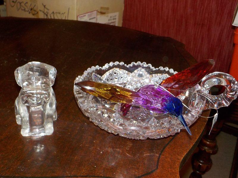 Puppy is glass art & Hummingbird with stunning cut glass candy dish.