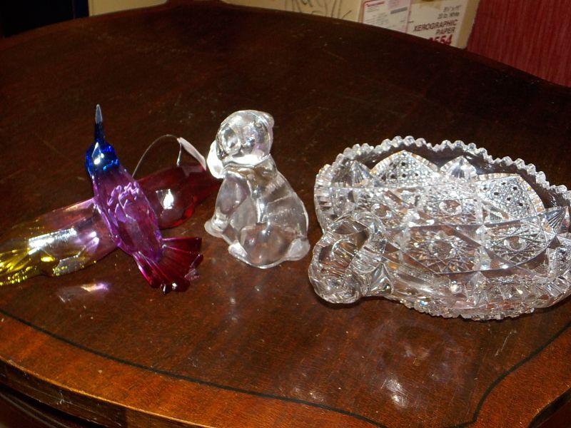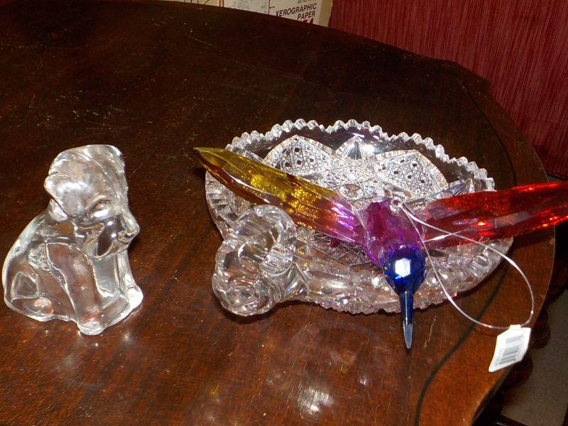 Hummingbird Mini Glass Art, cut glass candy dish and crystal glass puppy.