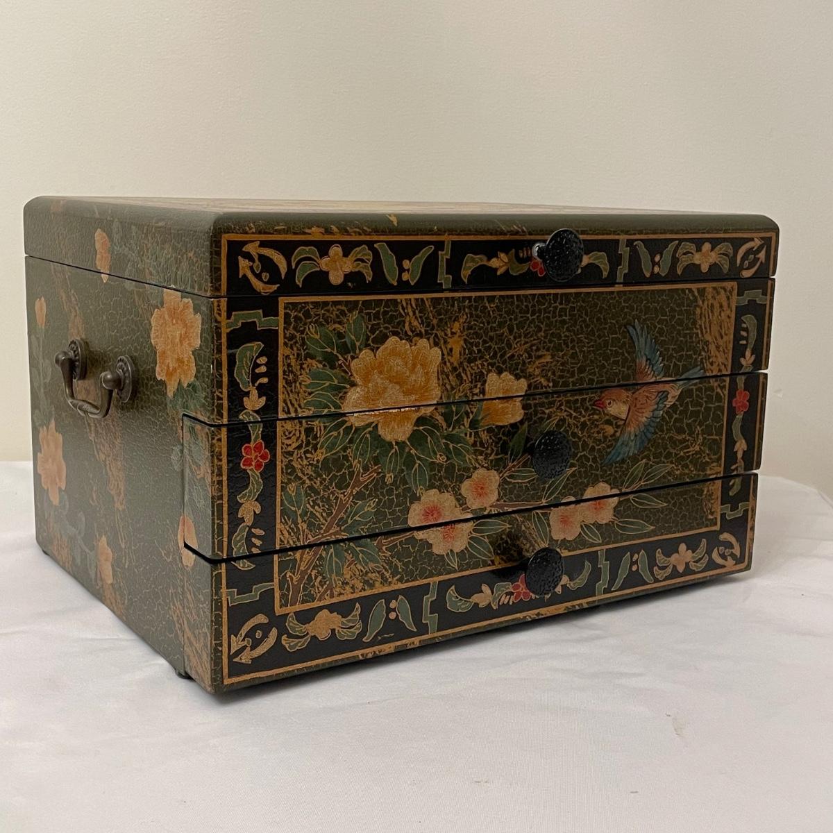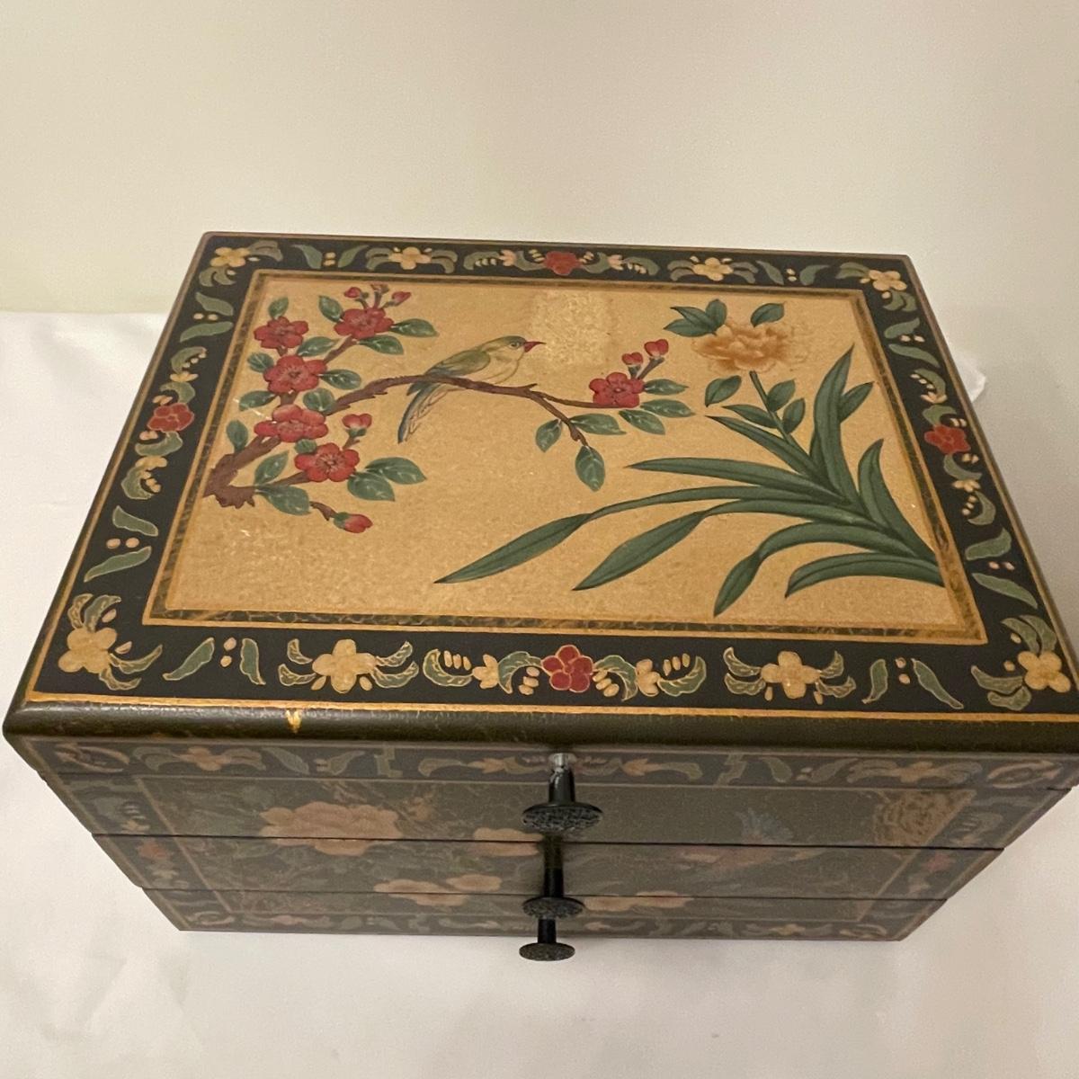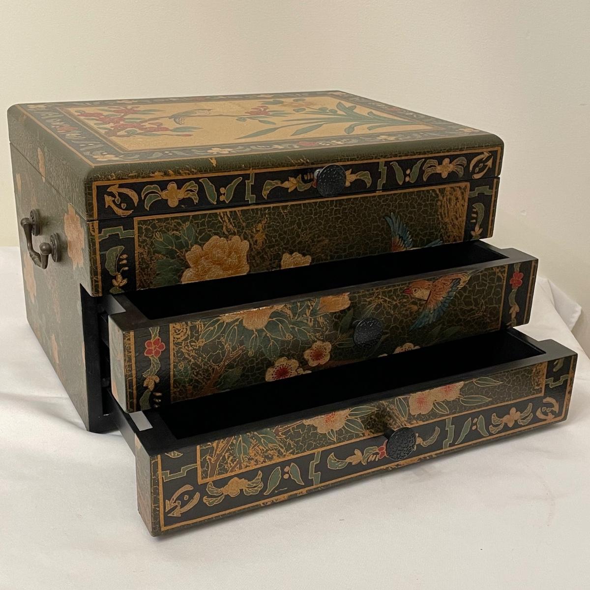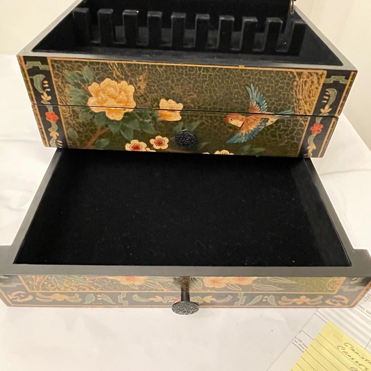 This beautiful silverware storage case has 2 tarnish resistant lined drawers that are each 1.75” high and approximately 10” deep; bottom one is flat for larger utensils and the top one has been compartmentalized as has the top lined section under the lid which has 9 slots to hold knives, forks and spoons. It has a crackle finish in its painted design and metal hardware. It comes with its original sales receipt and an extra knob. There are a few minor runs/marks and a small discolored area on the lid shown in images.