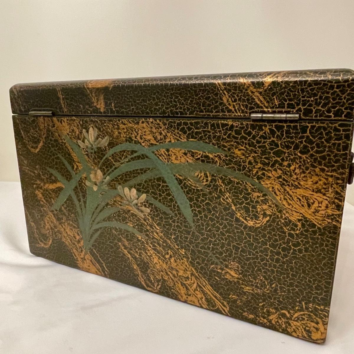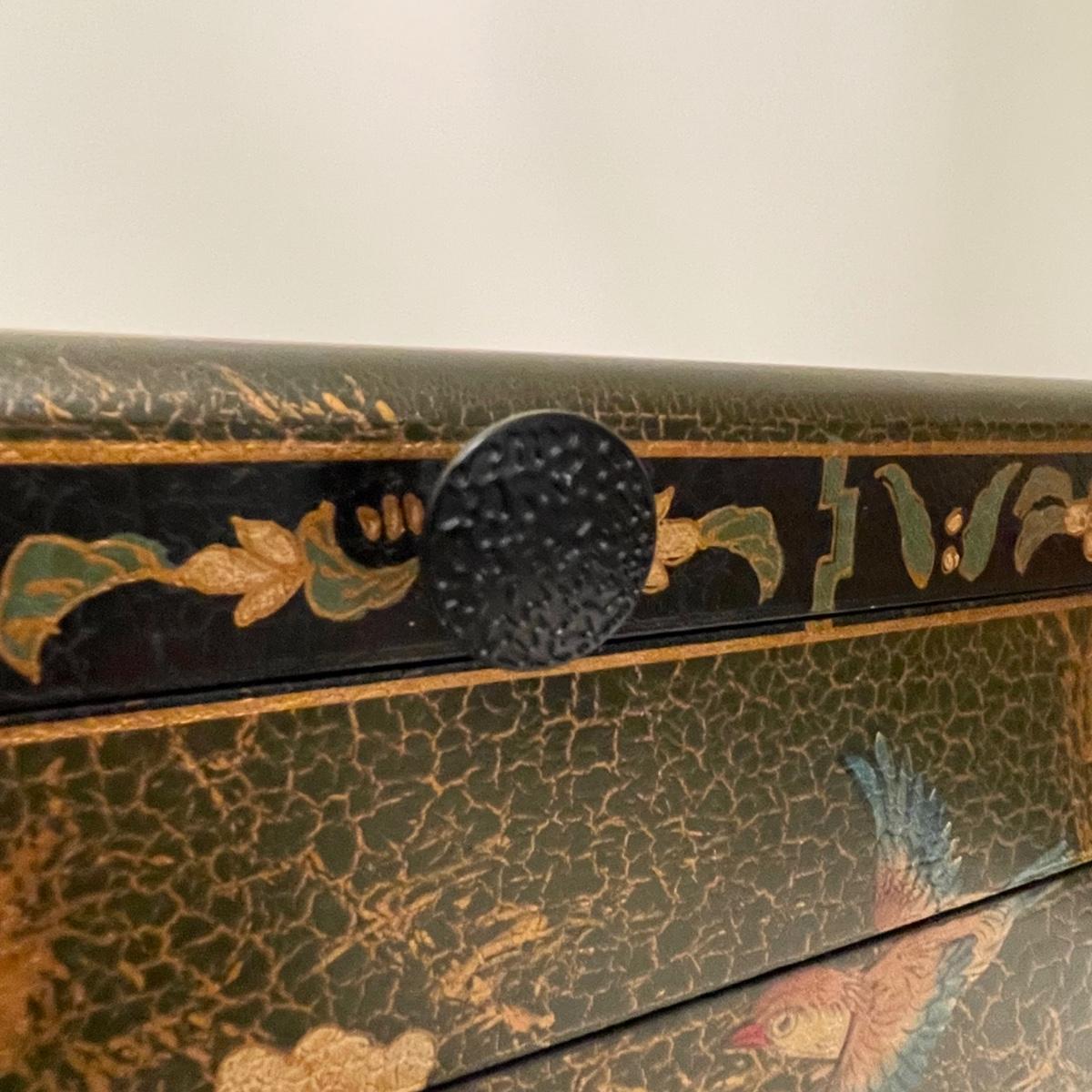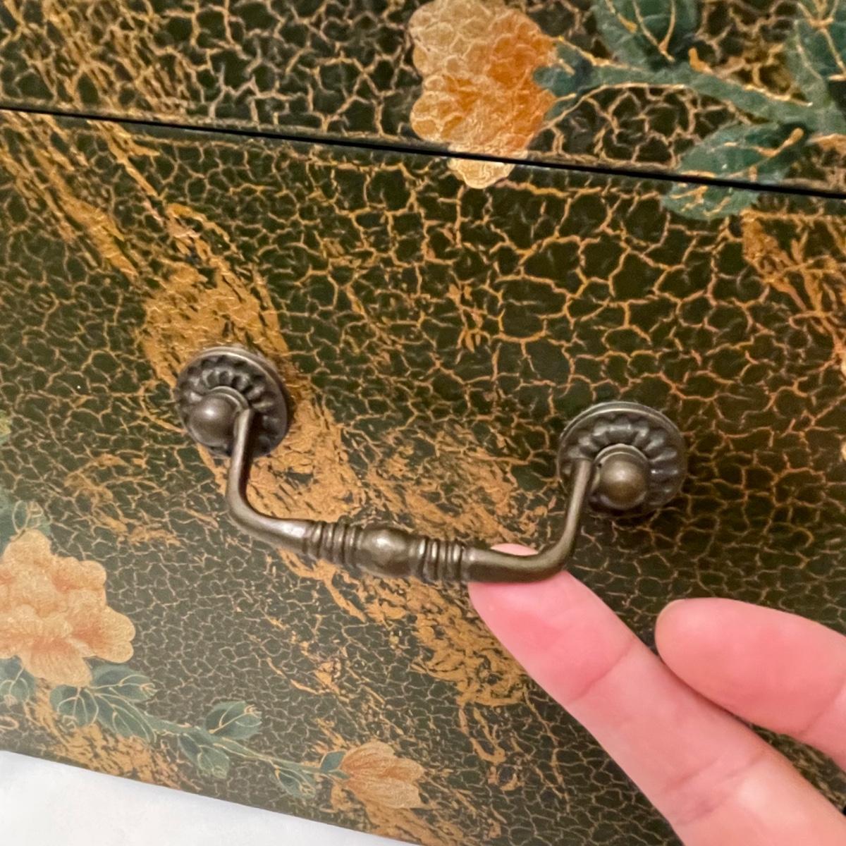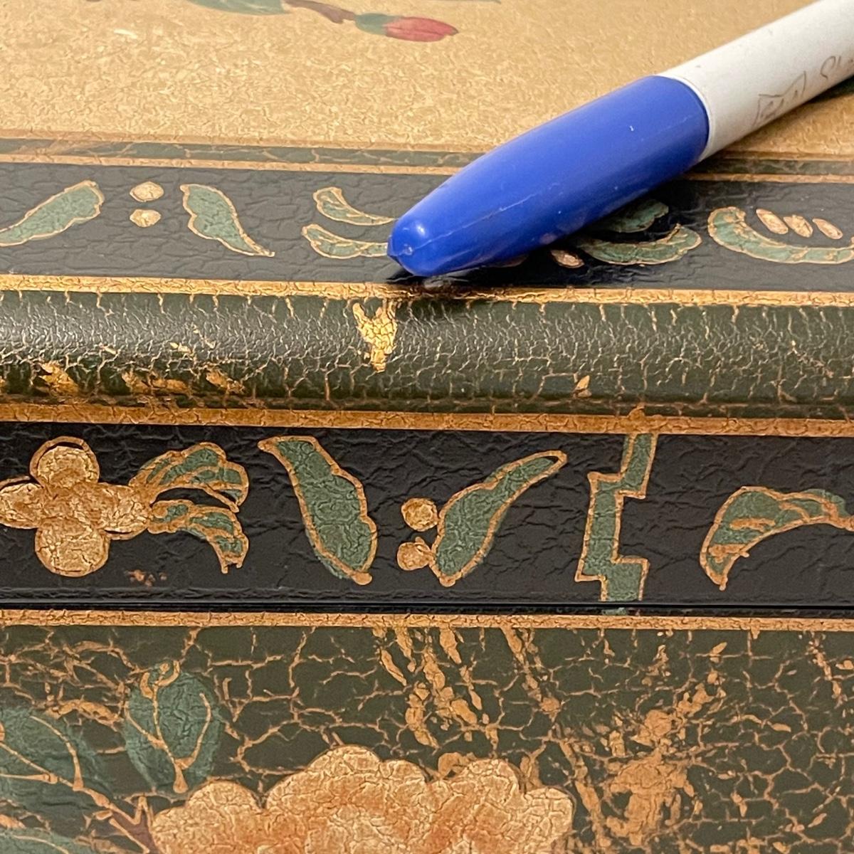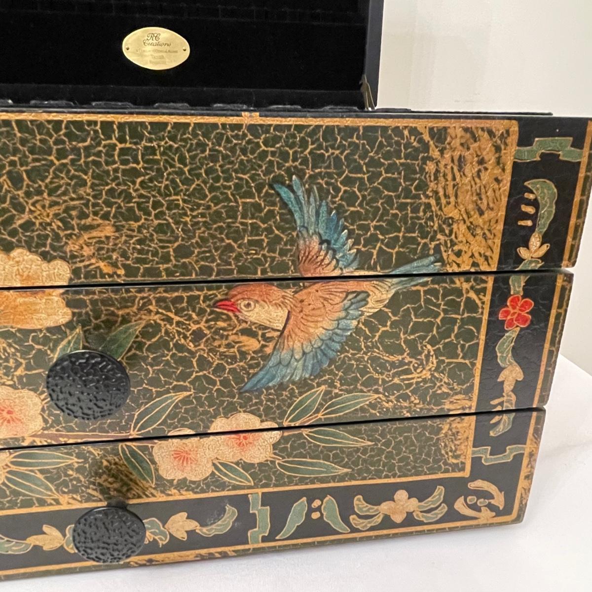 This beautiful silverware storage case has 2 tarnish resistant lined drawers that are each 1.75” high and approximately 10” deep; bottom one is flat for larger utensils and the top one has been compartmentalized as has the top lined section under the lid which has 9 slots to hold knives, forks and spoons. It has a crackle finish in its painted design and metal hardware. It comes with its original sales receipt and an extra knob. There are a few minor runs/marks and a small discolored area on the lid shown in images.